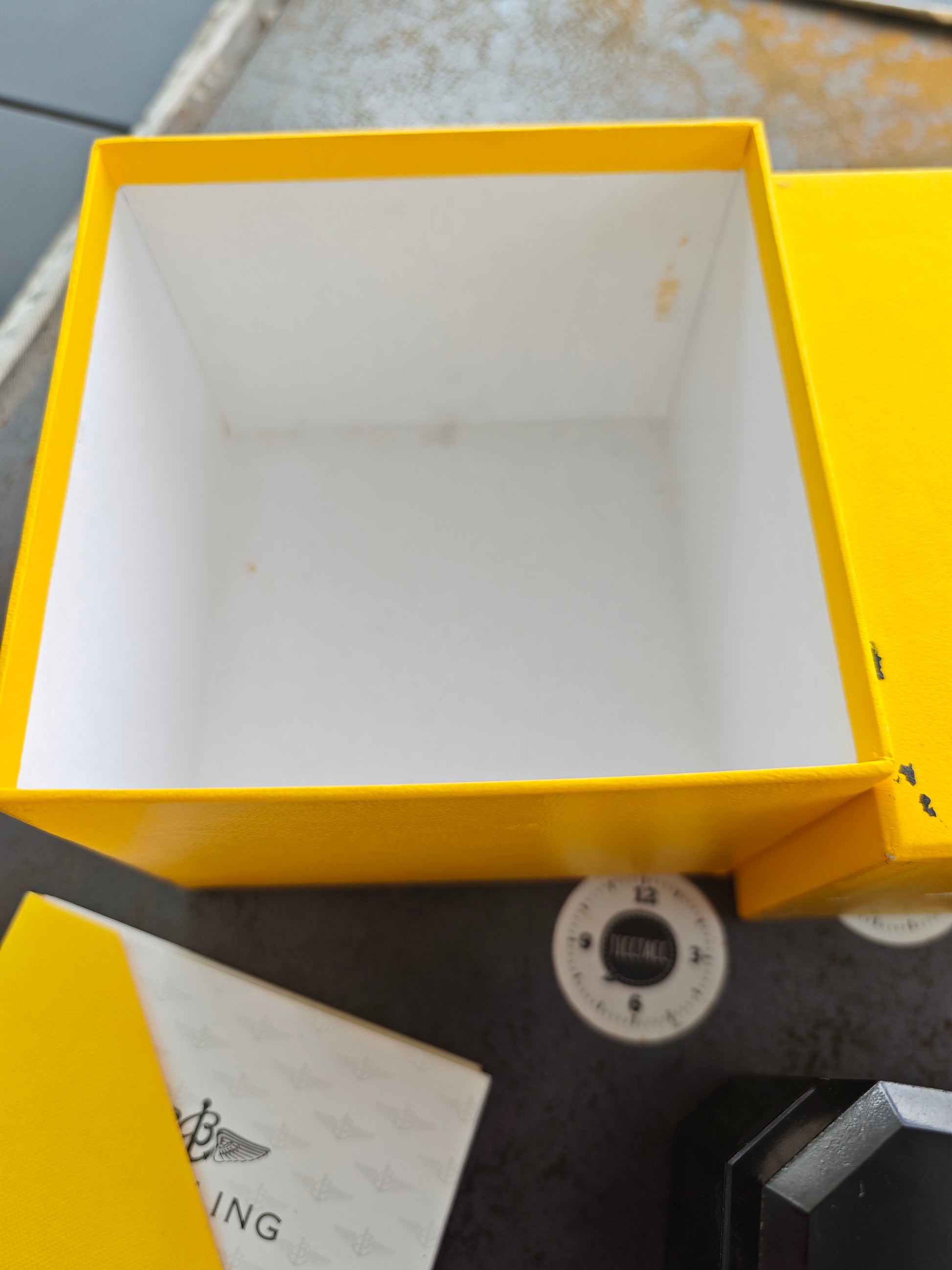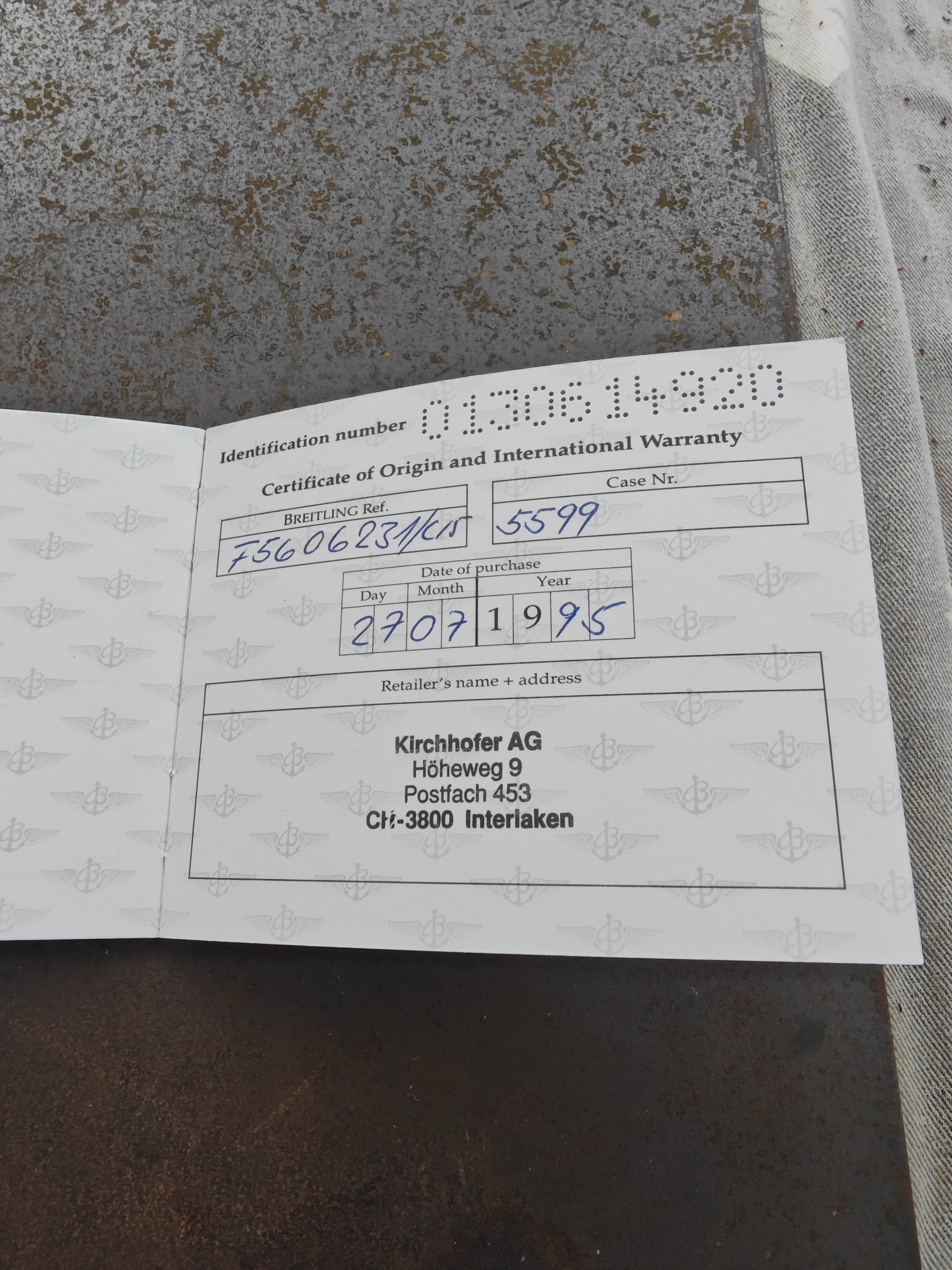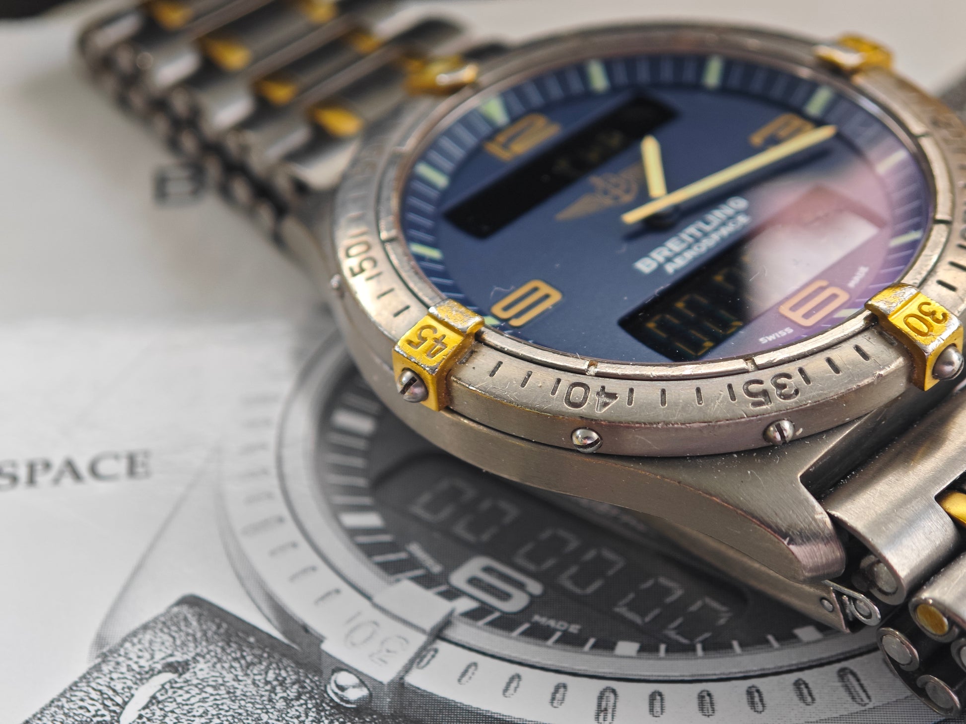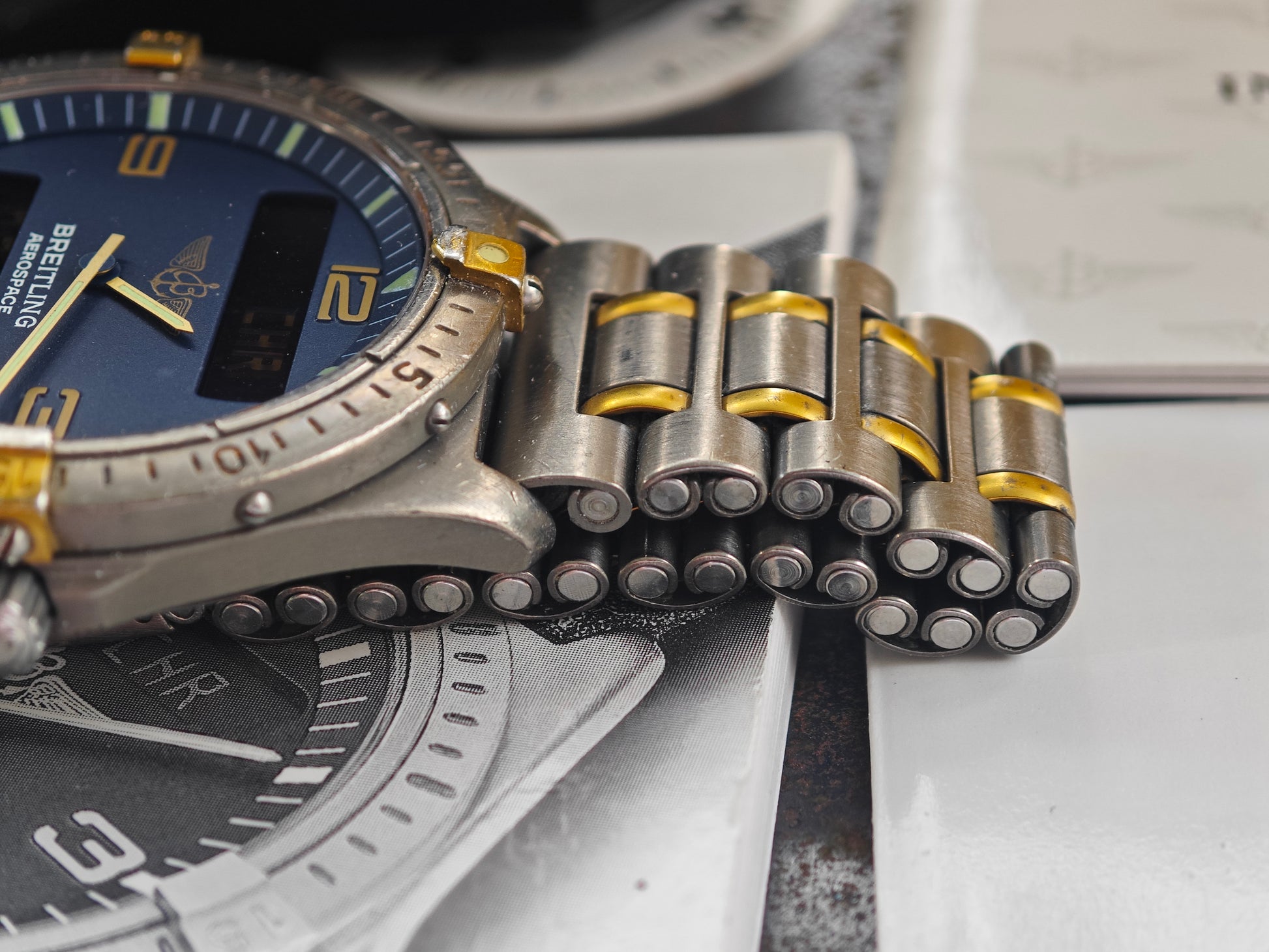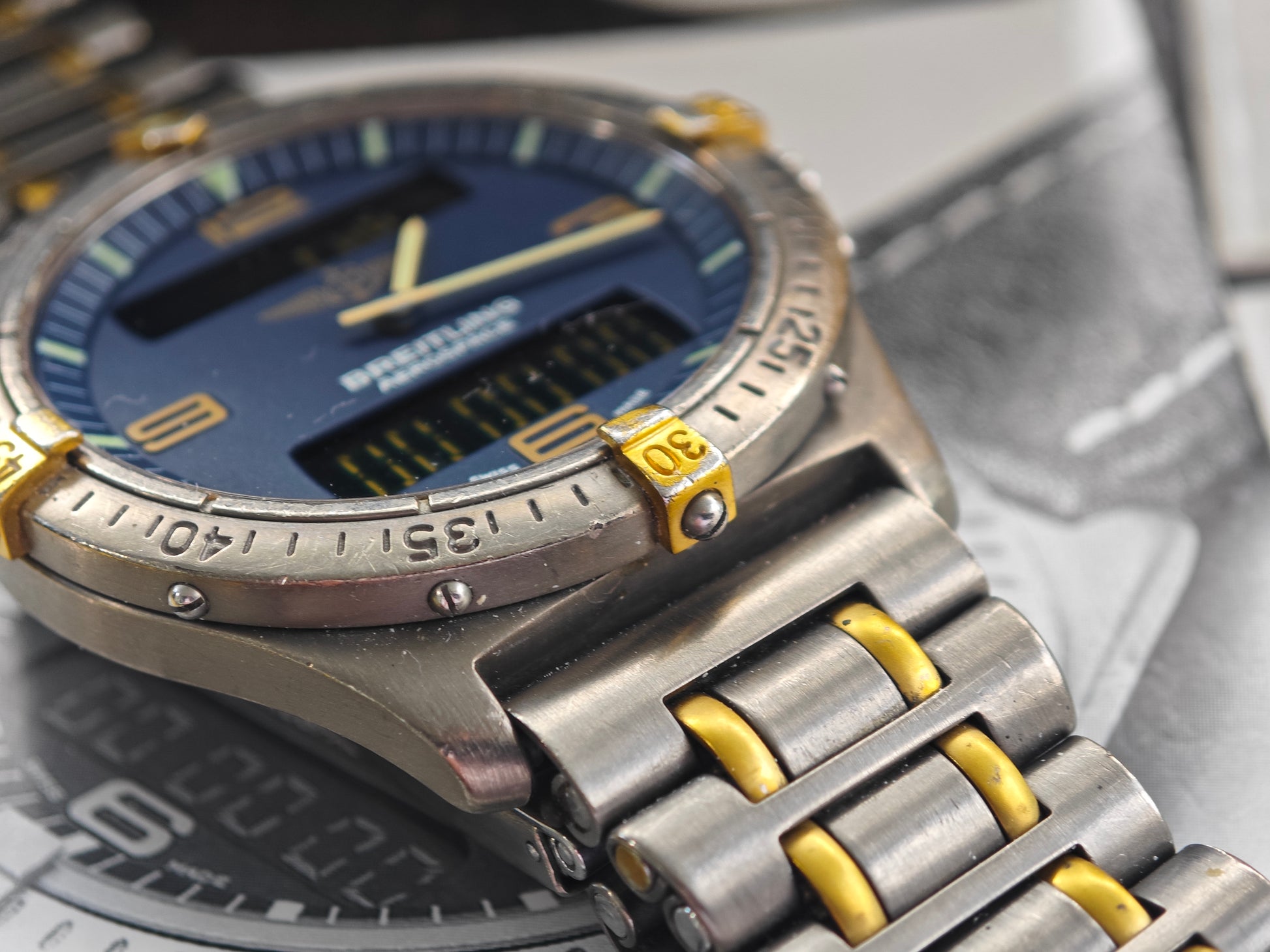Sehr begehrtes Breitling Aerospace F56062 Bicolor-Komplettset mit blauem Zifferblatt. Die Uhr ist in gutem Zustand mit Gebrauchsspuren an Gehäuse, Lünette und Armband. Das Originalarmband der Uhr hat eine Gesamtarmbandlänge von 20,5 cm (!). Also mehr als die Fabriklänge. Die Uhr wird als Komplettset mit Box und teurer schwarzer Backelite-Innenbox, Handbuch, Garantiekarte (ausgestellt 1995 in der Schweiz), Händlerliste und Papierhalter geliefert, damit die Papiere funktionieren. Die Uhr ist voll funktionsfähig, mit deutlich hörbarem Ton bei Alarm, Chrono und Timer-Funktion. Eine gute Uhr für den Alltag.