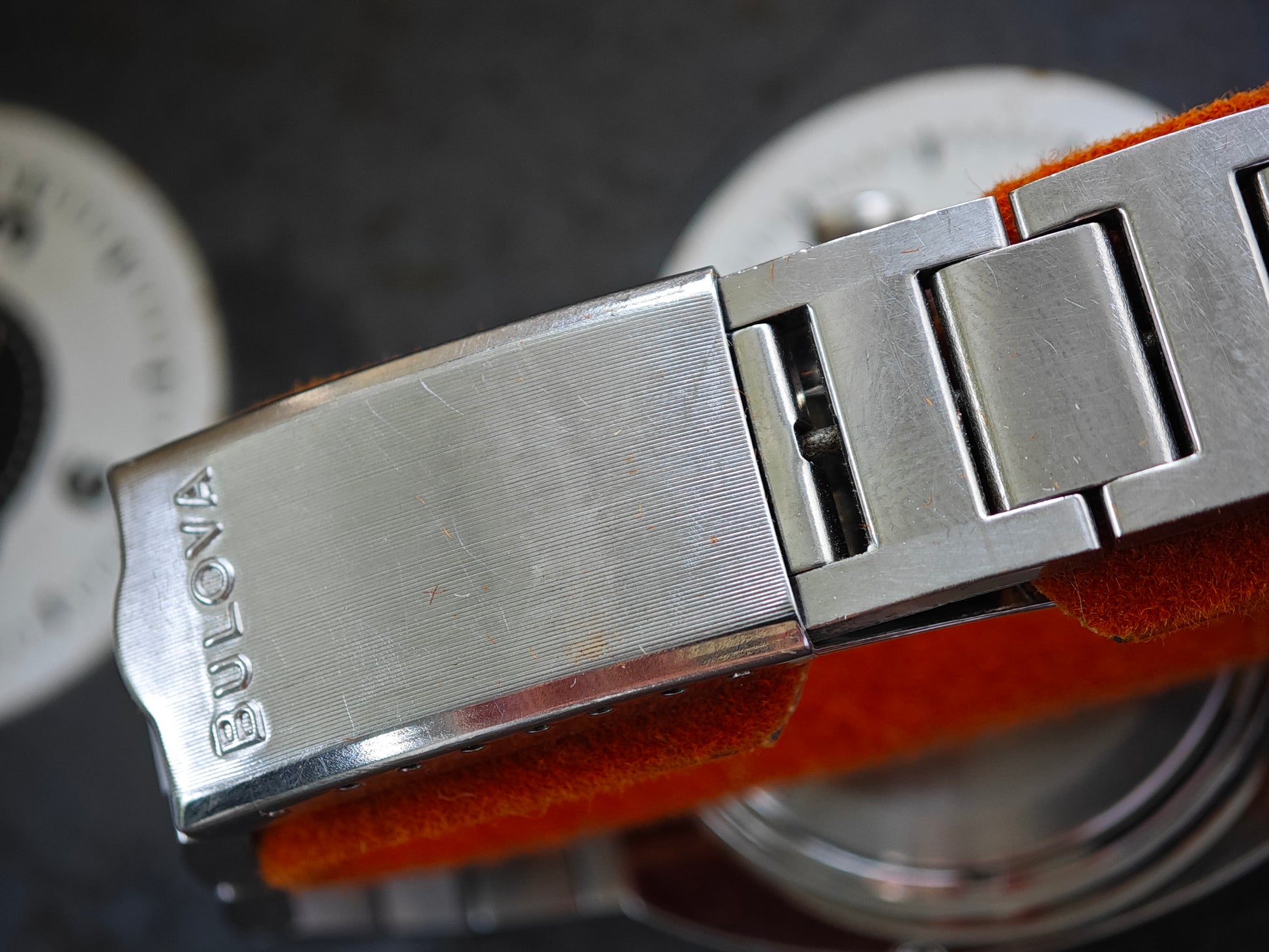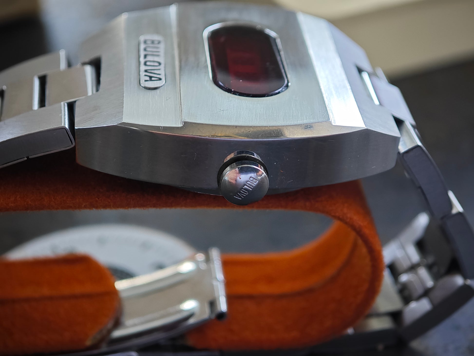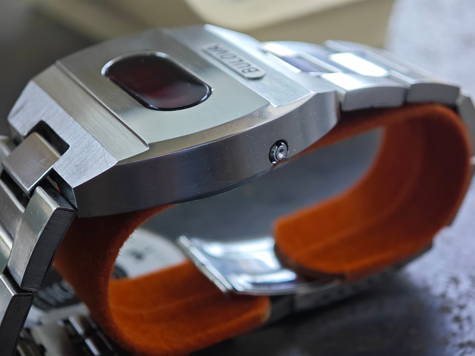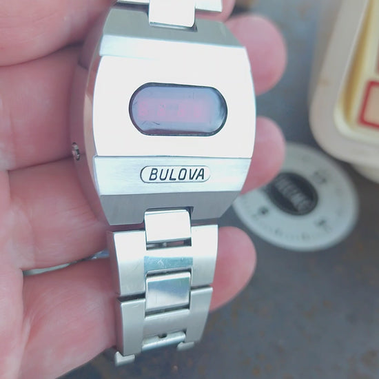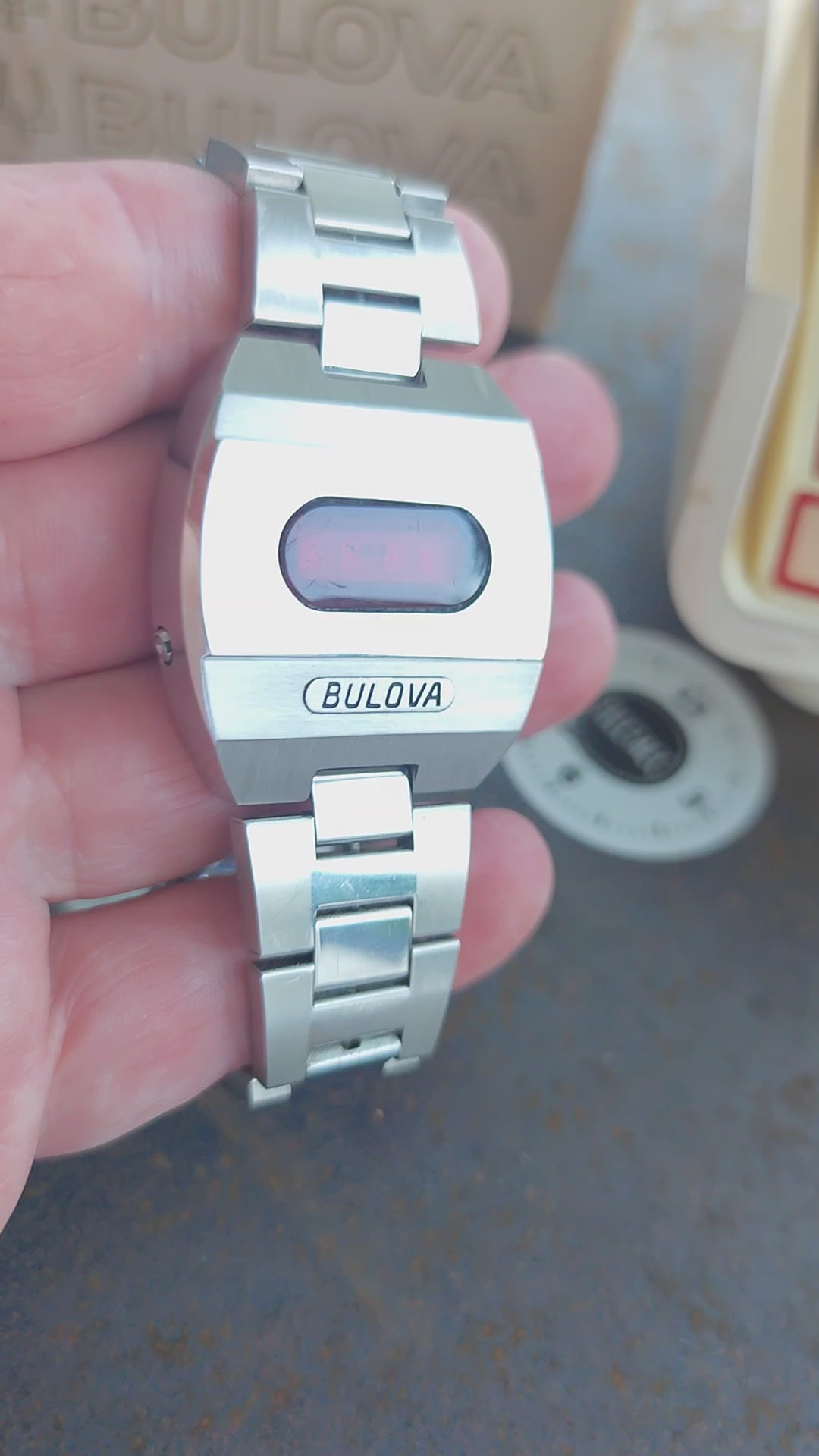 Die BULOVA LED N4 ist in diesem Zustand extrem schwer zu finden – noch wichtiger ist, dass diese Uhr neuwertig ist und nur sehr, sehr oberflächliche Gebrauchsspuren aufweist. Aufgrund der enormen Größe der Uhr findet man sie normalerweise nur mit starken Gebrauchsspuren, Kratzern und Dellen. Hier haben wir ein herausragendes Exemplar. Originalarmband mit einer Werkslänge von 19,0-19,5 cm Handgelenksumfang. Als Highlight liegt die originale ausklappbare Innenbox in perfektem Zustand mit rauchfarbenem Plexiglas bei und ist ebenfalls voll funktionsfähig. Als außergewöhnliches Highlight liegt auch die Außenbox bei – weist Lagerspuren auf. Absolut fantastisches Sammlerset.
