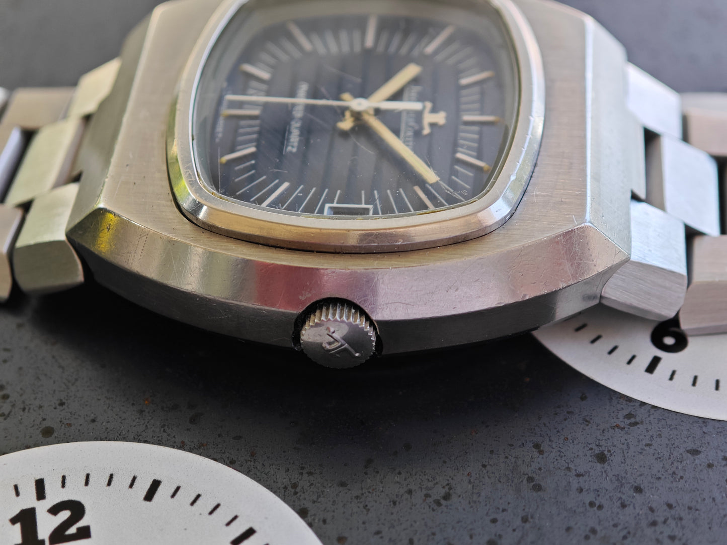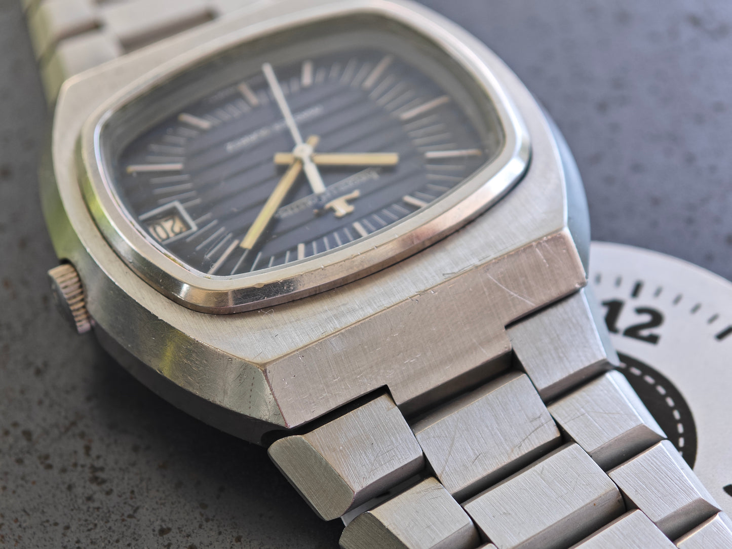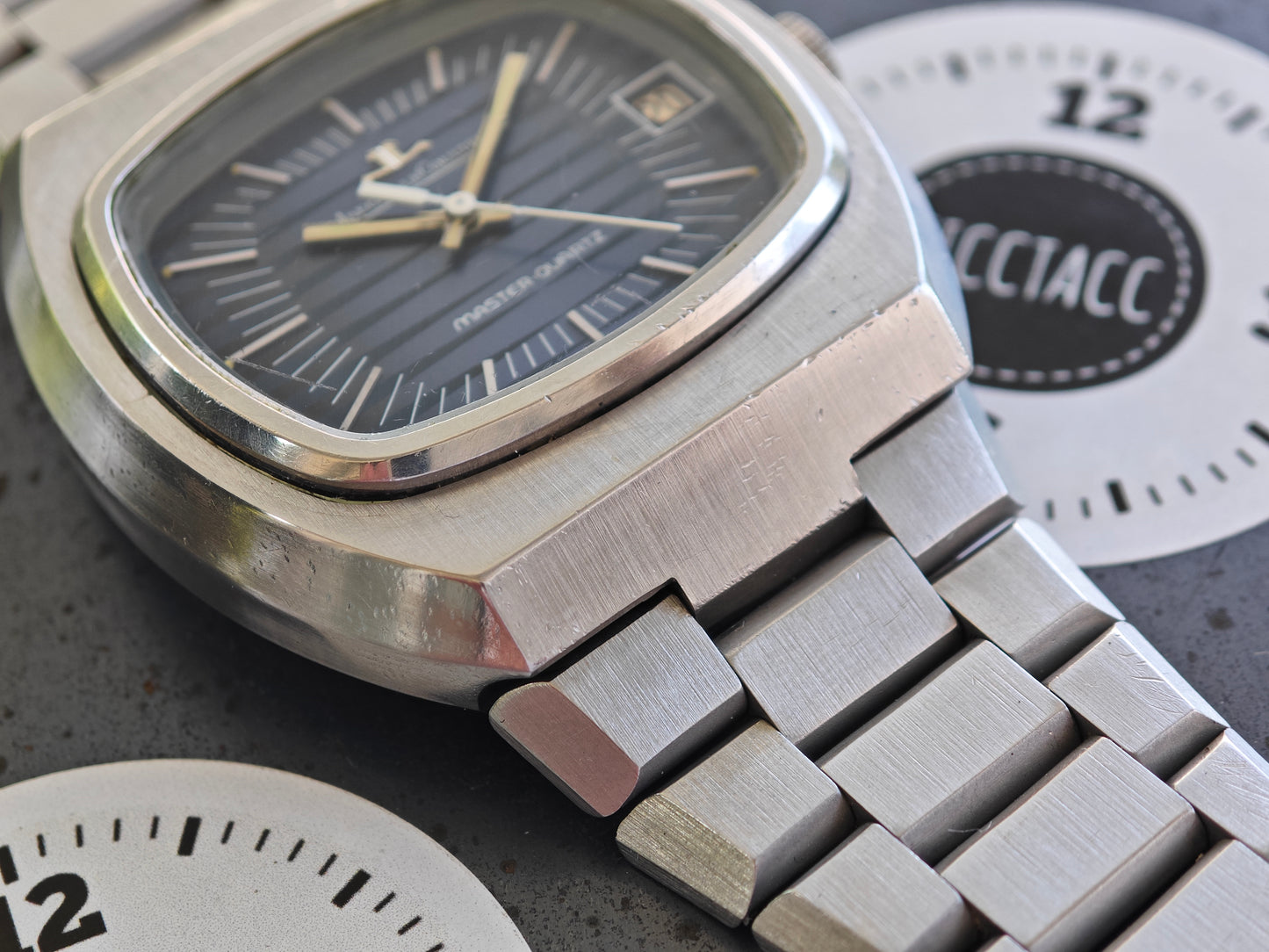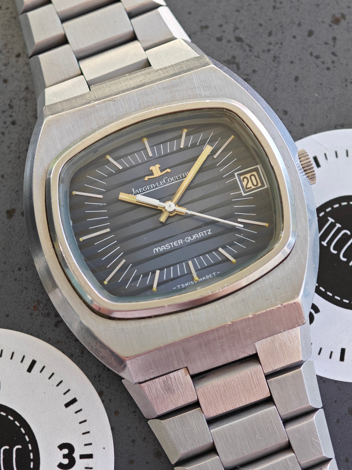 Die Jaeger LeCoultre Master-Quartz ist in letzter Zeit sehr schwer zu finden. Hier haben wir ein sehr gutes Exemplar mit perfektem Zifferblatt und Zeigern. Gehäuse, Armband und Glas weisen leichte Gebrauchsspuren auf. Sehr seltene Version mit Chatelain-Armband für einen Handgelenkumfang von ca. 19,0 cm. Die Uhr ist groß und edel und war eine der ersten Quarzuhren der Welt. Die Uhr funktioniert voll und ist mit Datum versehen. Alles korrekt mit JLC signiert – auch die Krone! Sehr schöne Alltagsuhr.