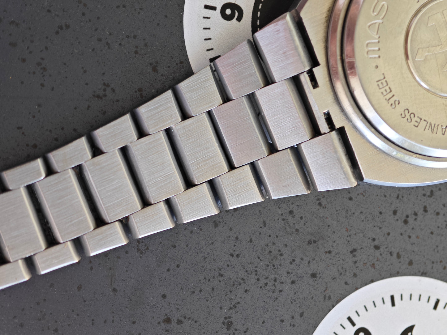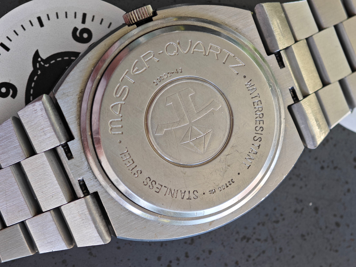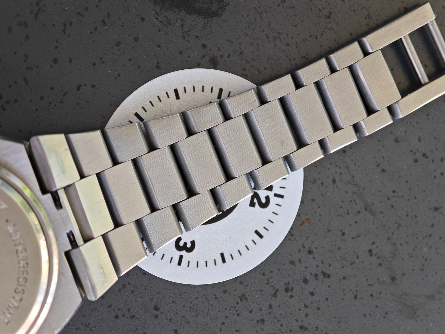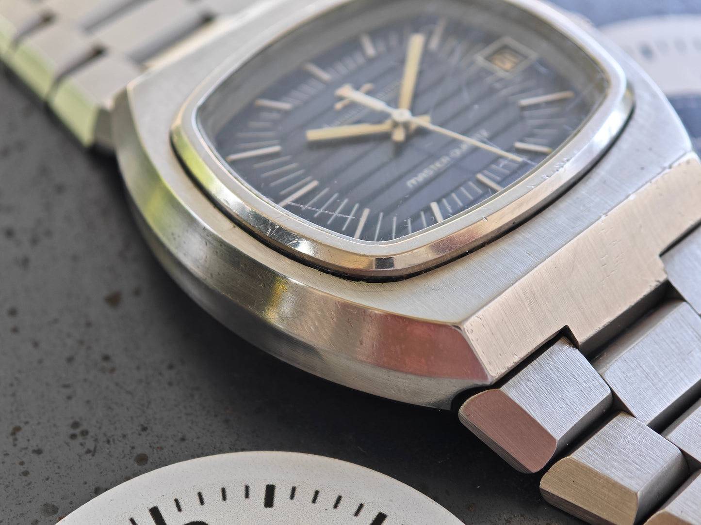 Die Jaeger LeCoultre Master-Quartz ist in letzter Zeit sehr schwer zu finden. Hier haben wir ein sehr gutes Exemplar mit perfektem Zifferblatt und Zeigern. Gehäuse, Armband und Glas weisen leichte Gebrauchsspuren auf. Sehr seltene Version mit Chatelain-Armband für einen Handgelenkumfang von ca. 19,0 cm. Die Uhr ist groß und edel und war eine der ersten Quarzuhren der Welt. Die Uhr funktioniert voll und ist mit Datum versehen. Alles korrekt mit JLC signiert – auch die Krone! Sehr schöne Alltagsuhr.