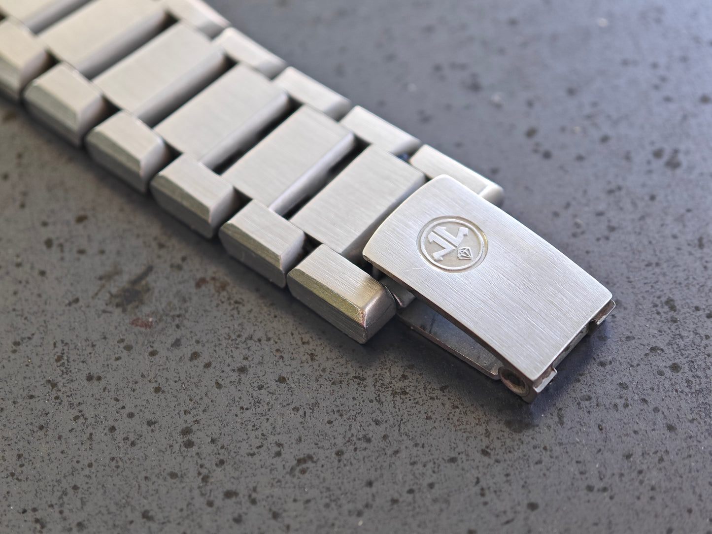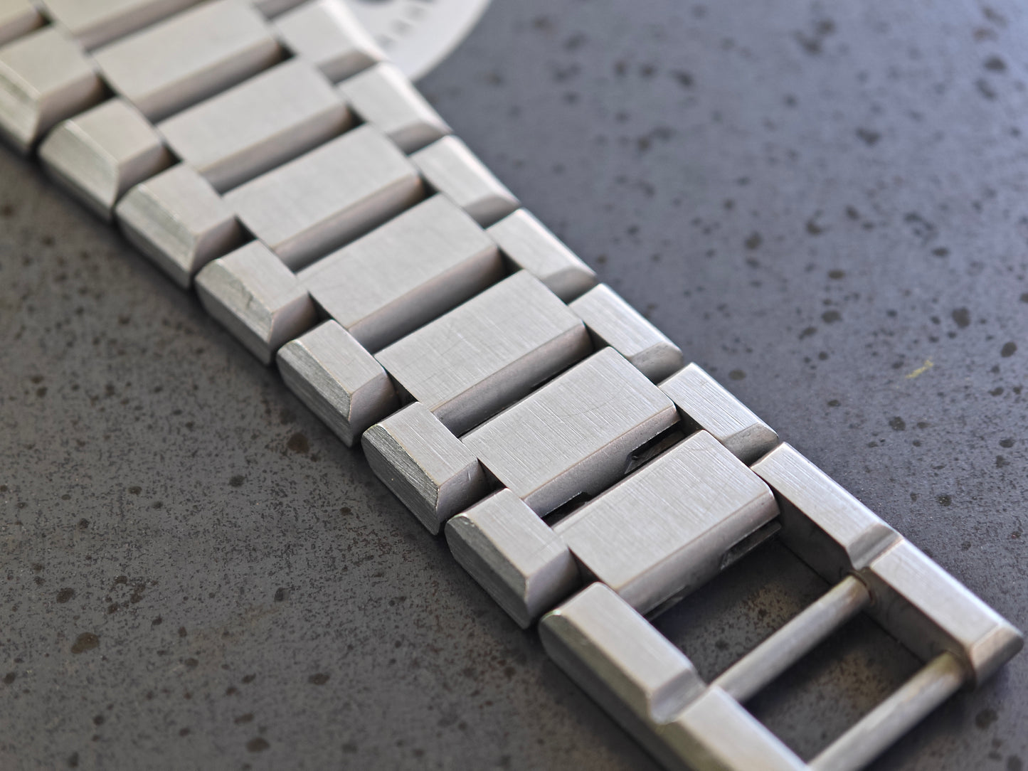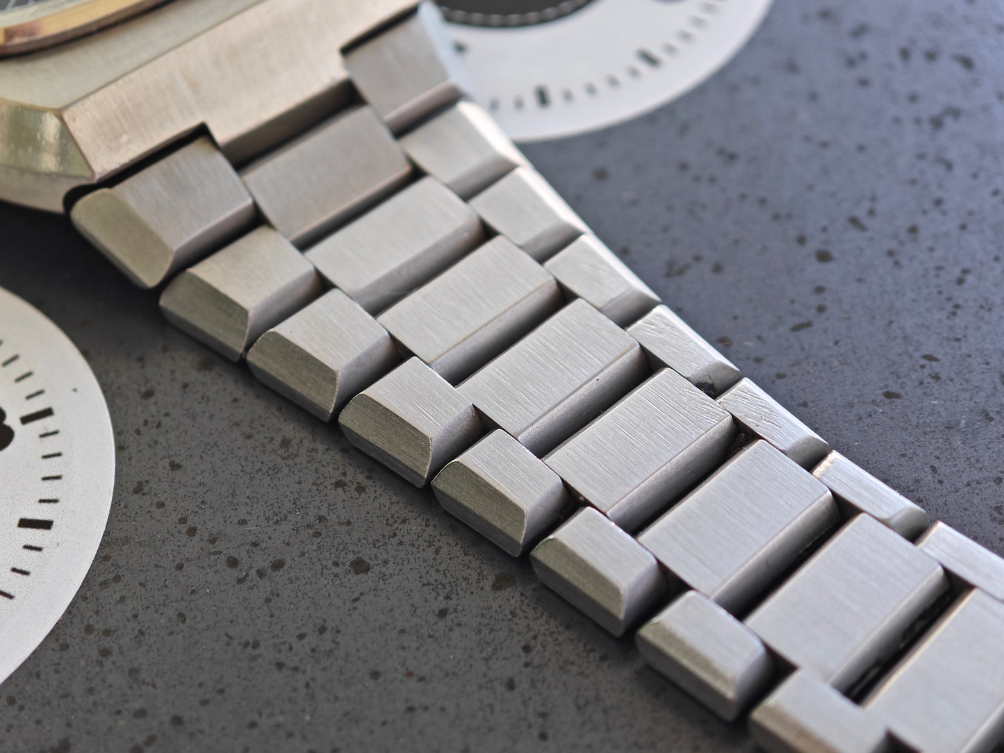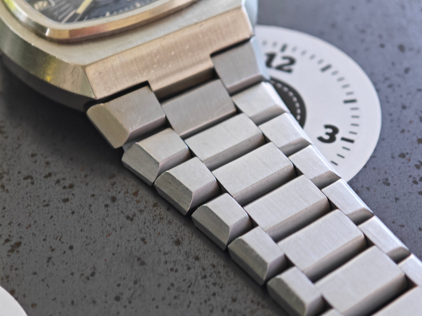 Die Jaeger LeCoultre Master-Quartz ist in letzter Zeit sehr schwer zu finden. Hier haben wir ein sehr gutes Exemplar mit perfektem Zifferblatt und Zeigern. Gehäuse, Armband und Glas weisen leichte Gebrauchsspuren auf. Sehr seltene Version mit Chatelain-Armband für einen Handgelenkumfang von ca. 19,0 cm. Die Uhr ist groß und edel und war eine der ersten Quarzuhren der Welt. Die Uhr funktioniert voll und ist mit Datum versehen. Alles korrekt mit JLC signiert – auch die Krone! Sehr schöne Alltagsuhr.
