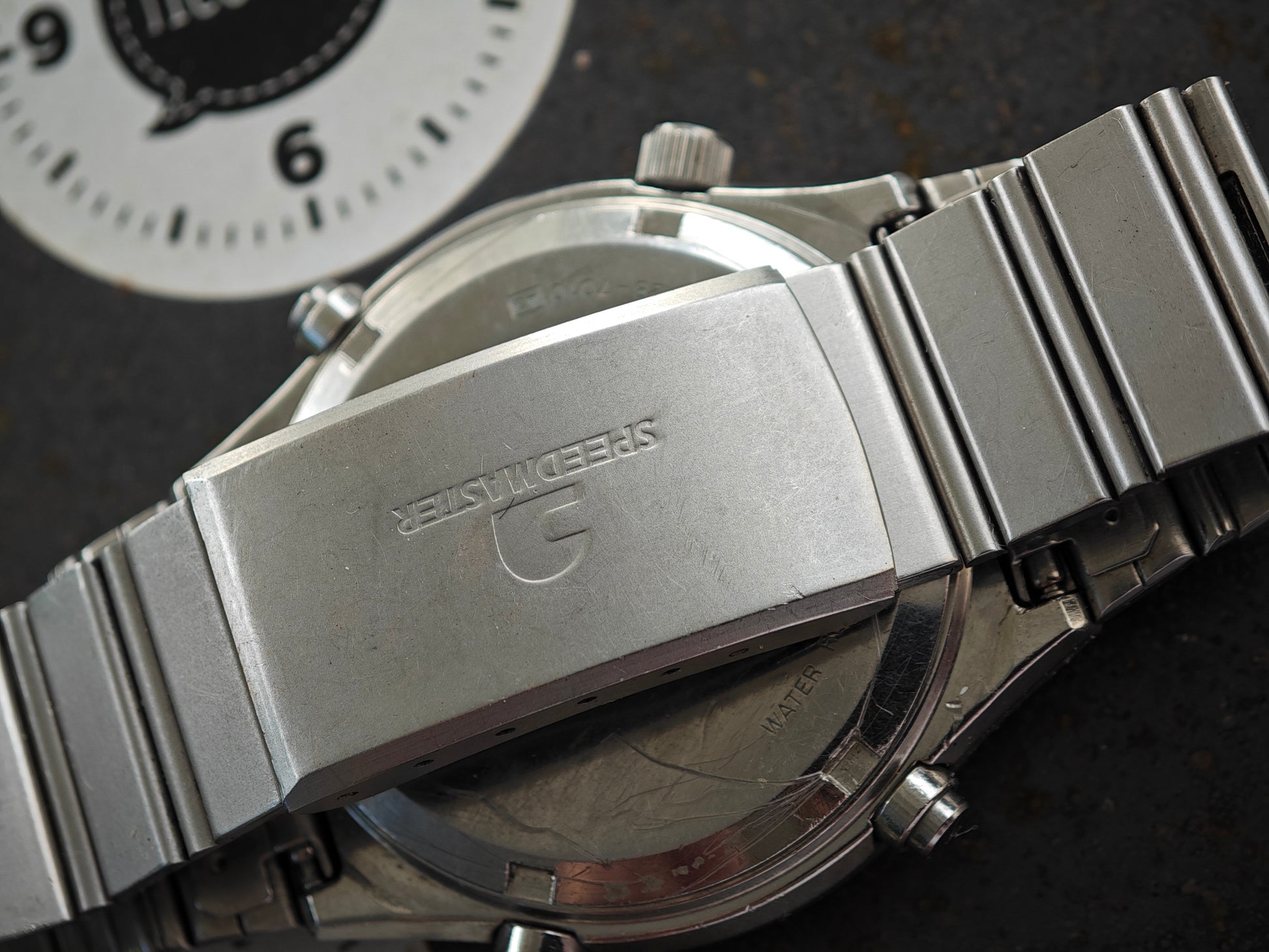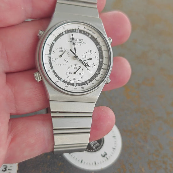 Seiko 7a28-7010 Speedtimer. Die Uhr ist original von SEIKO und hat ein extrem alpinweißes Zifferblatt. Keine Verfärbungen oder Vergilbungen, wie sie bei 80 % der Zifferblätter dieses Modells zu sehen sind. Gehäuse und Armband wurden nie poliert und haben immer noch die matte, titanähnliche Optik. Das Armband passt jetzt für Handgelenke mit einem Umfang von 19,0–19,5 cm. Wir werden dem Paket ein weiteres Glied beifügen. Der Gehäuseboden weist Öffnungsspuren auf. Die Modellnummer 7a28-7010 und die Seriennummer sind gut sichtbar. Produktionsdatum war Dezember 1982. Die Seriennummer beginnt bei 2D. Das Glas ist kratzfrei und immer noch original mit leicht gewölbter Oberfläche, wie es sein sollte.