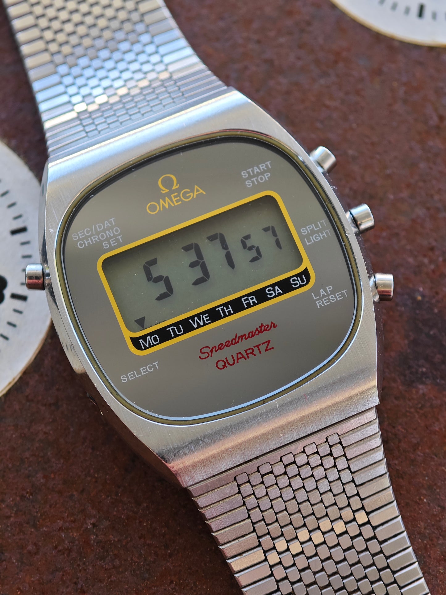 MINT OMEGA Speedmaster LCD. This version with model Number 186.0005 is one of the most desired in the 186.xxxx series. We have installed a new crystal and one Push Button was Exchanged. Also the entire movement was serviced in our own Workshop. The bracelet is original to this watch and also fits very large wrist size. Most sleek LCD Watch in the planet. Amazing Look and 70s Feeling.