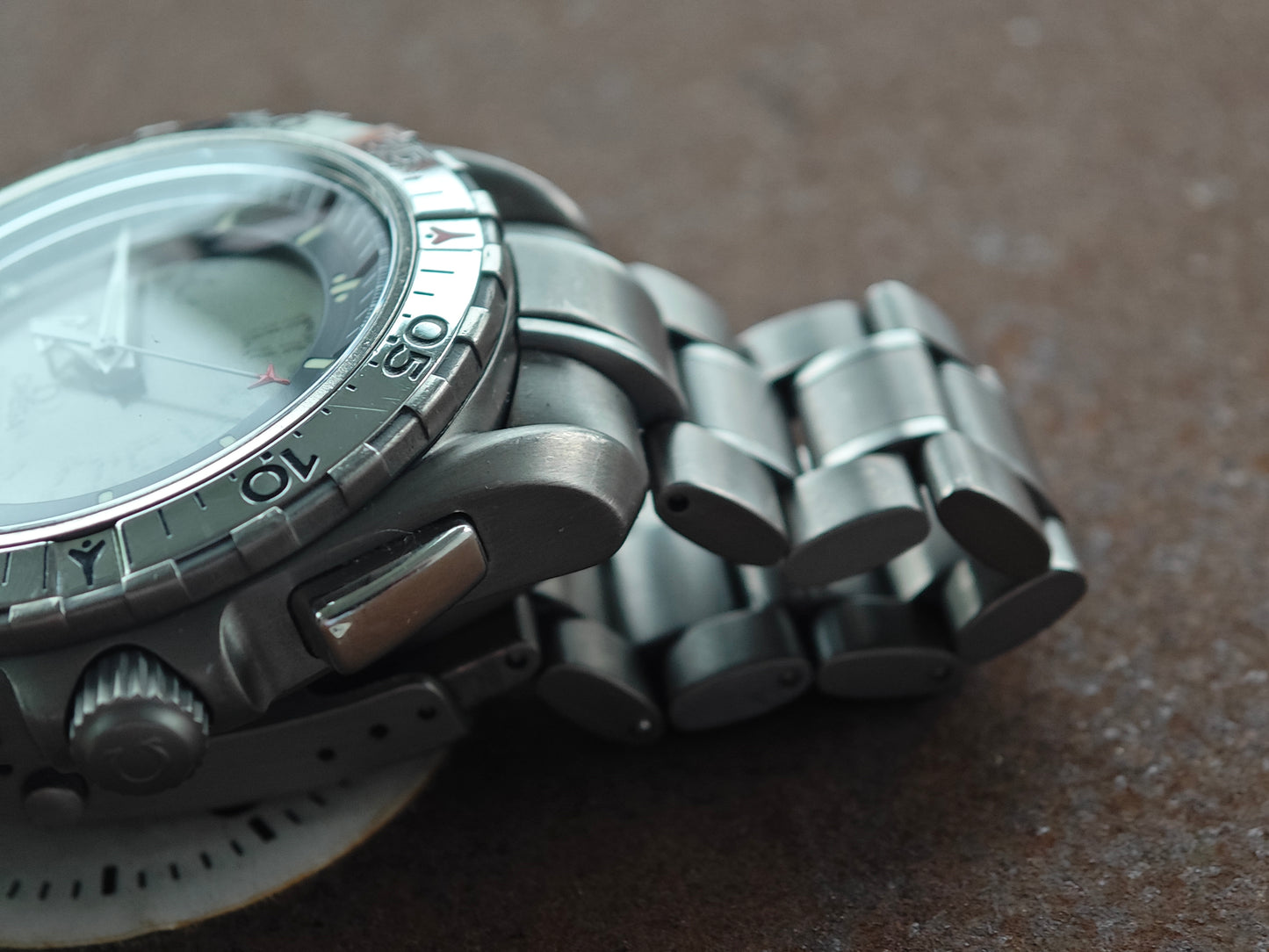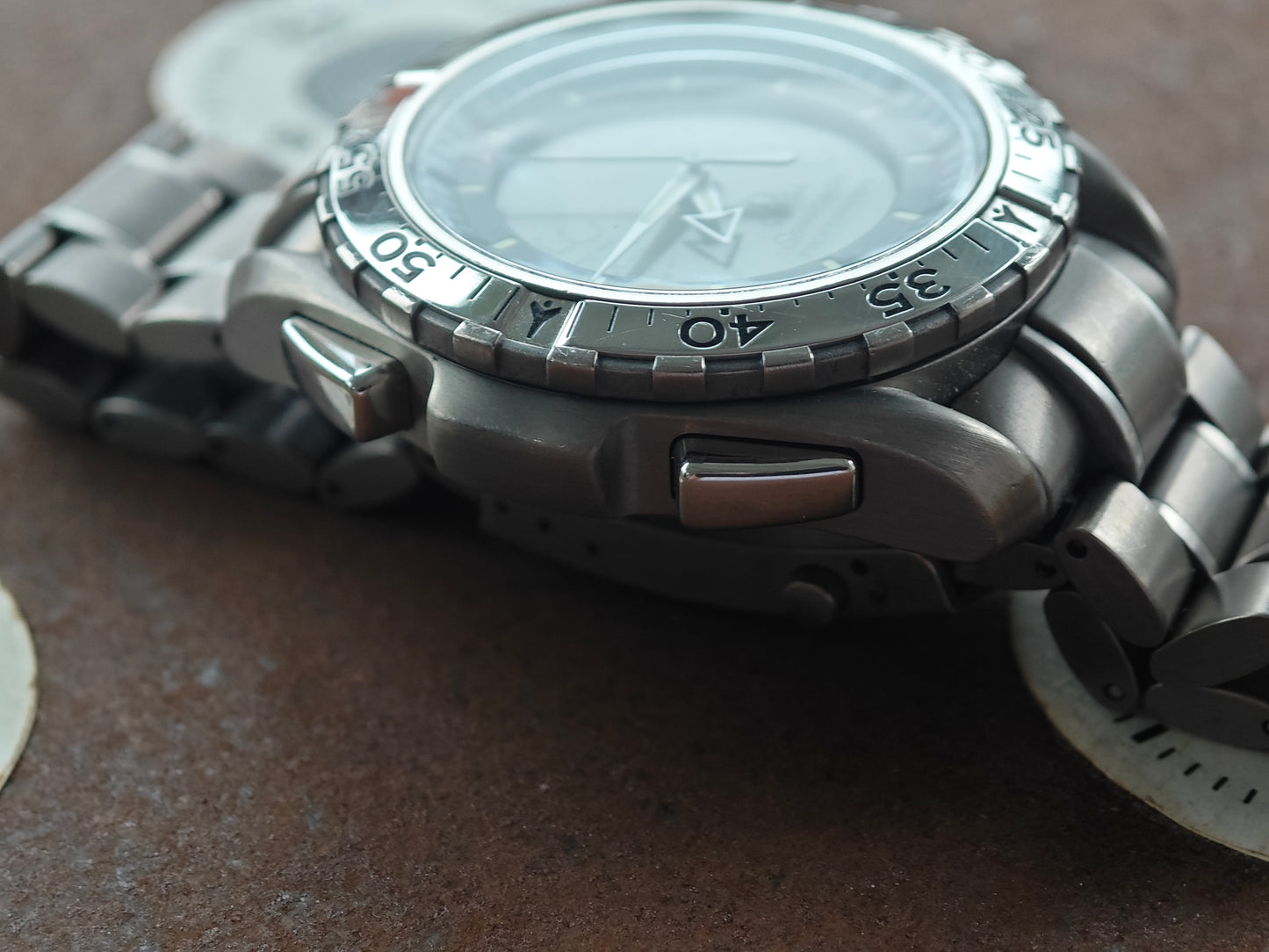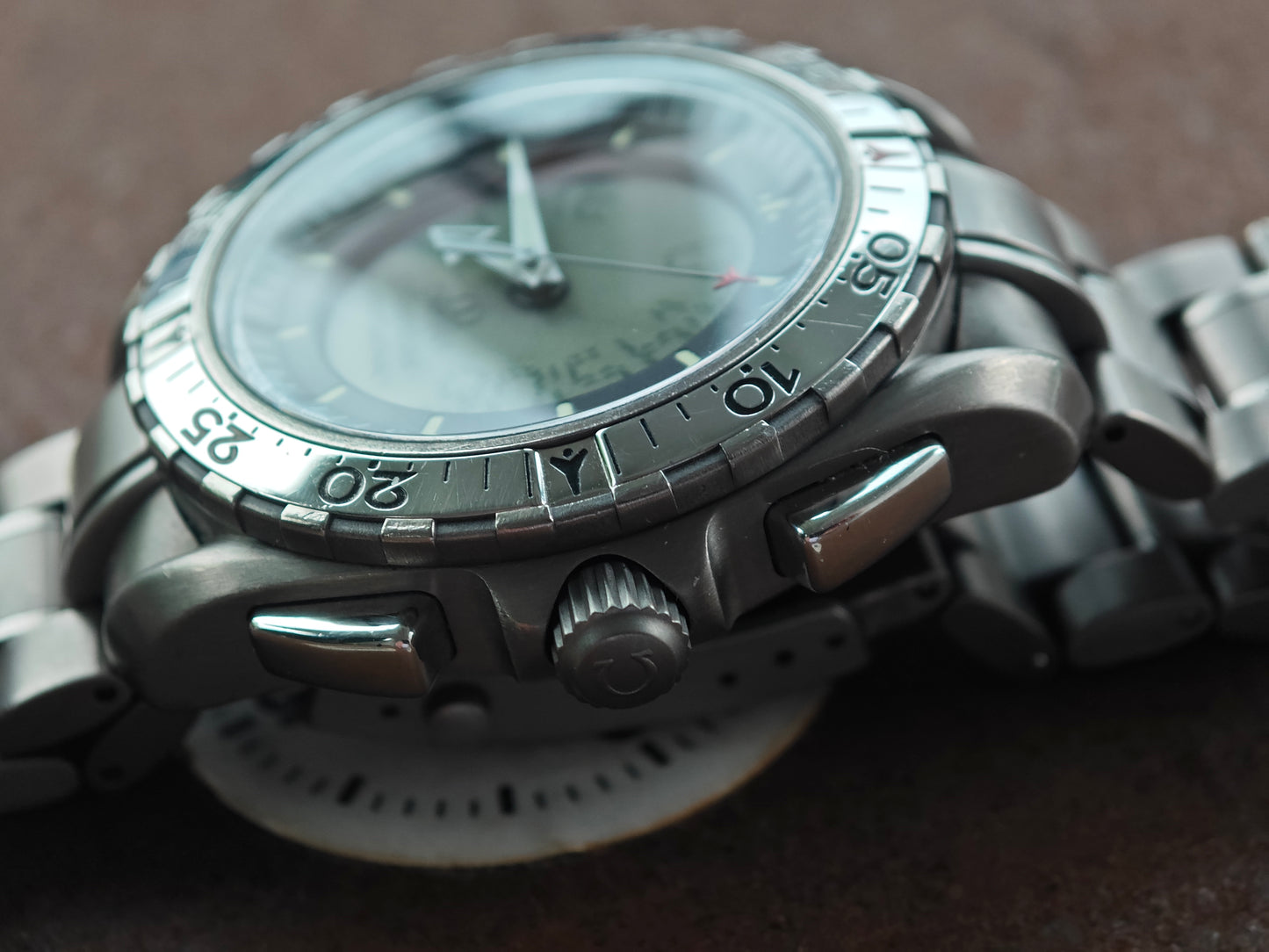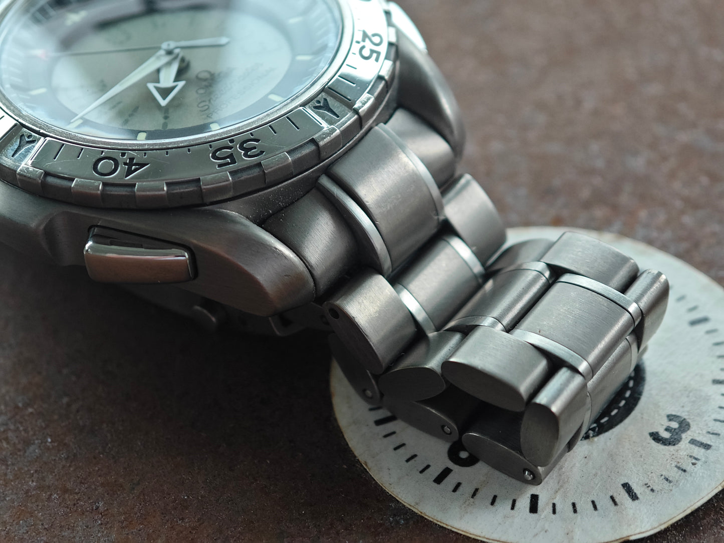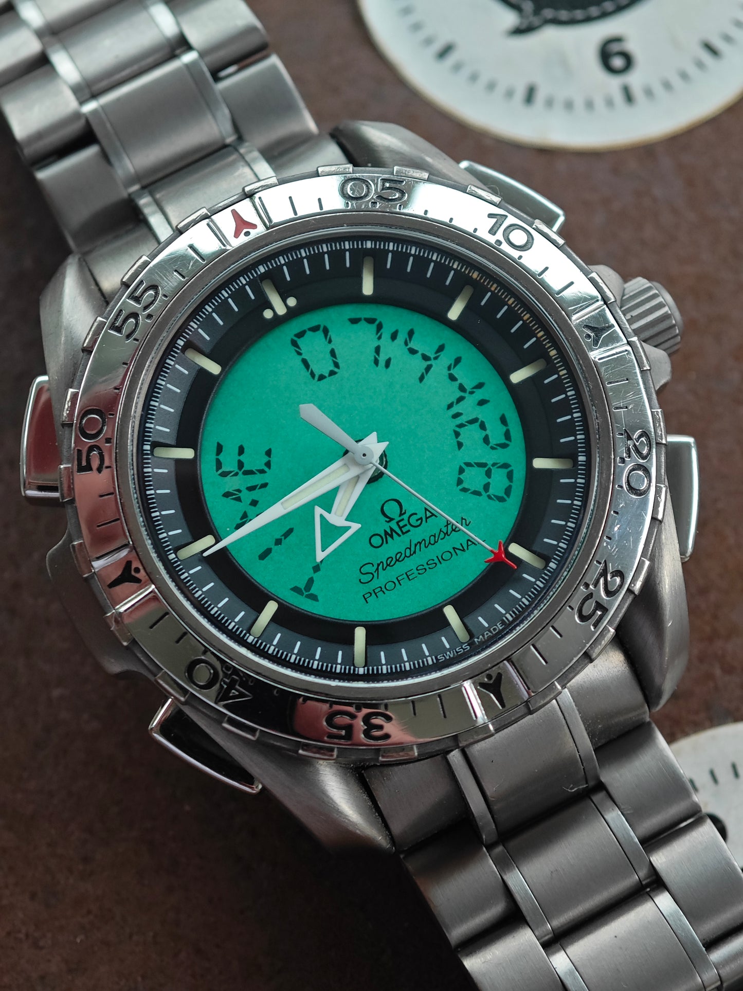 VERY MINT OMEGA Speedmaster X-33 NASA fein Full Titanium. The watch is in outstanding conditions with only very superficial wear to Case, Bezel and Bracelet. Very hard to find in these conditions. All functions Work inclusive Backlight and Sound. The bracelet - and this is very important - fits a 19,5-19,7 cm wrist. Its hard to find extra links for this model. Please inquire If you require more links ahead of your purchase. This watch is one of the most advanced LCD- analog watches in the world. Still. No other watch company has a similar watch in their portfolio. Collectors conditions.