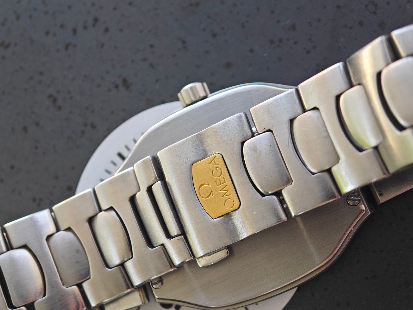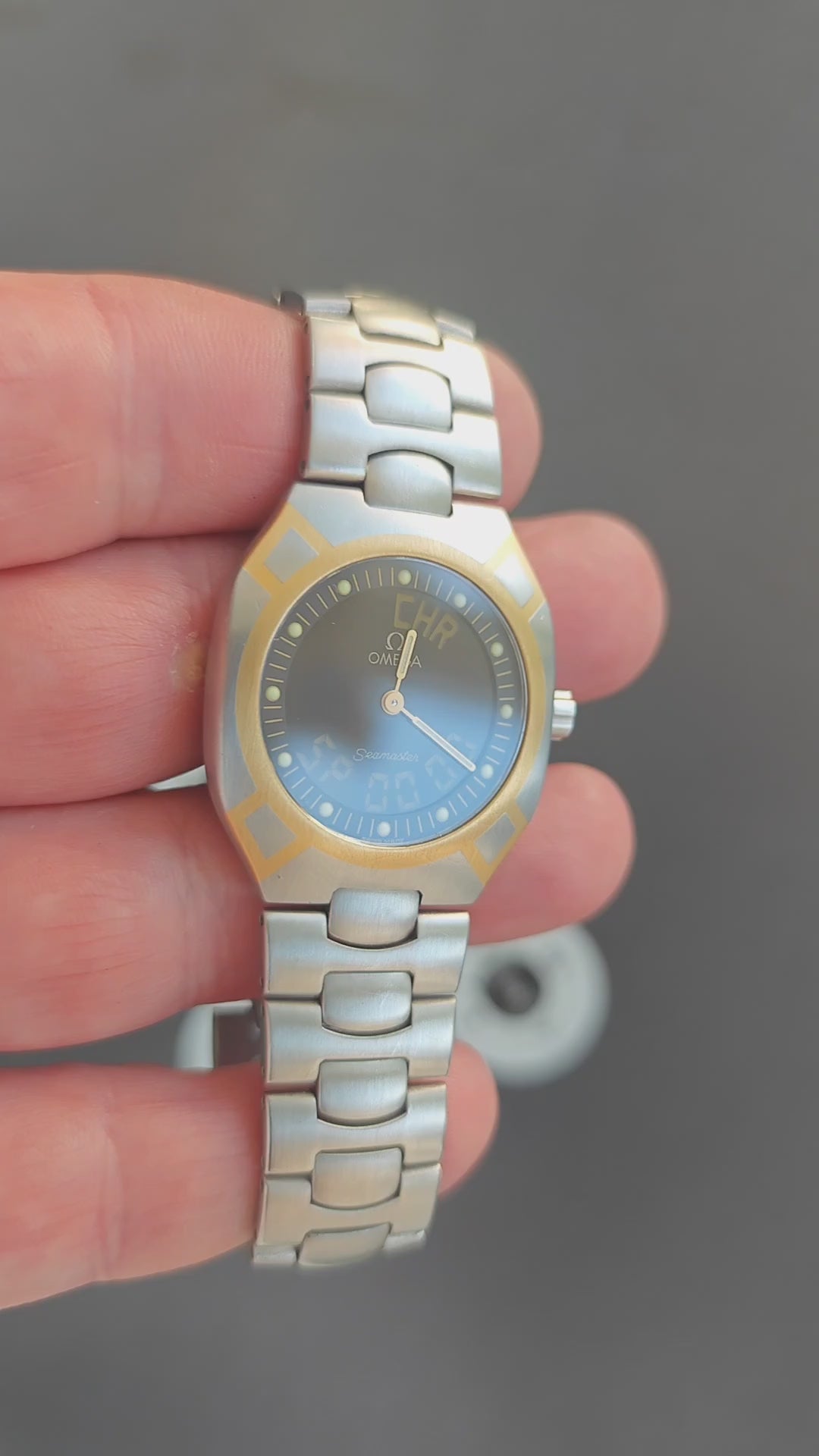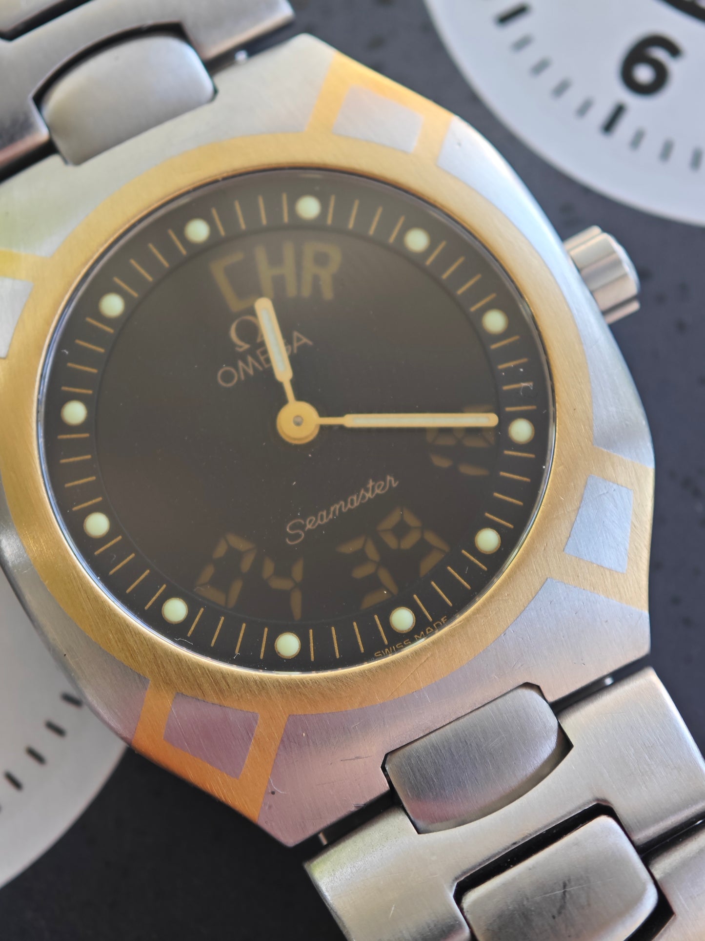 OMEGA SEAMASTER Polaris Multi-functional in very good conditions. Serviced by us in June 2025 in our own Workshop. All functions Work especially the sound is super crisp. The entire watch was dismanteled during the procedure and a as good as new crystal was installed too. Original bracelet to the watch. Real gold in the Case 18k/750 with a value alone of about 200-250 Euro. Long bracelet - we do have extra links to make it any size you want. OMEGA Plate in clasp is there - often lost. Watch serial number from 1989.