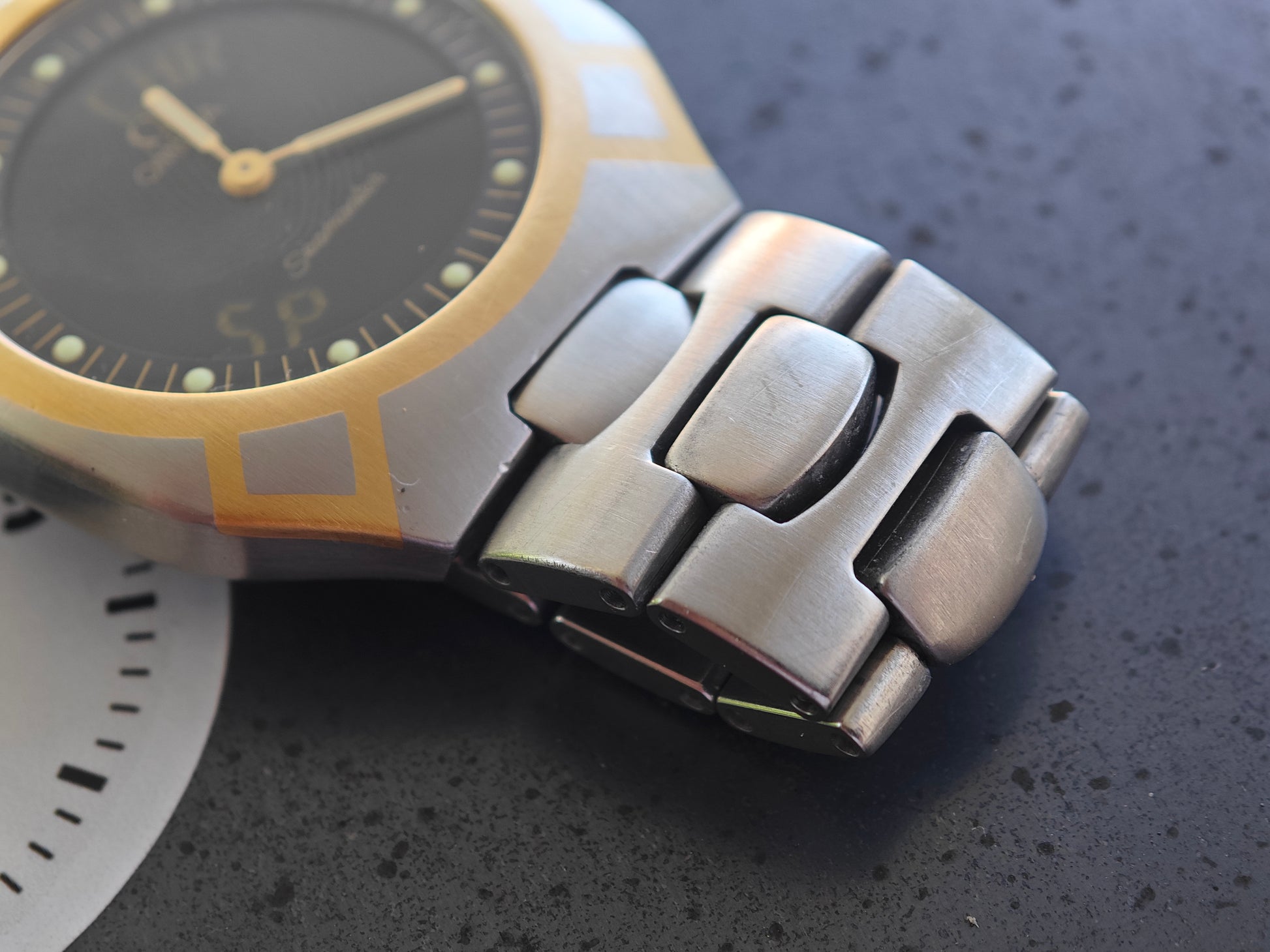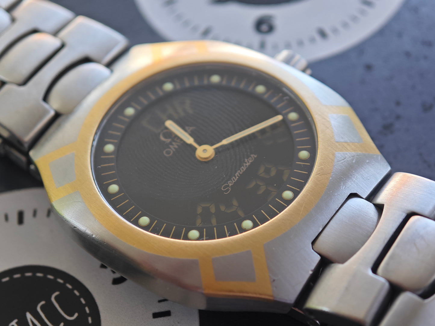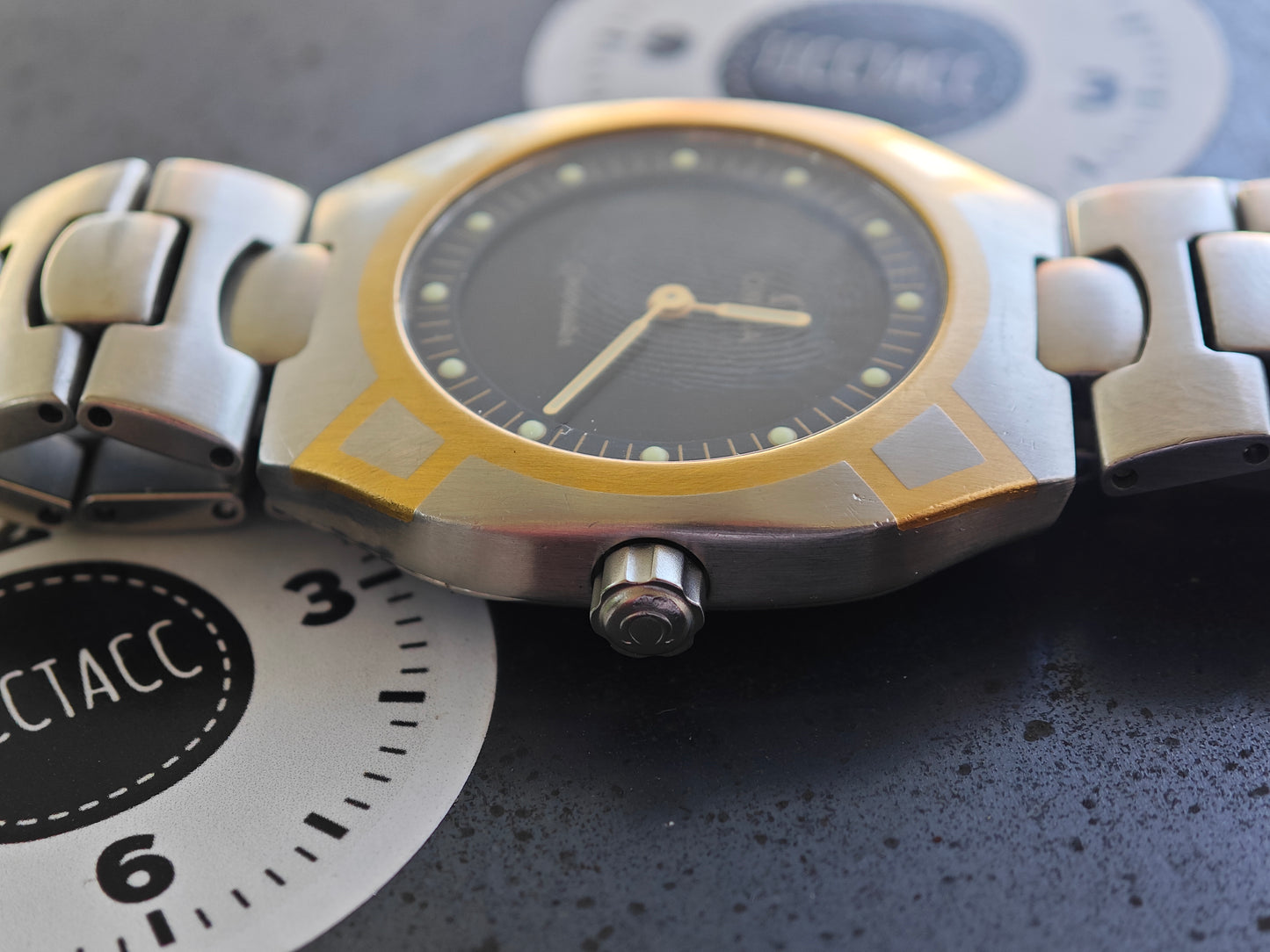 OMEGA SEAMASTER Polaris Multi-functional in very good conditions. Serviced by us in June 2025 in our own Workshop. All functions Work especially the sound is super crisp. The entire watch was dismanteled during the procedure and a as good as new crystal was installed too. Original bracelet to the watch. Real gold in the Case 18k/750 with a value alone of about 200-250 Euro. Long bracelet - we do have extra links to make it any size you want. OMEGA Plate in clasp is there - often lost. Watch serial number from 1989.