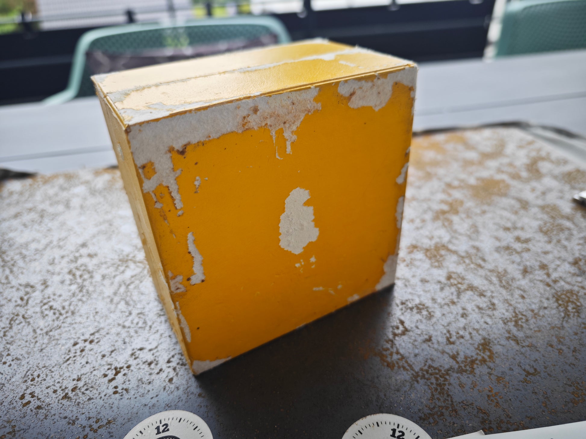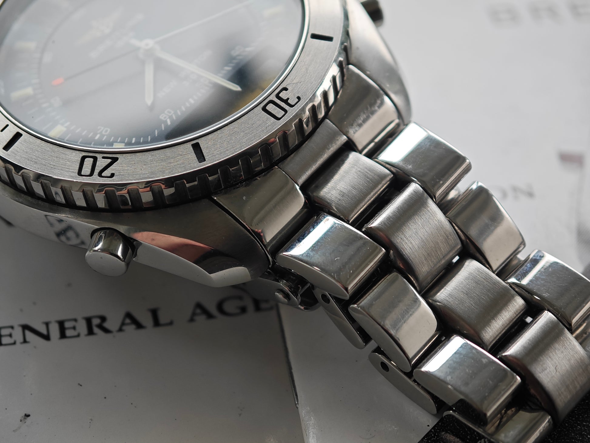 Quasi nuovo Breitling Pluton Navitimer 3100 del 1993. Questa combinazione con quadrante blu e lunetta in metallo è molto difficile da trovare. L'orologio è in condizioni eccezionali con solo un'usura minima. La cassa è perfetta con la spazzola originale, senza graffi, ammaccature o ammaccature. Il bracciale è in condizioni eccezionali. Anche la linea centrale dei blocchi mostra il suo aspetto spazzolato. Le chiusure mostrano solo un'usura minima e sono tra le migliori che abbiamo visto finora. Il bracciale si adatta a polsi di 19,0 - 19,5 cm. Anche il fondello presenta solo un'usura minima sotto la numerazione. L'orologio viene fornito come FULL SET con scatola originale (come al solito questo tipo di scatola mostra forti segni di usura - vedi foto). I documenti sono corrispondenti e timbrati nel 1993 da un rivenditore tedesco del sud della Germania. L'orologio è perfettamente funzionante, inclusi luce e suono. Il movimento è stato revisionato da noi nell'agosto 2025. È stata installata una nuova batteria. Set da collezione.