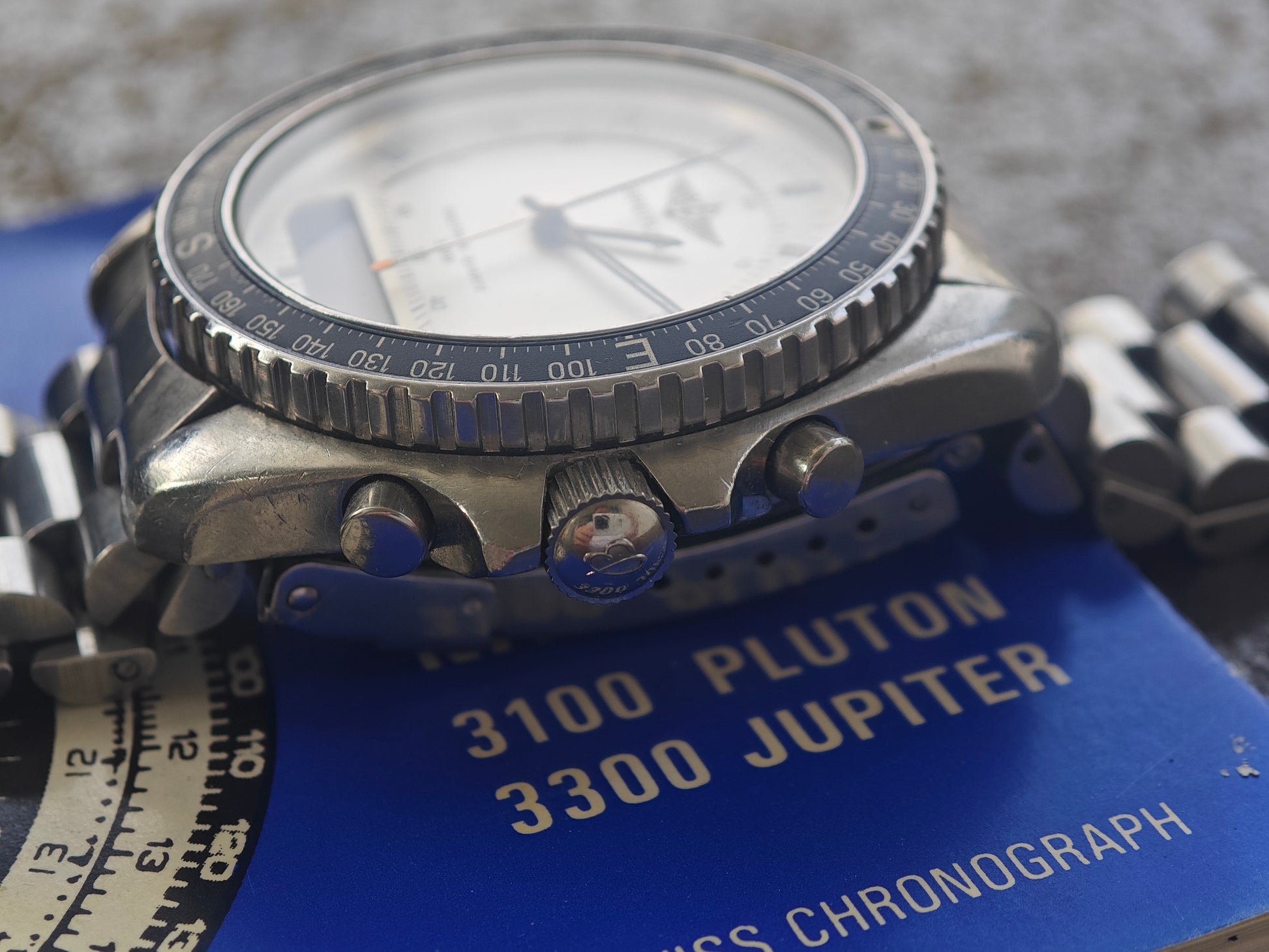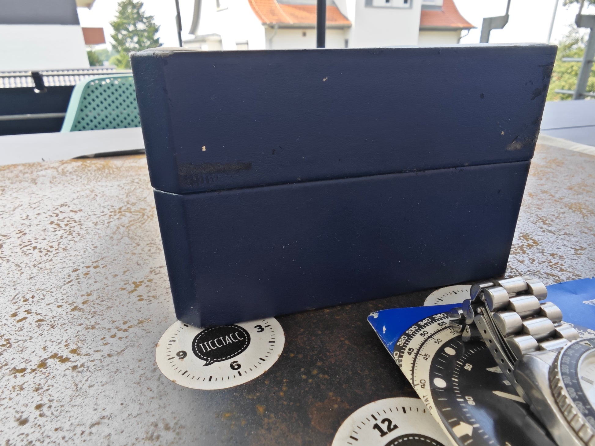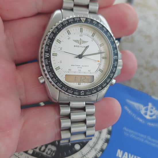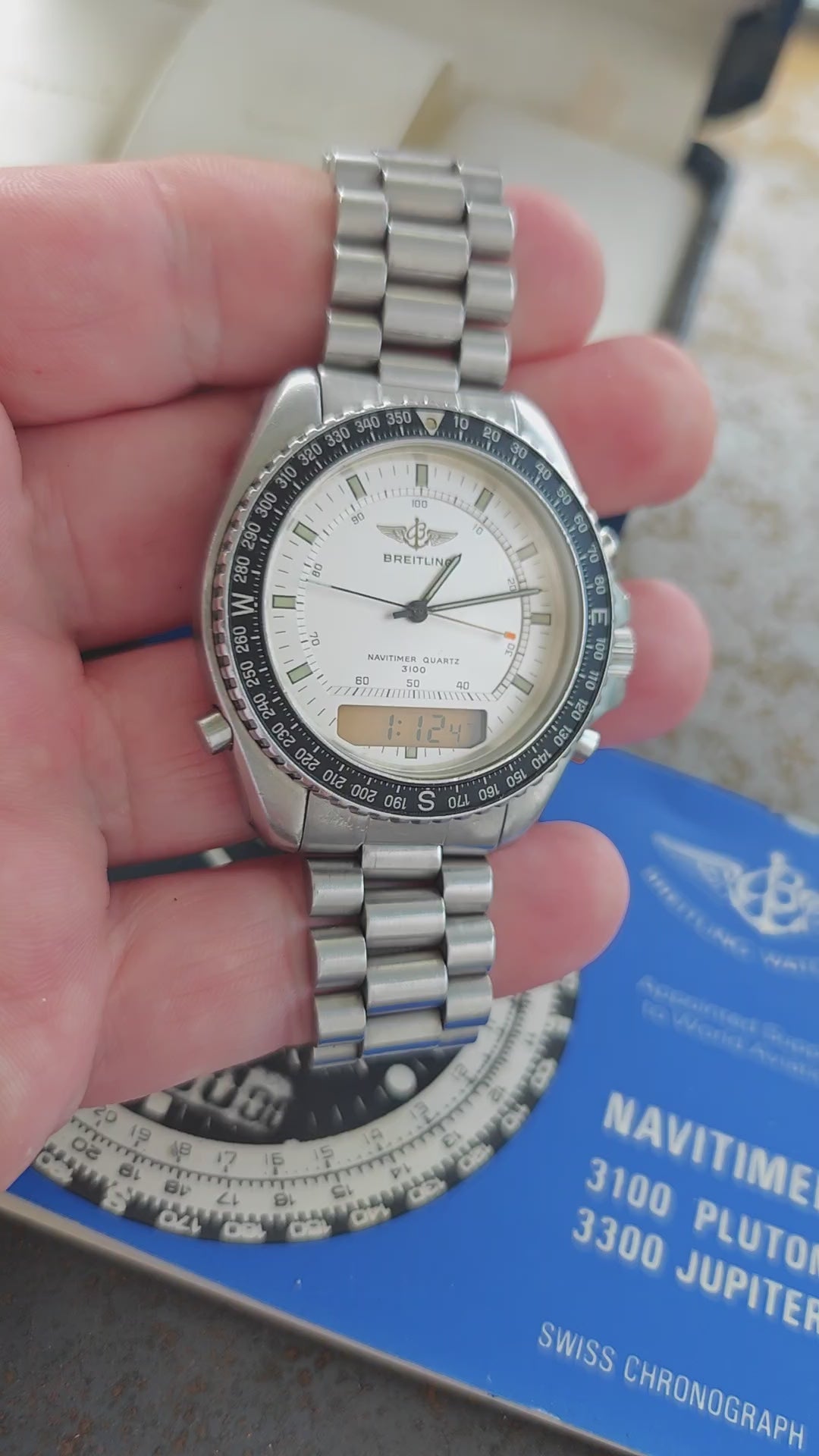 Questo orologio è di gran lunga il Breitling Navitimer (Pluton) più raro sul mercato: il quadrante bianco 80191. Stimiamo che solo 1/1000 80191 sia stato prodotto in questo colore. È il primo che teniamo tra le mani e uno dei pochi disponibili. L'orologio mostra i tipici segni di usura su cassa e bracciale. Viene fornito con un nuovo vetro. Viene fornito con il suo originale e desideratissimo bracciale Breitling "B" in acciaio inossidabile. Il bracciale si adatta a un polso di circa 19,0 cm. Potremmo avere maglie aggiuntive disponibili. Contattateci prima dell'acquisto. Viene fornito con scatola originale. La scatola è sicuramente una delle migliori che abbia mai visto finora, il rivestimento interno inizia a delaminarsi e presenta qualche segno di usura all'esterno. Viene fornito con manuale originale. Super raro, uno dei primi Navitimer!