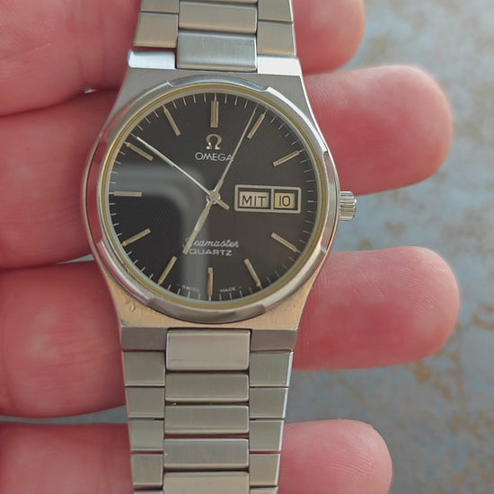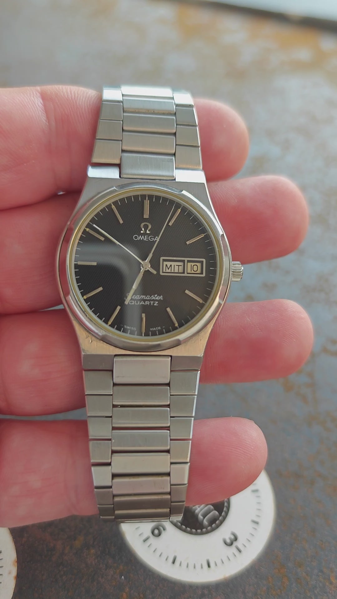 Questa versione OMEGA SEAMASTER Quartz è dotata di un quadrante waffle bluastro/nero super raro. Questo orologio è estremamente raro e si apre solo 1-2 volte all'anno. L'orologio è stato revisionato da noi e cristallo, corona, fuso e batteria sono stati sostituiti. La corona con pulsanti e il pulsante singolo sulla cassa funzionano entrambi perfettamente. Il calibro 1345 è uno dei movimenti al quarzo più sofisticati prodotti da OMEGA. Diametro cassa 35 mm. Bracciale molto lungo con circonferenza polso di 20,5 cm. Buone condizioni generali.