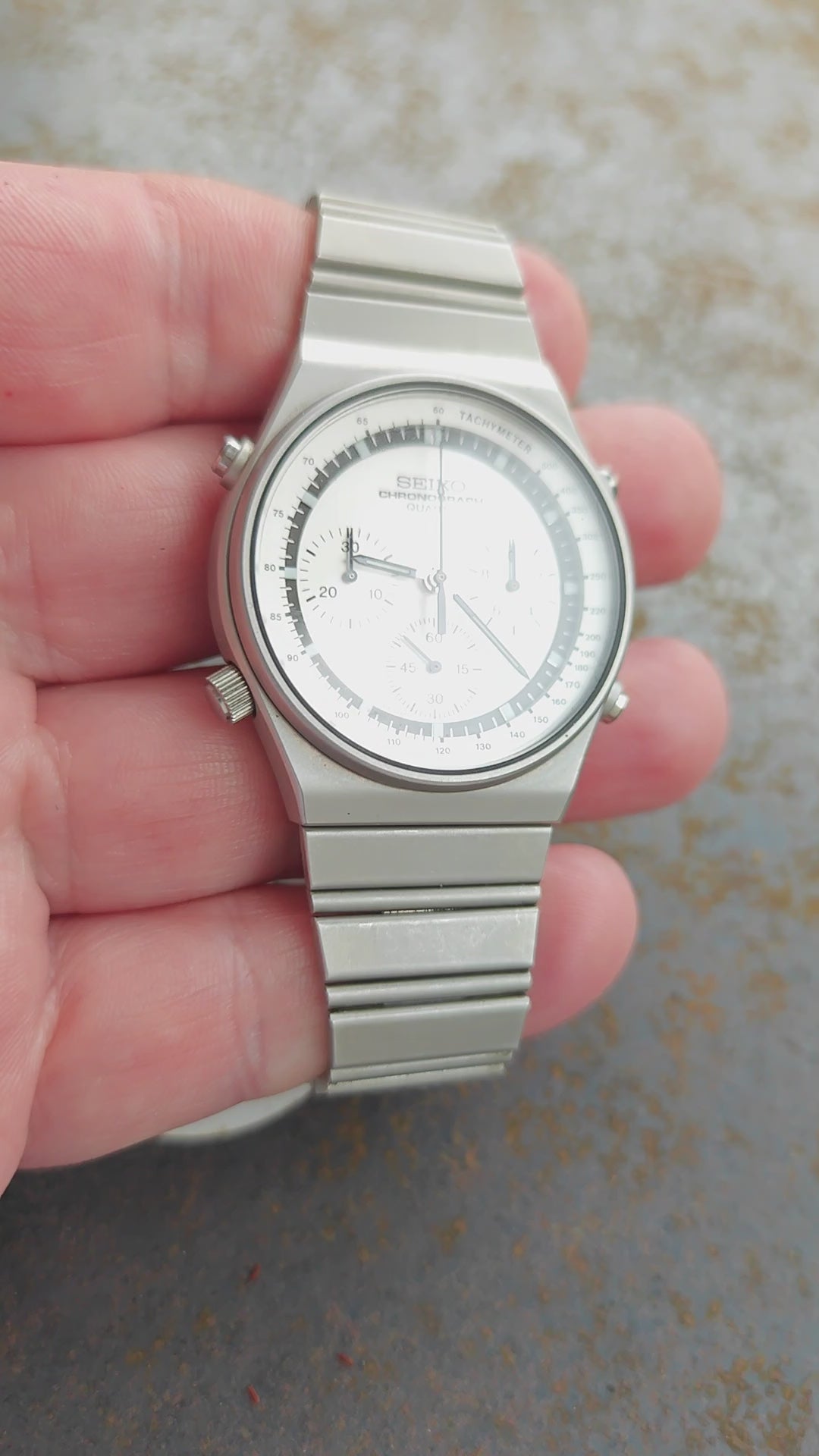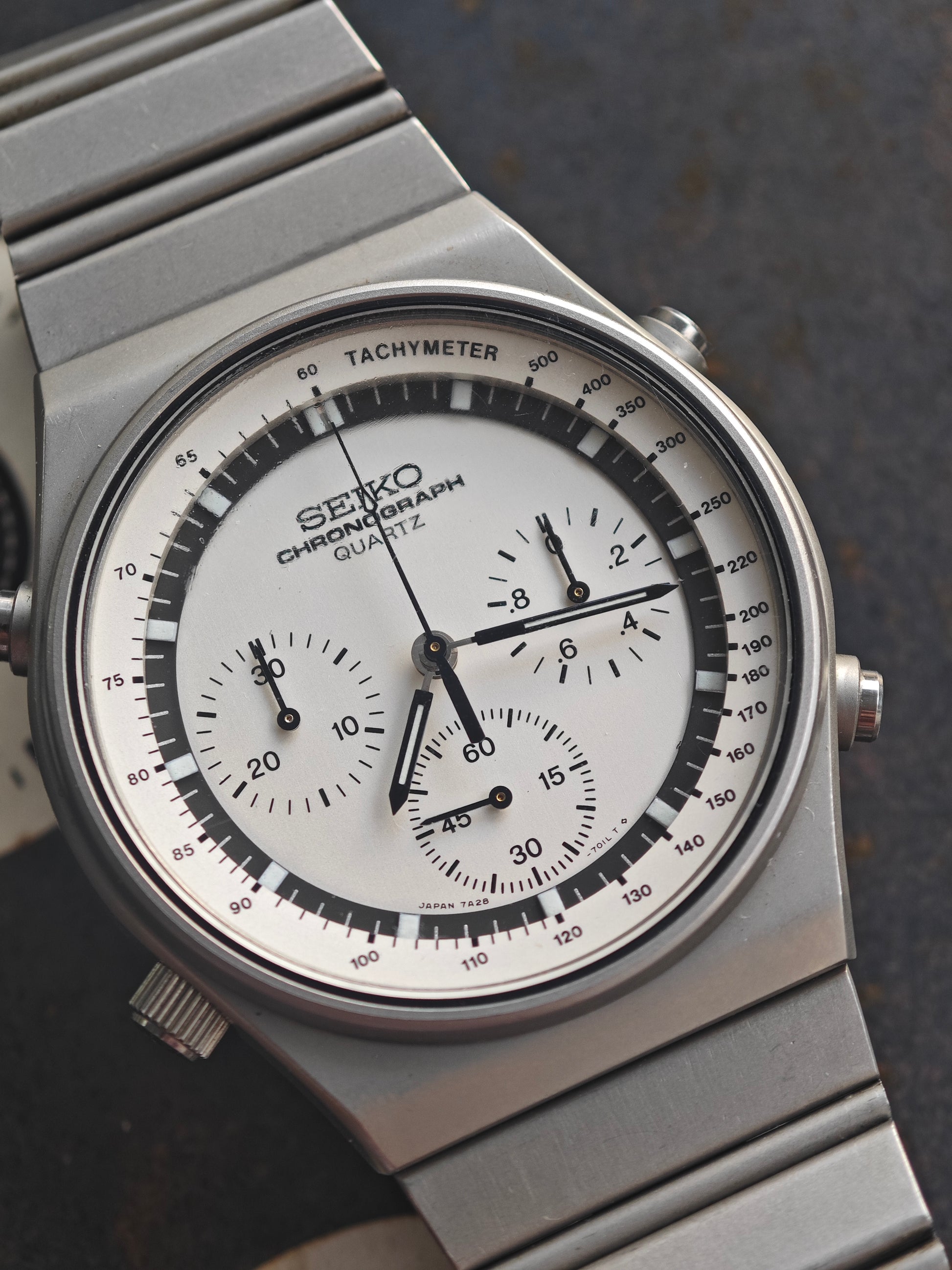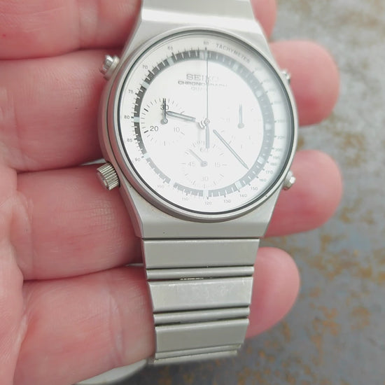 Seiko Speedtimer 7a28-7010 in perfette condizioni. L'orologio è completamente originale SEIKO con un quadrante bianco alpino estremamente intenso. Nessuna scoloritura, ingiallimento o altro, come si vede nell'80% dei quadranti di questo modello. La cassa e il bracciale non sono mai stati lucidati e mostrano ancora l'aspetto opaco, simile al titanio. Il bracciale si adatta ora a polsi da 18,5 cm. Il fondello è in ottime condizioni. Il numero di modello 7a28-7010 e il numero di serie sono ben visibili. La data di produzione era dicembre 1982. Il numero di serie inizia in 2D. Il vetro è privo di graffi. L'orologio è in condizioni da collezione.