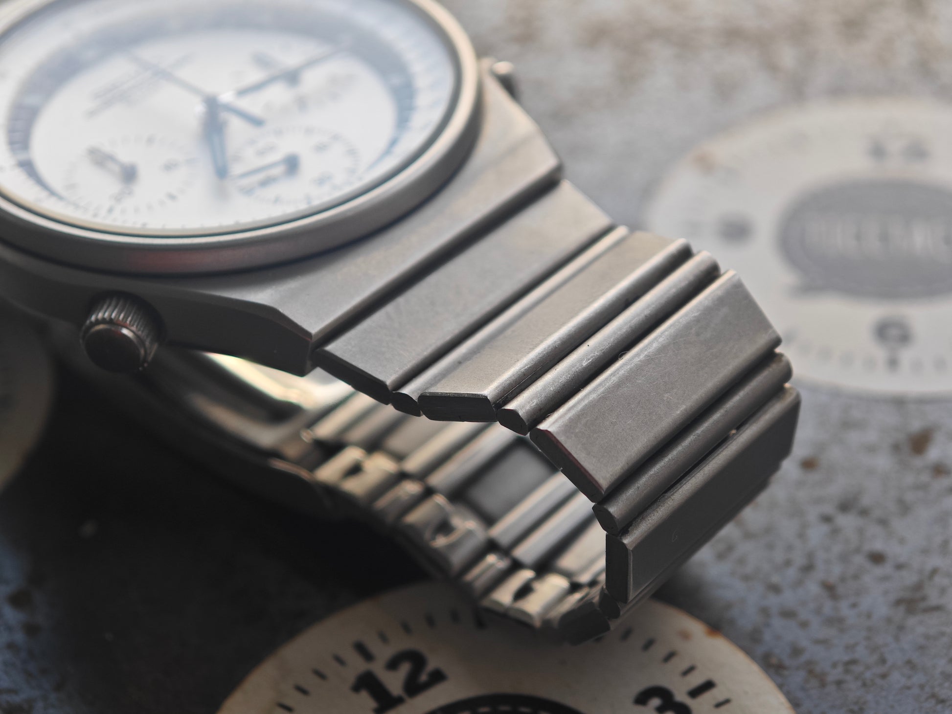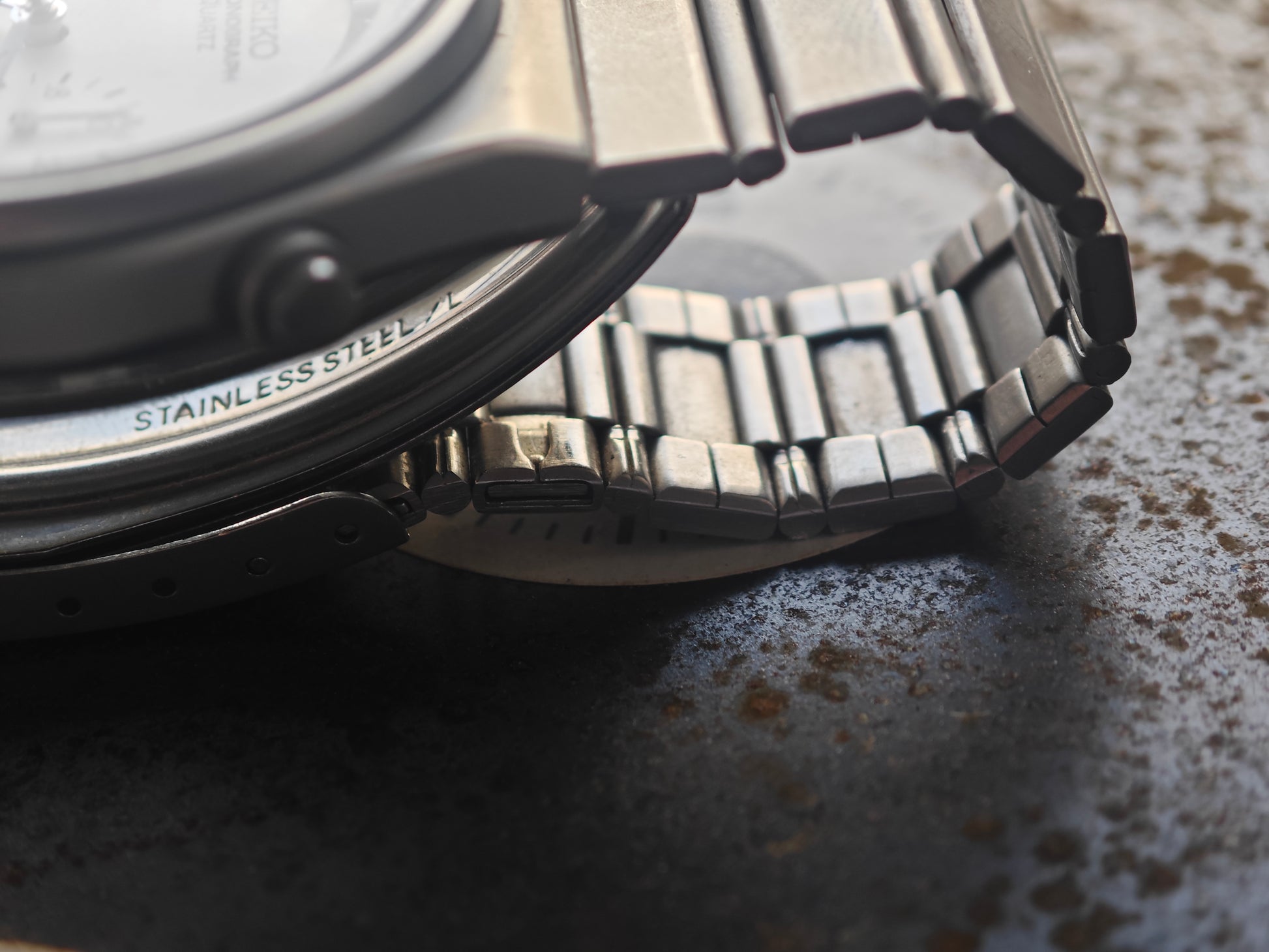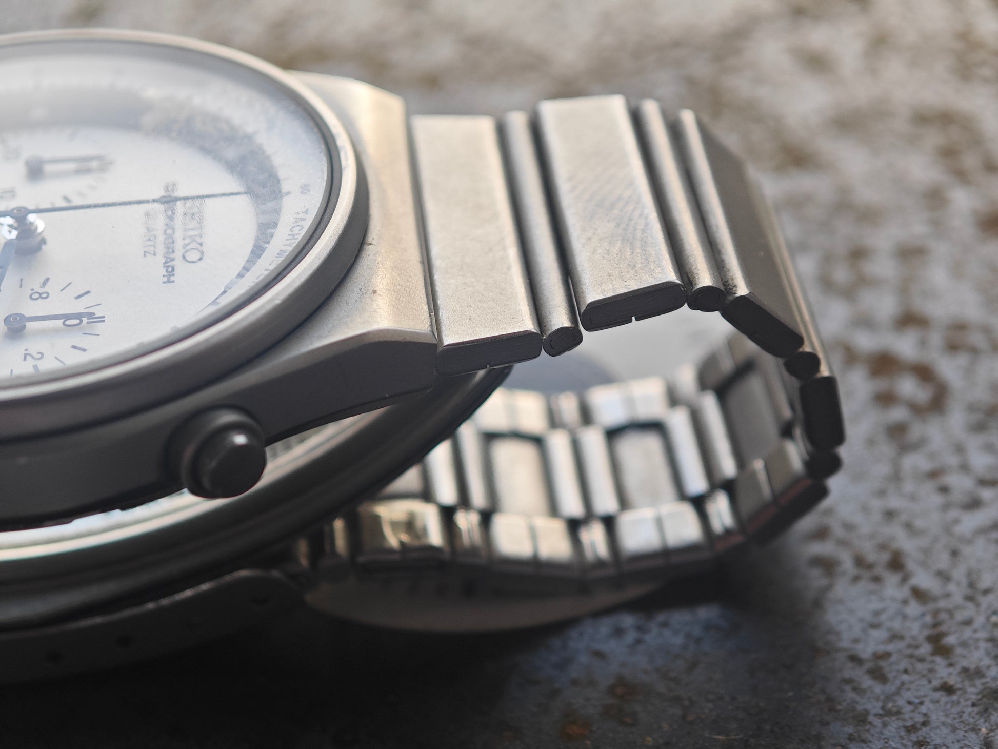 Seiko Speedtimer 7a28-7010 in perfette condizioni. L'orologio è completamente originale SEIKO con un quadrante bianco alpino estremamente intenso. Nessuna scoloritura, ingiallimento o altro, come si vede nell'80% dei quadranti di questo modello. La cassa e il bracciale non sono mai stati lucidati e mostrano ancora l'aspetto opaco, simile al titanio. Il bracciale si adatta ora a polsi da 18,5 cm. Il fondello è in ottime condizioni. Il numero di modello 7a28-7010 e il numero di serie sono ben visibili. La data di produzione era dicembre 1982. Il numero di serie inizia in 2D. Il vetro è privo di graffi. L'orologio è in condizioni da collezione.