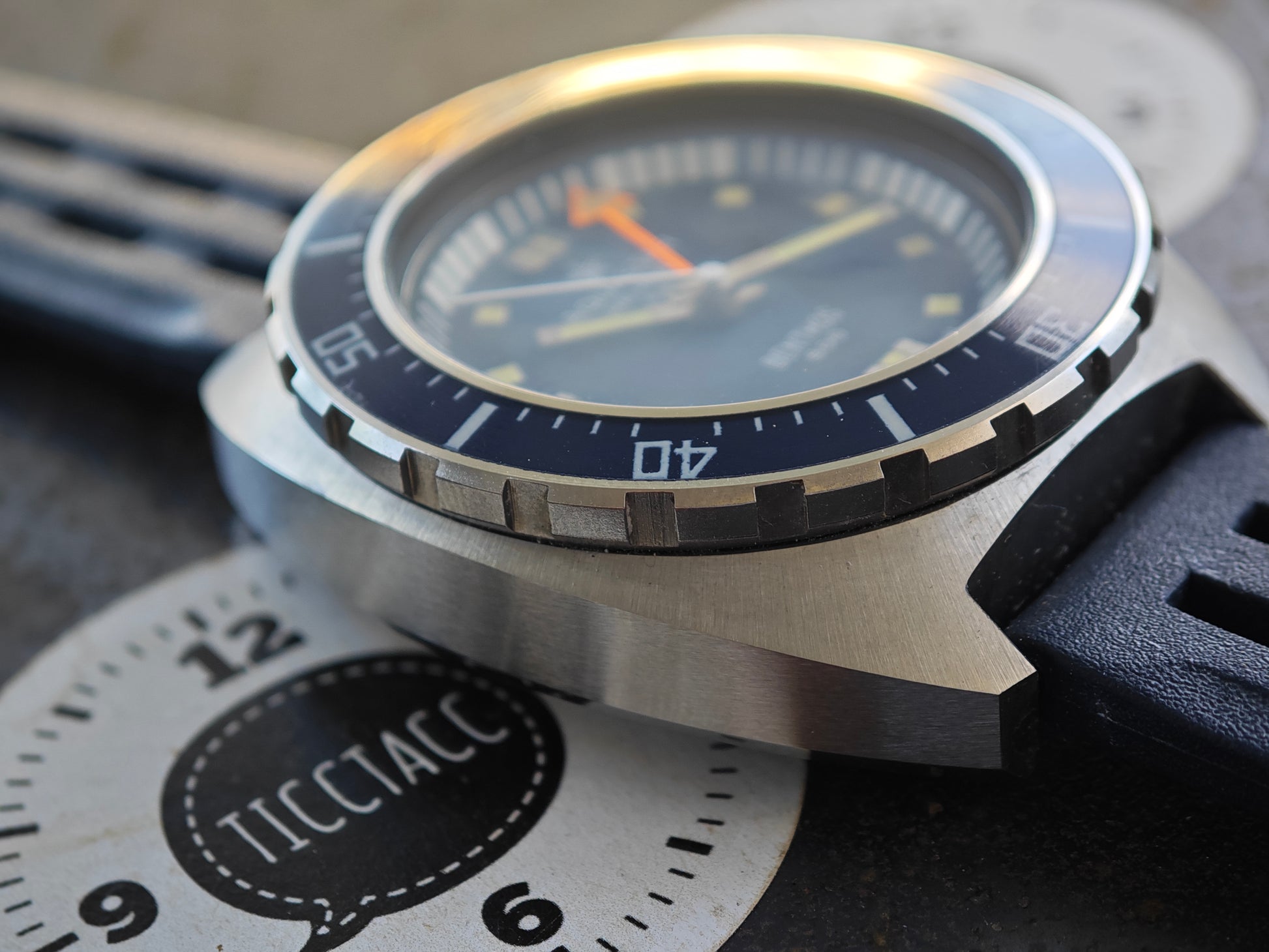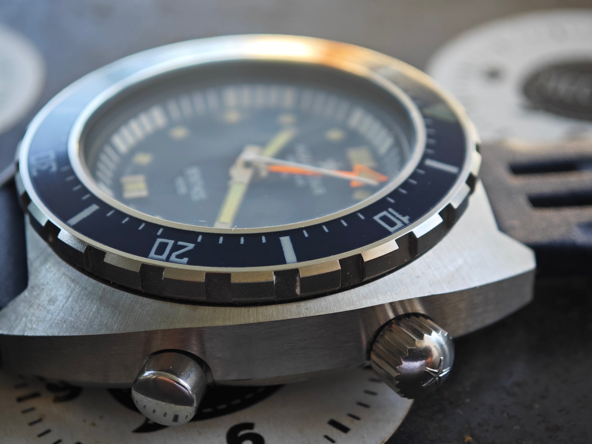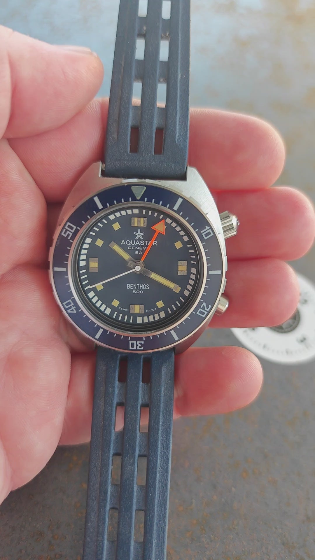 This is an extremely rare find : NEW OLD STOCK Aquastar BENTHOS 500 with Reference 1002. The watch was never used and slept in its box a long time. There are no signs of wear. If at all tiny storage wear but even with the high Resolution camera they are Not visible. All functions Work. The Minute creeping Hand as well as reset to Zero and automatic creeping again. The creeping orange Hand is continously running as it should. Screw down crown works smooth. Lume is perfect, bezel is perfect, dial is perfect. Comes on super rare original blue Aquastar Rubber Strap with Aquastar stamp and Aquastar Buckle. Strap is still smooth. Comes with original Box. Box Shows Patina outside and inside. Some Vintage smell to Box interiour. Extremly rare watch especially in such conditions it will never comes again.