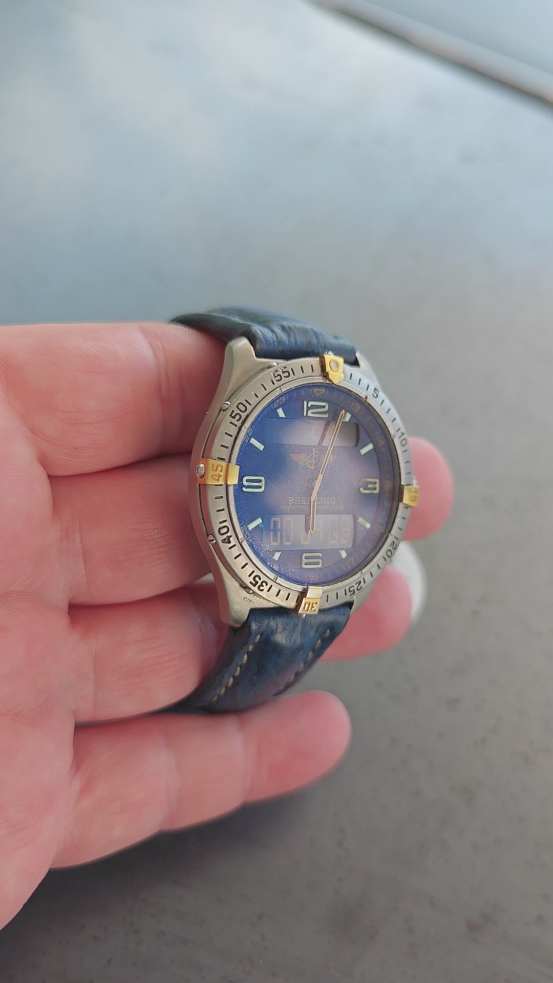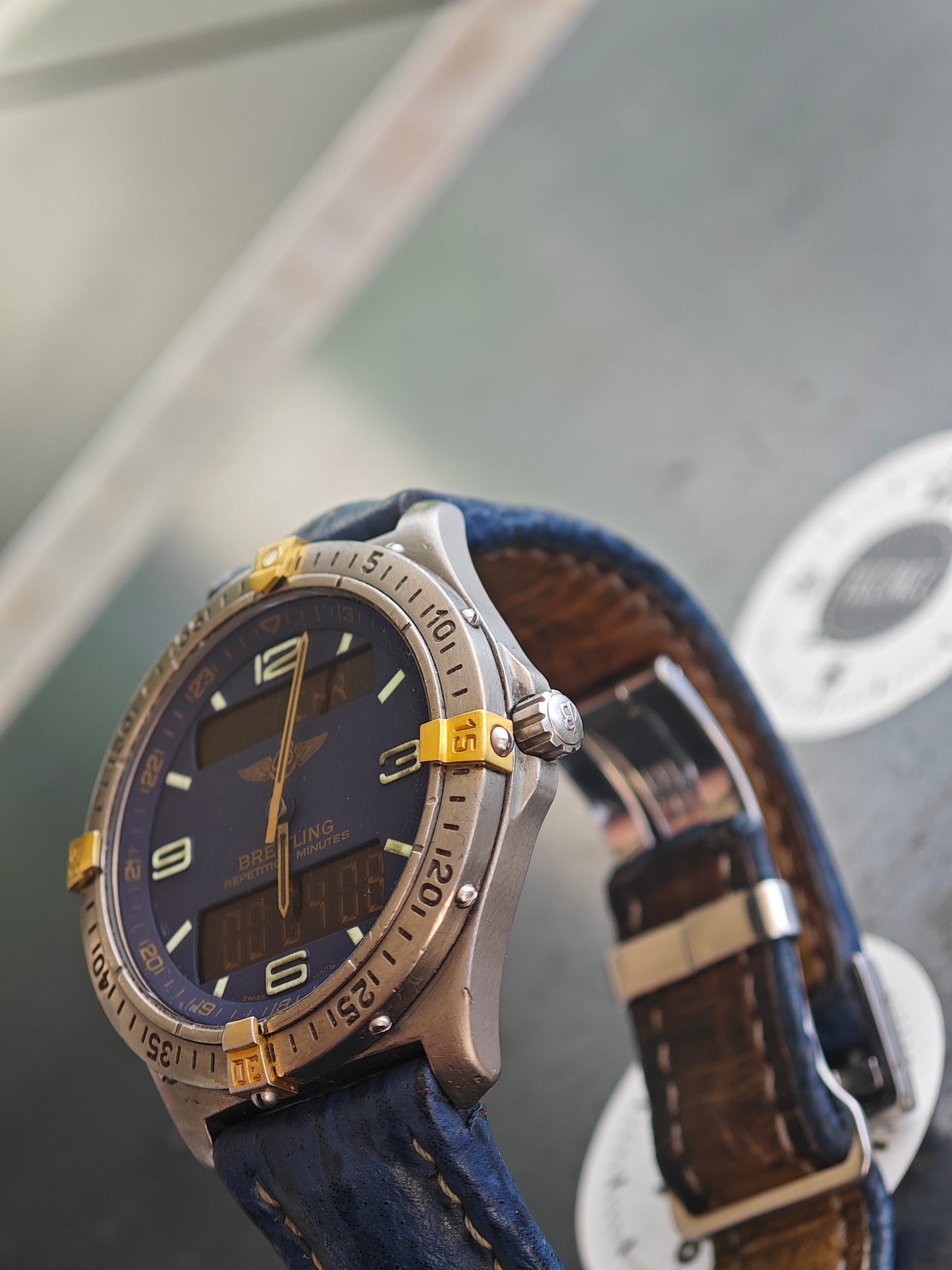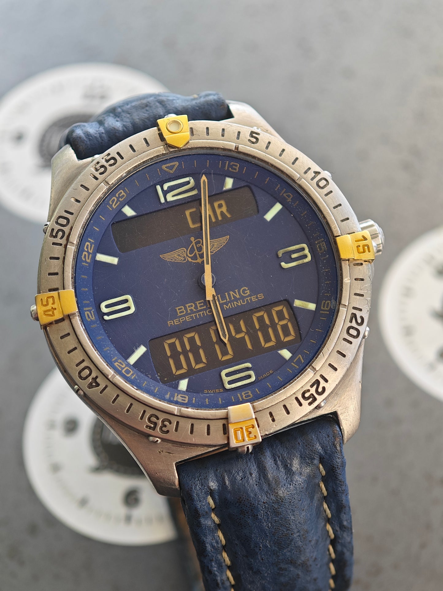 Breitling Repetiton Minutes Aerospace with deep blue dial and gold colored accents. Watch is in almost perfect conditions with only two small wear marks at case. Crystal coating still very good with only little wear. Watch comes on rare orignal Breitling leather strap in blue. Uncut. And more important on the expensive and original Breitling deployment buckle. All functions Work. Repetiton Minutes Sound as well as Chrono and Alarm viel are loud and clear. Beautiful addition to any Breitling collection.