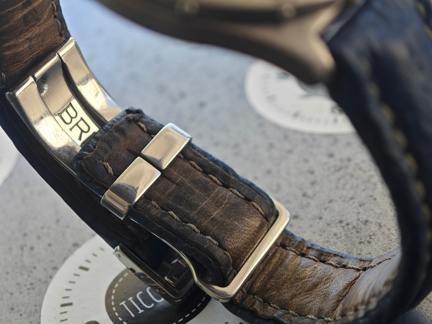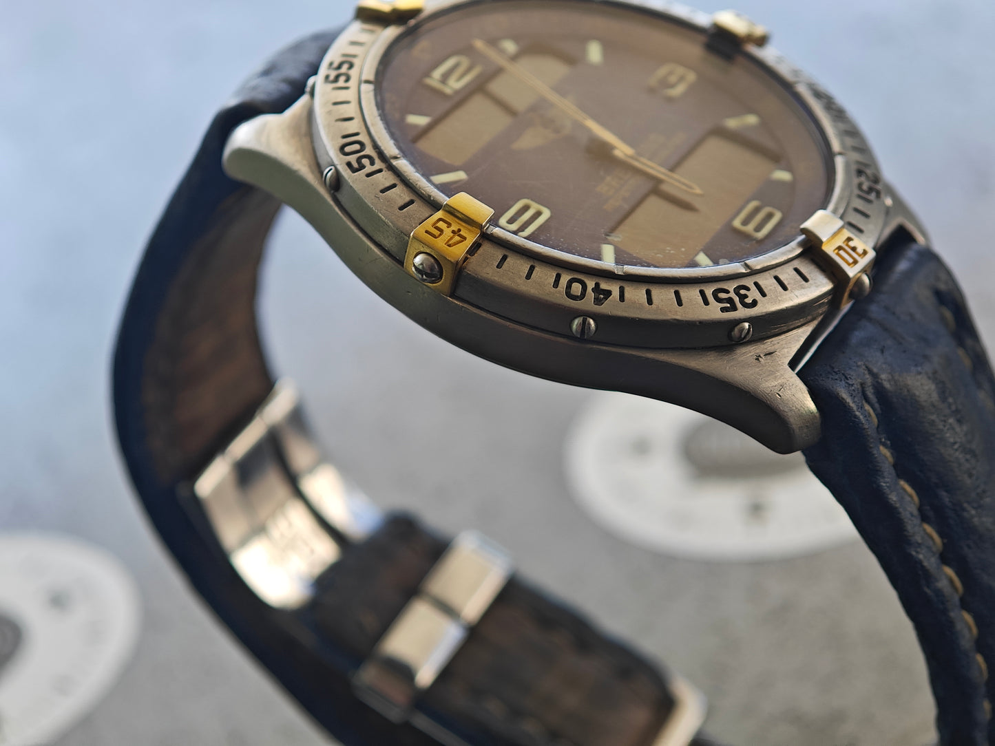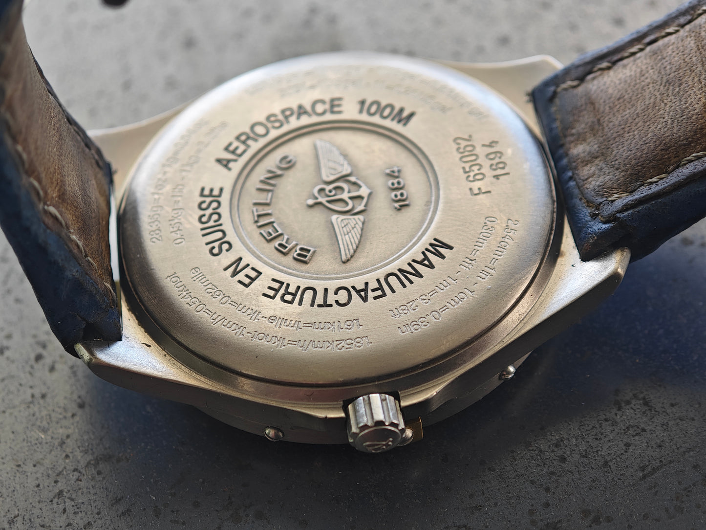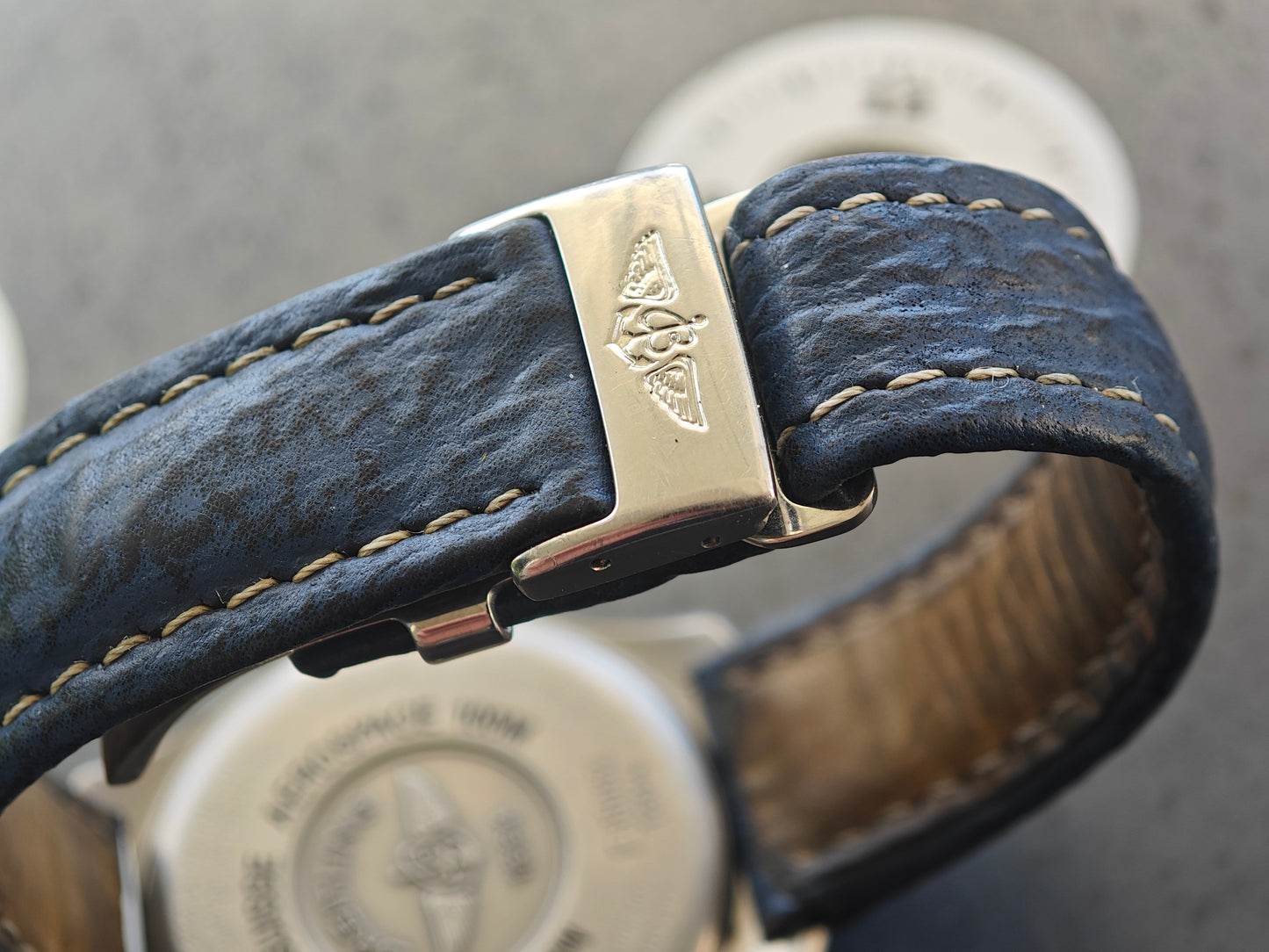 Breitling Repetiton Minutes Aerospace with deep blue dial and gold colored accents. Watch is in almost perfect conditions with only two small wear marks at case. Crystal coating still very good with only little wear. Watch comes on rare orignal Breitling leather strap in blue. Uncut. And more important on the expensive and original Breitling deployment buckle. All functions Work. Repetiton Minutes Sound as well as Chrono and Alarm viel are loud and clear. Beautiful addition to any Breitling collection.