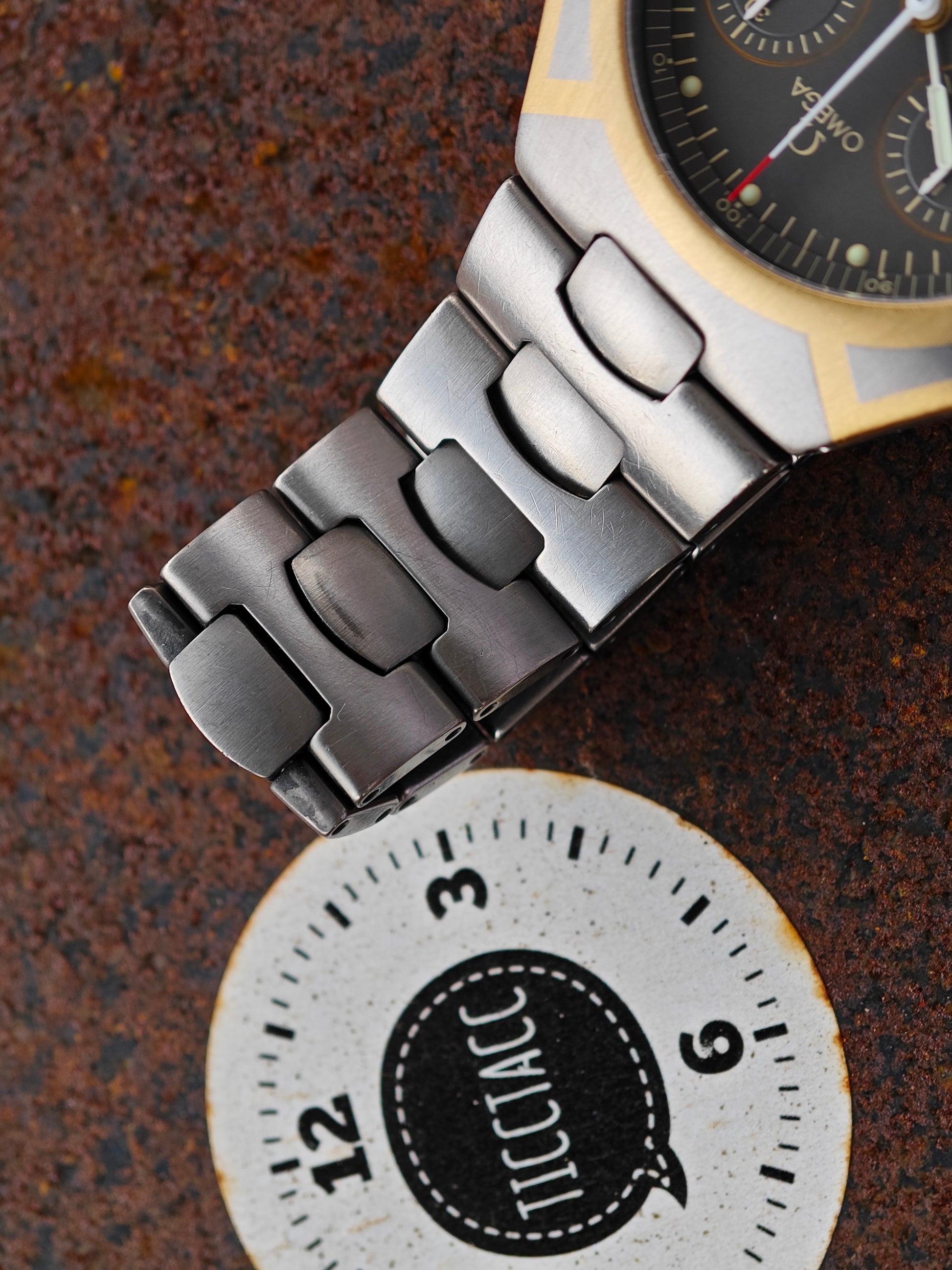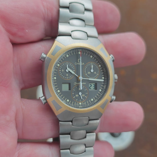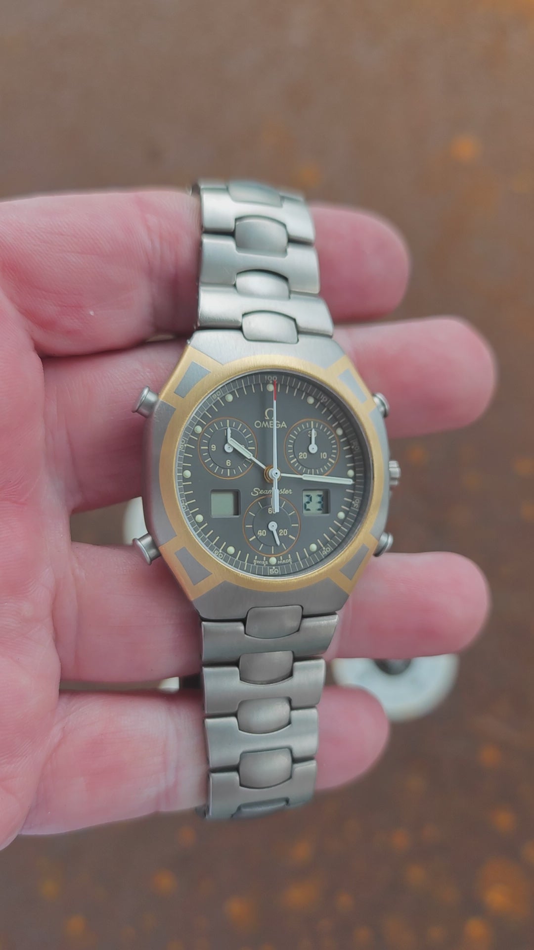 This watch is extremely rare to find in this configuration. The OMEGA SEAMASTER Polaris Chronograph with LCD Module for time measurement. This IS the rare TITANIUM Version with full Titanium bracelet. Watch IS in very good conditions with typical wear to Cmcase & bracelet. Watch IS fully working inclusive both LCD Displays. Comes on original, Very Long bracelet with a 20 cm wrist size.