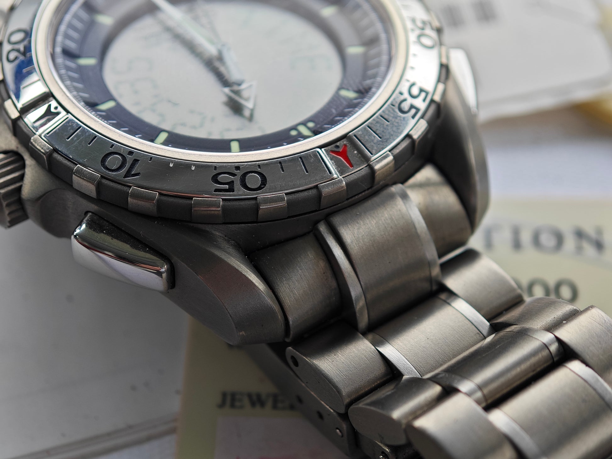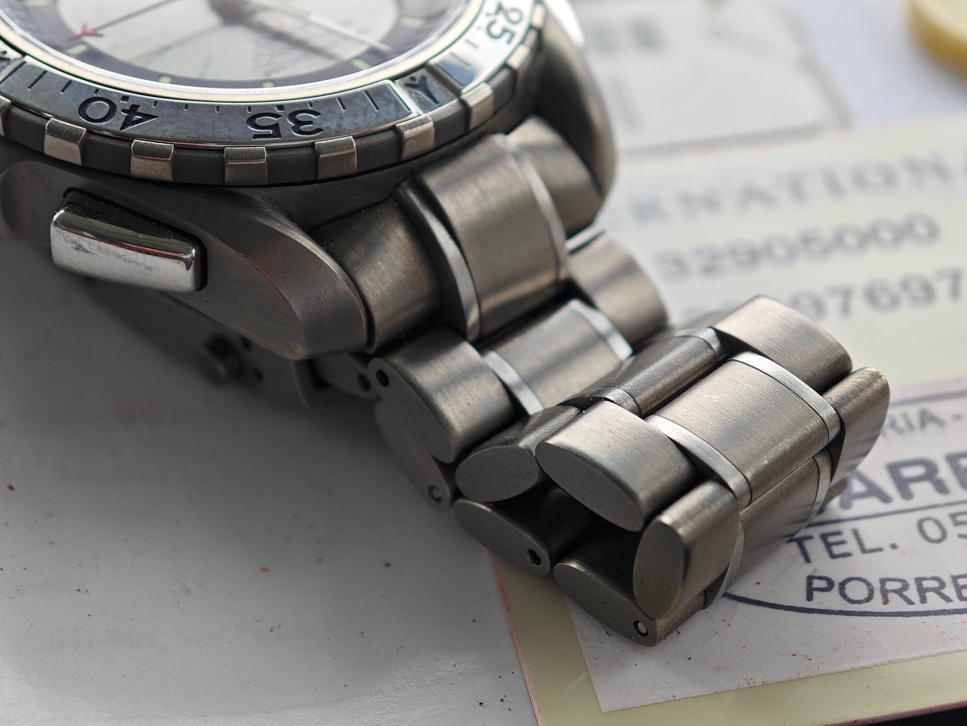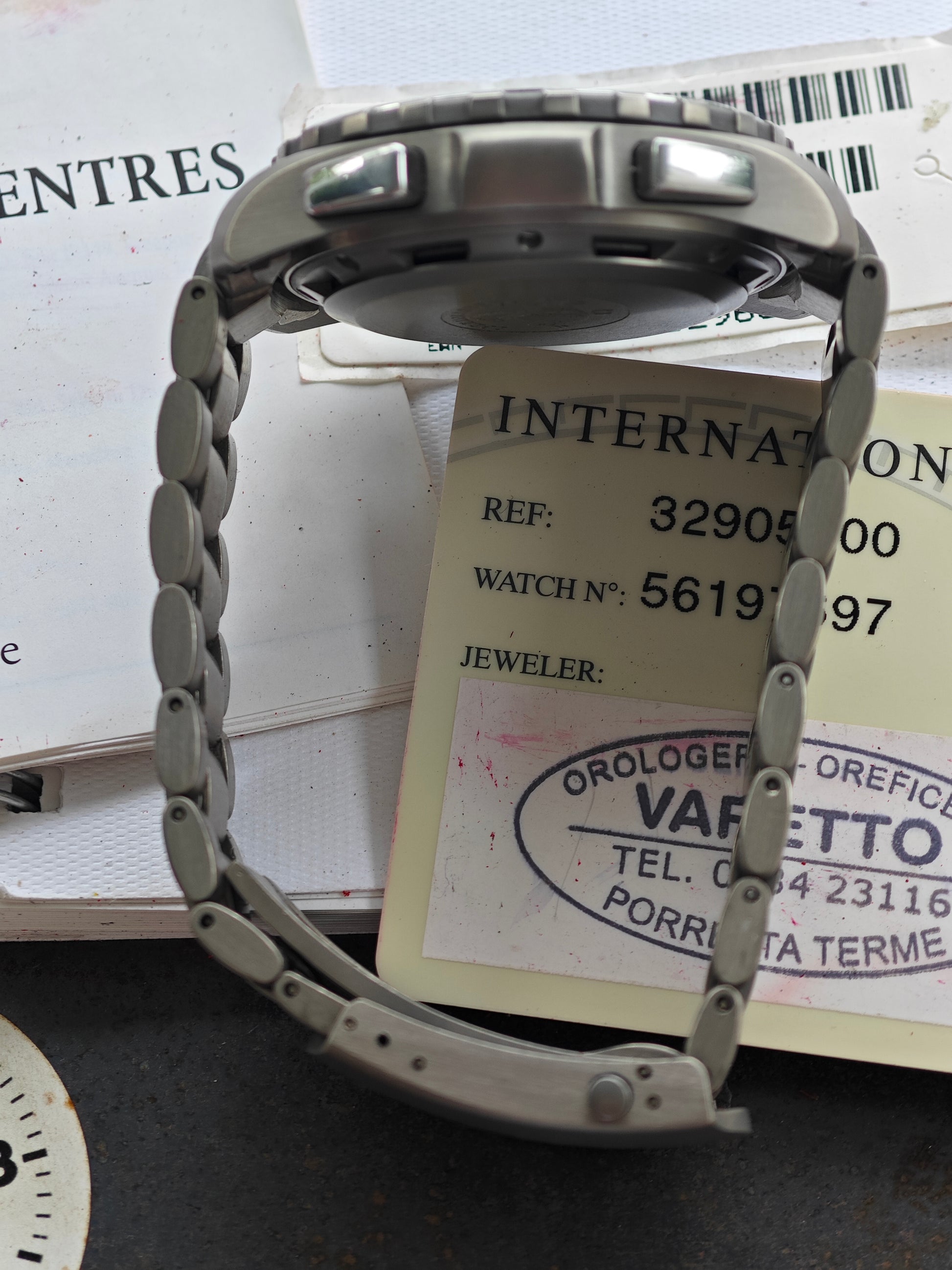 This is an ultra MINT OMEGA Speedmaster X-33 First Generation Full Set. Sold in 2011 in Italy. The watch has been really taken care of since than and you hardly can see any wear. Even the typical Titanium swirls are almost Not there. The case is super sharp as well as the bracelet. Both never polished. The watch comes on the original Titanium bracelet. The laser engarved lettering at the clasp is very sharp. The bracelet fits currently a18,7-19,0 cm wrist. Please inquire upfront for additional links if needed. All functions Work inclusive Back light and Sound. The Full Set contains the outer Box, inner Box ( typical wear to surface ; also wear to watch holder - See detailed Pictures), orignal warranty card, hang Tag and Dealers Label - all Matching Numbers with the Case serial number. Also enclosed the Manual and the Dealers list. The Card Holder in Red IS enclosed. Typical heavy wear to this holder. Its currently very hard to get auch a X-33 quality. Collectors watch & Set.