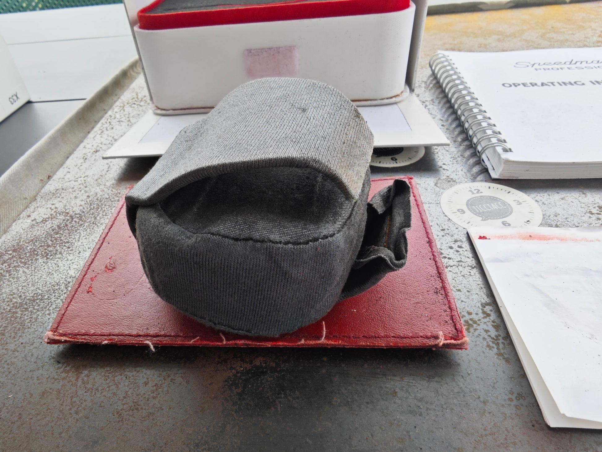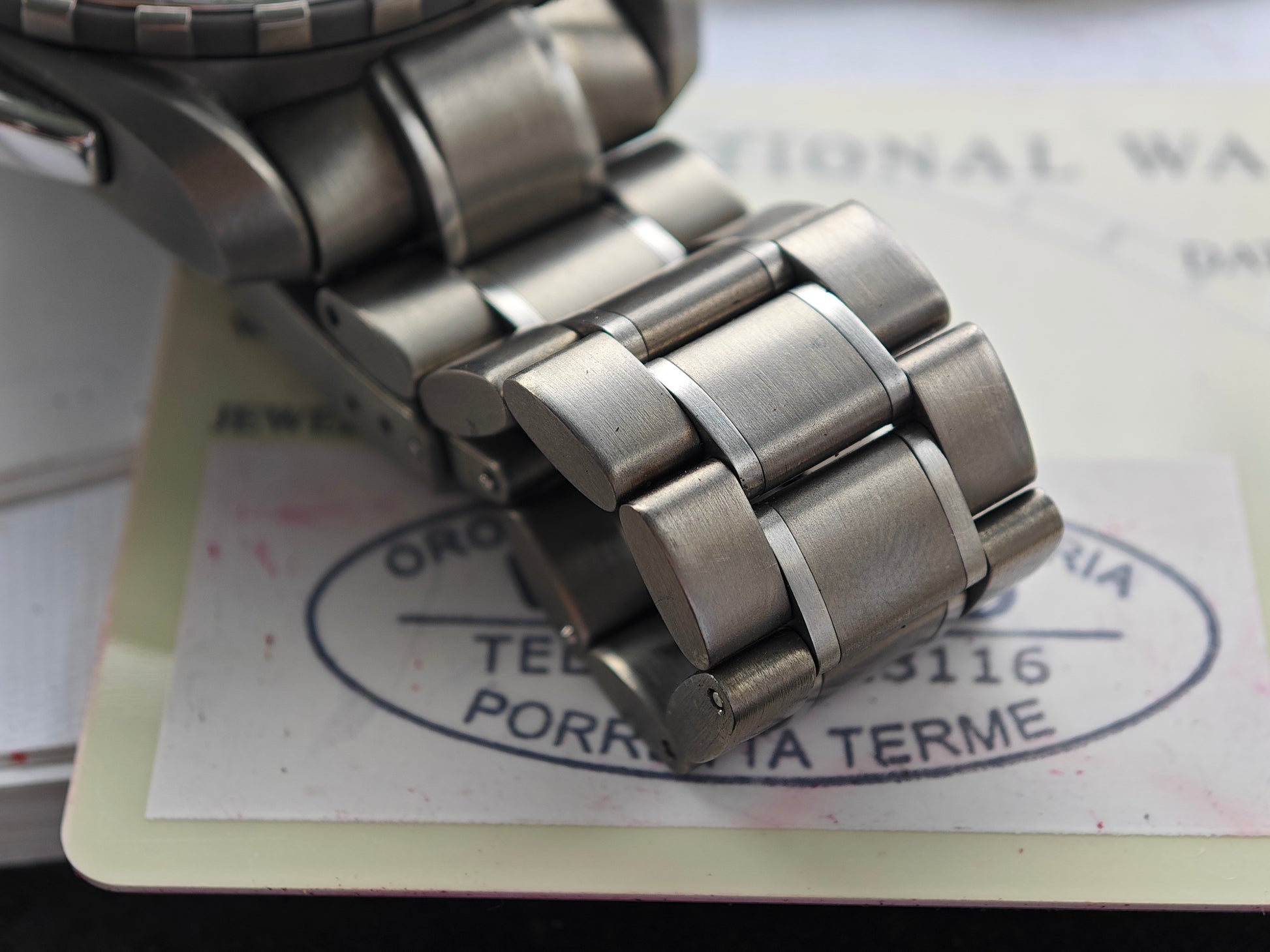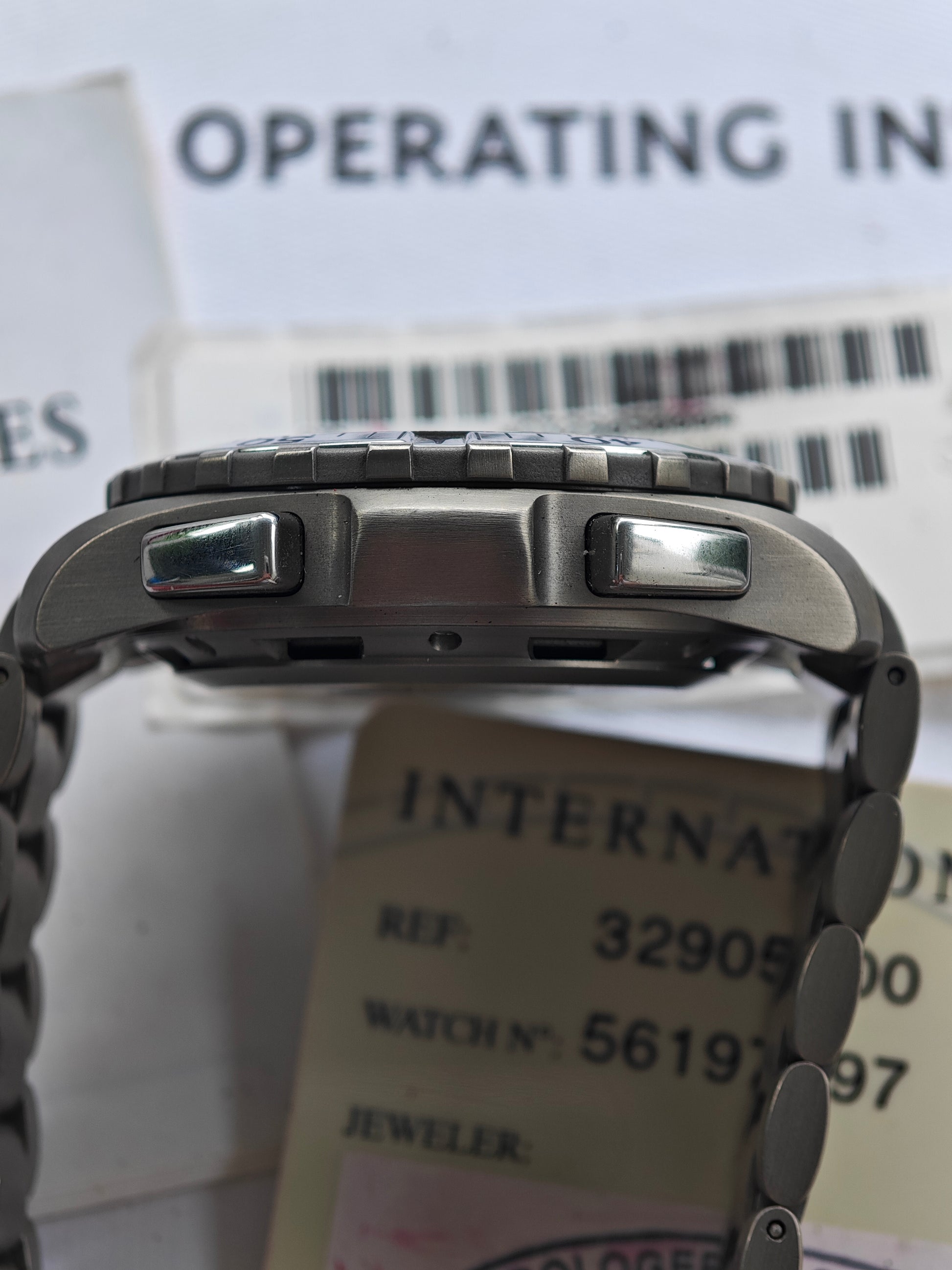 This is an ultra MINT OMEGA Speedmaster X-33 First Generation Full Set. Sold in 2011 in Italy. The watch has been really taken care of since than and you hardly can see any wear. Even the typical Titanium swirls are almost Not there. The case is super sharp as well as the bracelet. Both never polished. The watch comes on the original Titanium bracelet. The laser engarved lettering at the clasp is very sharp. The bracelet fits currently a18,7-19,0 cm wrist. Please inquire upfront for additional links if needed. All functions Work inclusive Back light and Sound. The Full Set contains the outer Box, inner Box ( typical wear to surface ; also wear to watch holder - See detailed Pictures), orignal warranty card, hang Tag and Dealers Label - all Matching Numbers with the Case serial number. Also enclosed the Manual and the Dealers list. The Card Holder in Red IS enclosed. Typical heavy wear to this holder. Its currently very hard to get auch a X-33 quality. Collectors watch & Set.