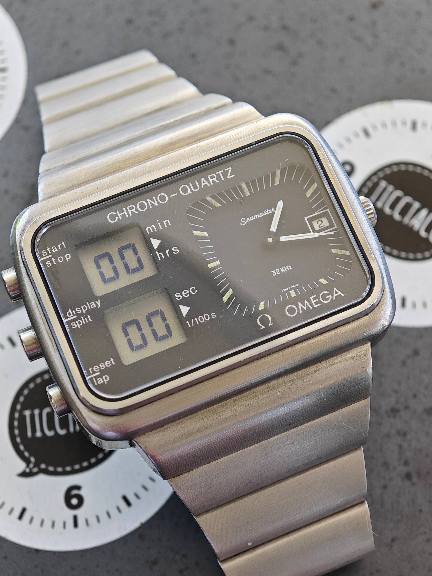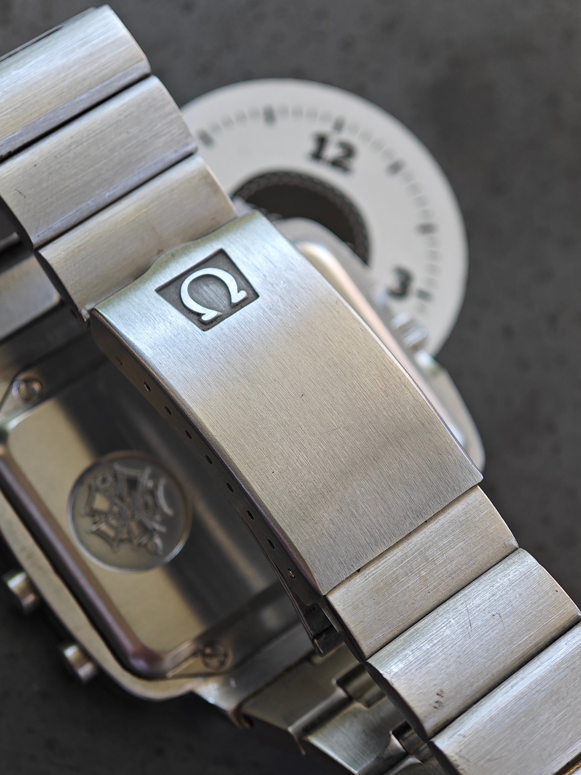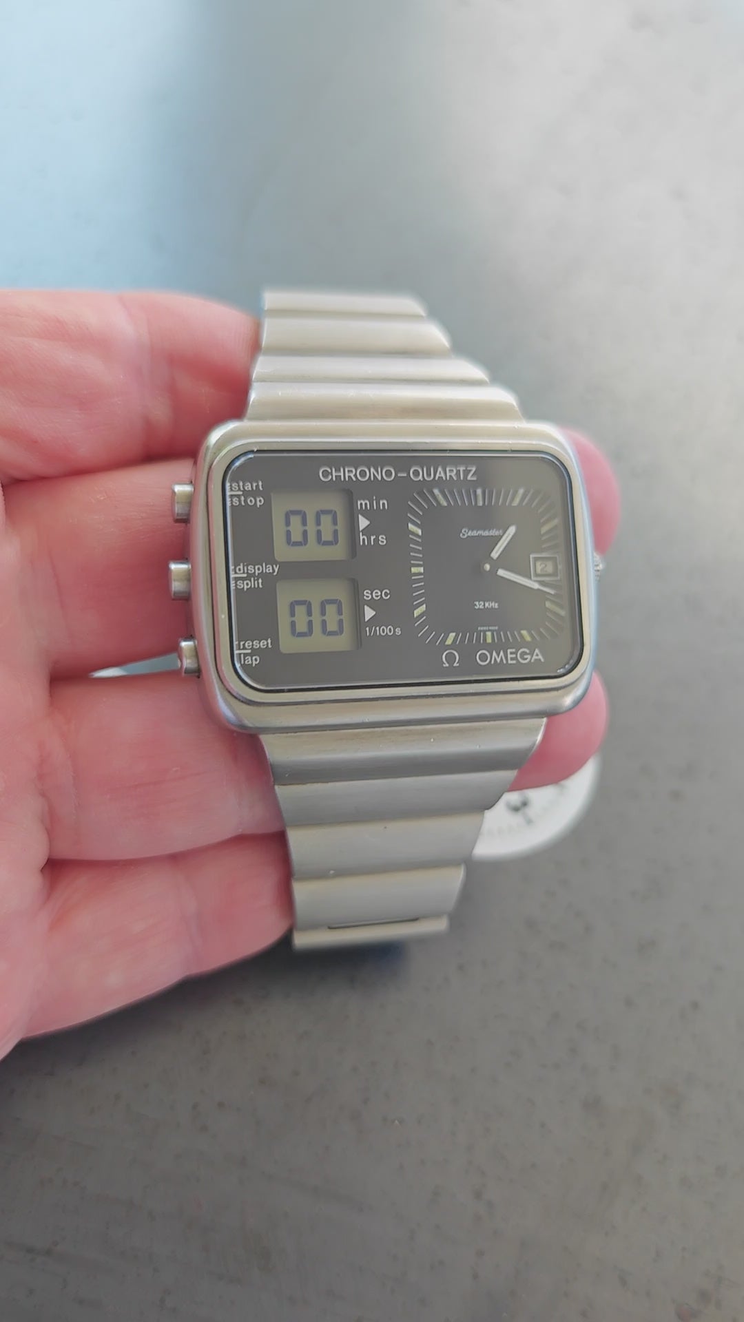 Beautiful and very Clean OMEGA Chrono Quartz. Launched for the Olympic Games in 1976 Montreal. The watch is currently hard to find in this quality. The watch still has its original bracelet . Not the poor service bracelet with thinner links. The bracelet fits now 18,0 cm wrist size - please inquire for additional links If you need more. The watch was serviced and the following parts have been exchanged - Main sealing was cleaned Out of the Case Back and has been replaced by an OMEGA one, the step engine was replaced by original OMEGA ( this is today by far the most expensive part in this watch!), The clasp as exchanged for a NOS, original OMEGA one. The watch is in very good conditions . Case, bracelet , Case Back, Dial, hands, Push Buttons, Crystal, dial in black, crown and and and are all in really nice conditions. A real gem to be worn daily.