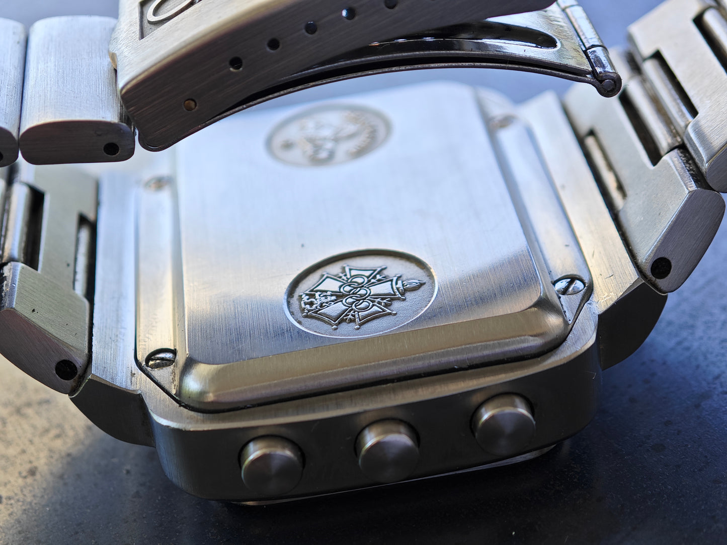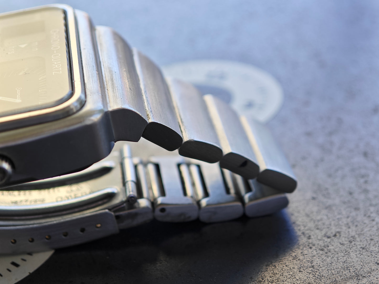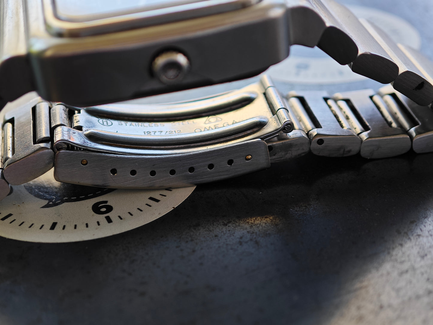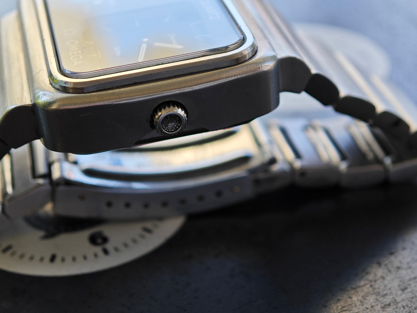 Beautiful and very Clean OMEGA Chrono Quartz. Launched for the Olympic Games in 1976 Montreal. The watch is currently hard to find in this quality. The watch still has its original bracelet . Not the poor service bracelet with thinner links. The bracelet fits now 18,0 cm wrist size - please inquire for additional links If you need more. The watch was serviced and the following parts have been exchanged - Main sealing was cleaned Out of the Case Back and has been replaced by an OMEGA one, the step engine was replaced by original OMEGA ( this is today by far the most expensive part in this watch!), The clasp as exchanged for a NOS, original OMEGA one. The watch is in very good conditions . Case, bracelet , Case Back, Dial, hands, Push Buttons, Crystal, dial in black, crown and and and are all in really nice conditions. A real gem to be worn daily.
