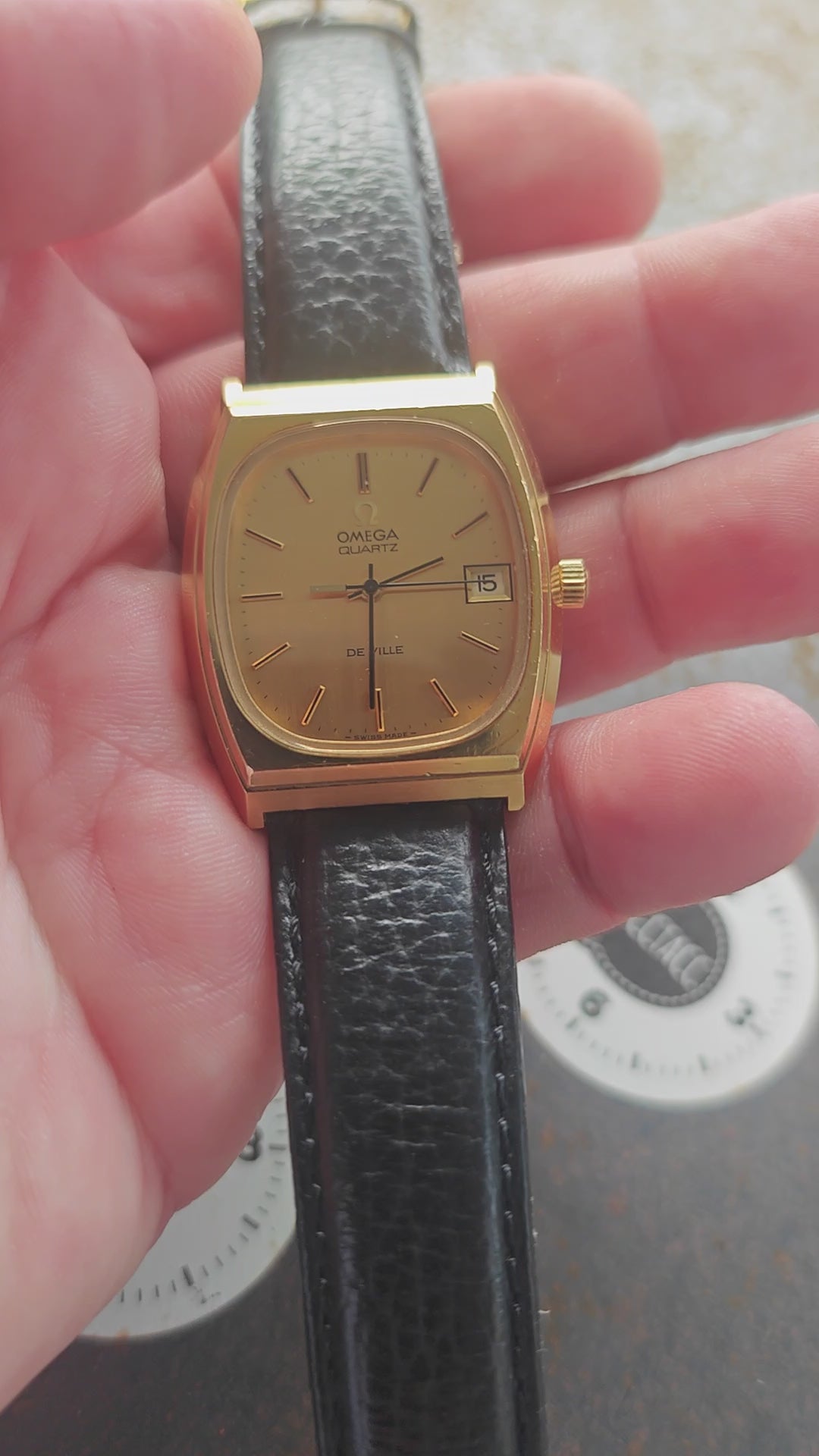 Very Classical OMEGA DeVille Quartz in the gold plated Version. Plating still very good with only minor, typical wear to Case and Case Back. The watch has teh famous Caliber 1342 inside with a Push crown to Set the Minute Hand by letting the second Hand rotate. The watch comes on a black leather strap in good conditions with a neutral gold colored Buckle.