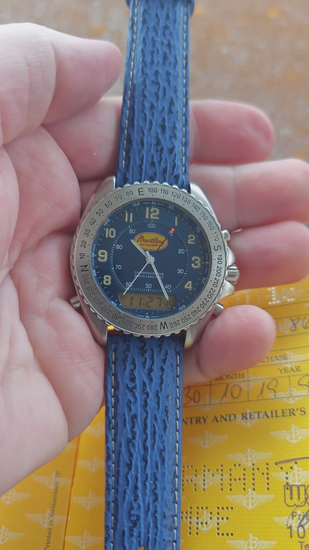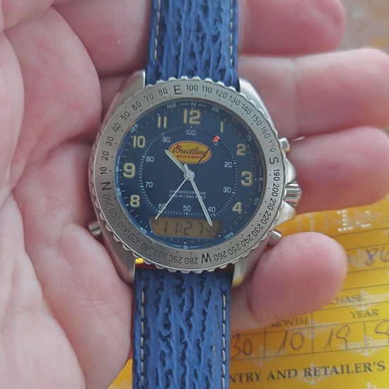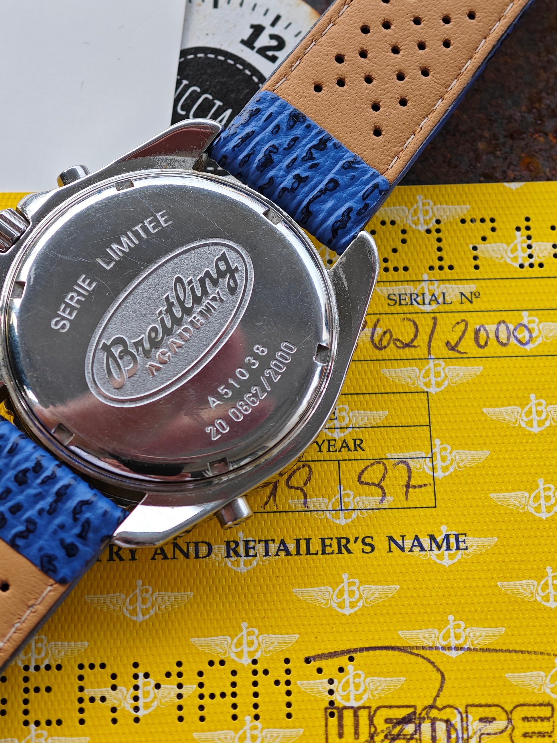 As a final and Limited series, Breitling produced 2000 Breitling Academy pieces. This is one of it with number 0862. The watch is in super top conditions. Comes with orignal papers, stamped in Germany in 1997 and other paperwork. Brand new shark skin Strap enclosed - extremly high quality - Higher than the original Breitling one. Collectors Item. For Pilots and Flight Enthusiast. On buyers requests we can Exchange the original Crystal If desired. For free.