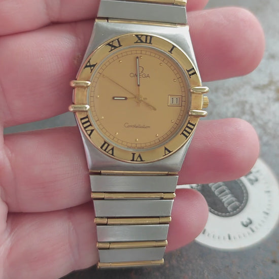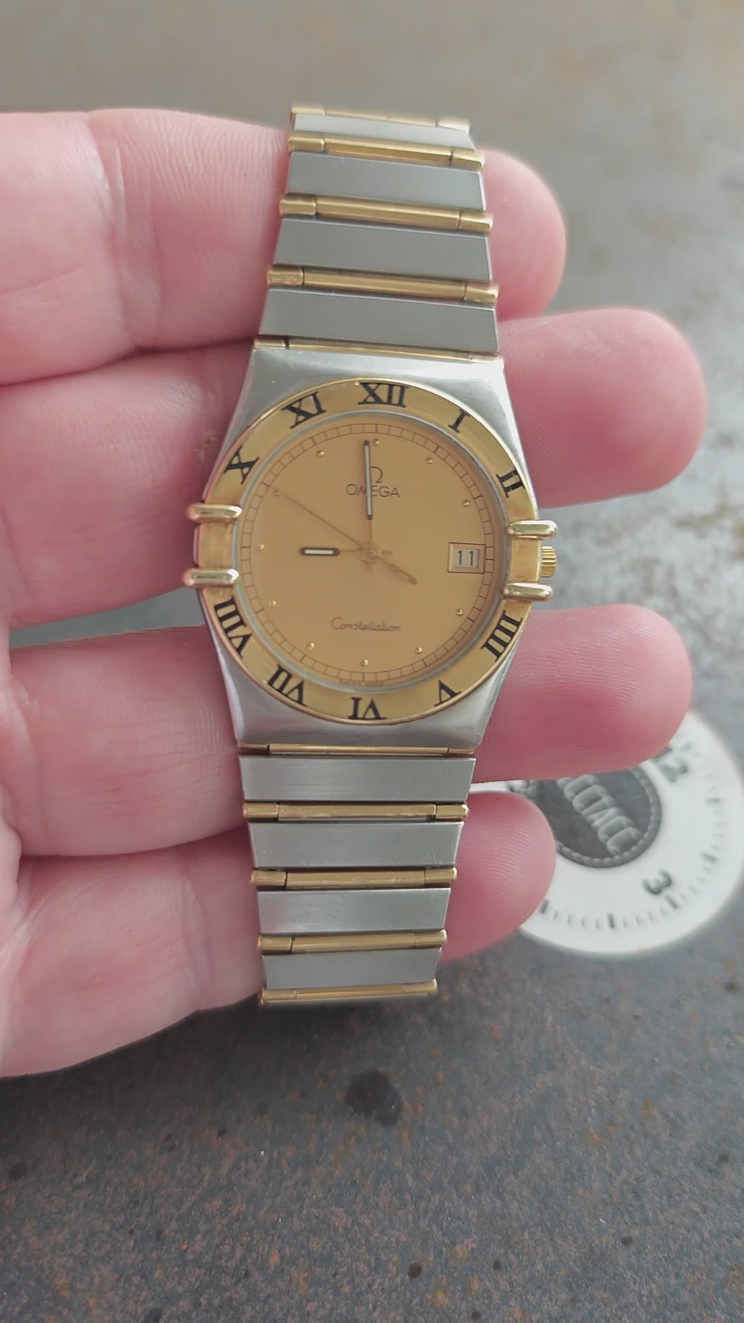 Very Clean OMEGA Constellation Manhattan with gold colored dial and golden bezel. Printing on bezel in still good conditions . Watch wslwas available at that time with stainless Steel bracelet or Bicolor bracelet with gold side shells or golden Side sheels and golden middle Bars. Here we have the variation with golden Side sheels AND golden middle bars. These bracelets are rare and have been already expensive in the 80s. The wrist size is about 18,5-19,0 cm. We have more links in stock please inquire - they are worth a fortune with the current gold price. The watch had a recently service by us and the second wheel and battery have been exchanged. Original OMEGA 1430 movement !