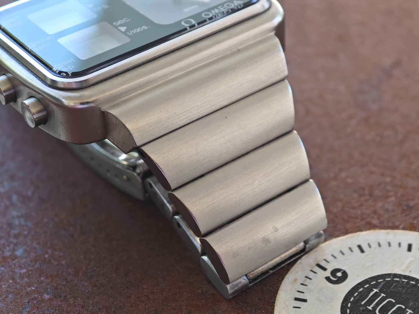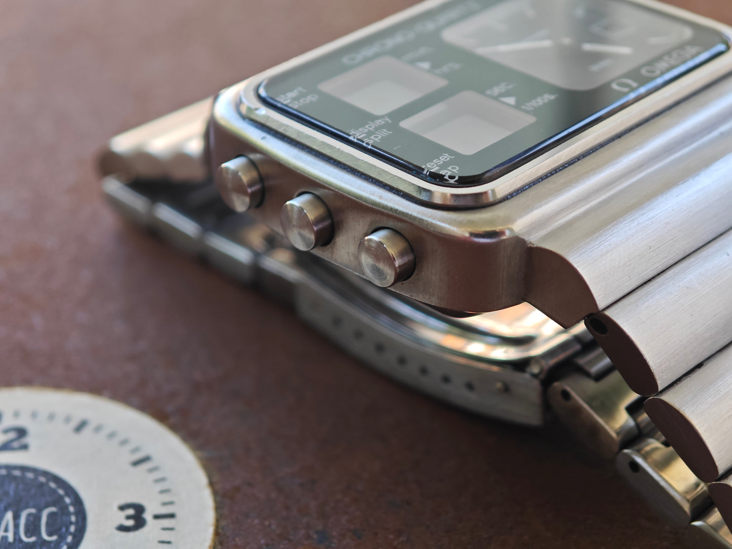 Beautiful and very Clean OMEGA Chrono Quartz. Launched for the Olympic Games in 1976 Montreal. The watch is currently hard to find in this quality. The watch still has its original bracelet . Not the poor service bracelet with thinner links. The bracelet fits now 18,5 cm wrist size - please inquire for additional links If you need more. The watch was serviced and the following parts have been exchanged - Main sealing was cleaned Out of the Case Back and has been replaced by an OMEGA one, the step engine was replaced by original OMEGA ( this is today by far the most expensive part in this watch!), one battery contact was replaced (Hand made), 1 Case Back screw was replaced, new batteries have been installed. The watch is in very good conditions . Case, bracelet , Case Back, Dial, hands, Push Buttons, Crystal, dial in black, crown and and and are all in really nice conditions. A real gem to be worn daily.