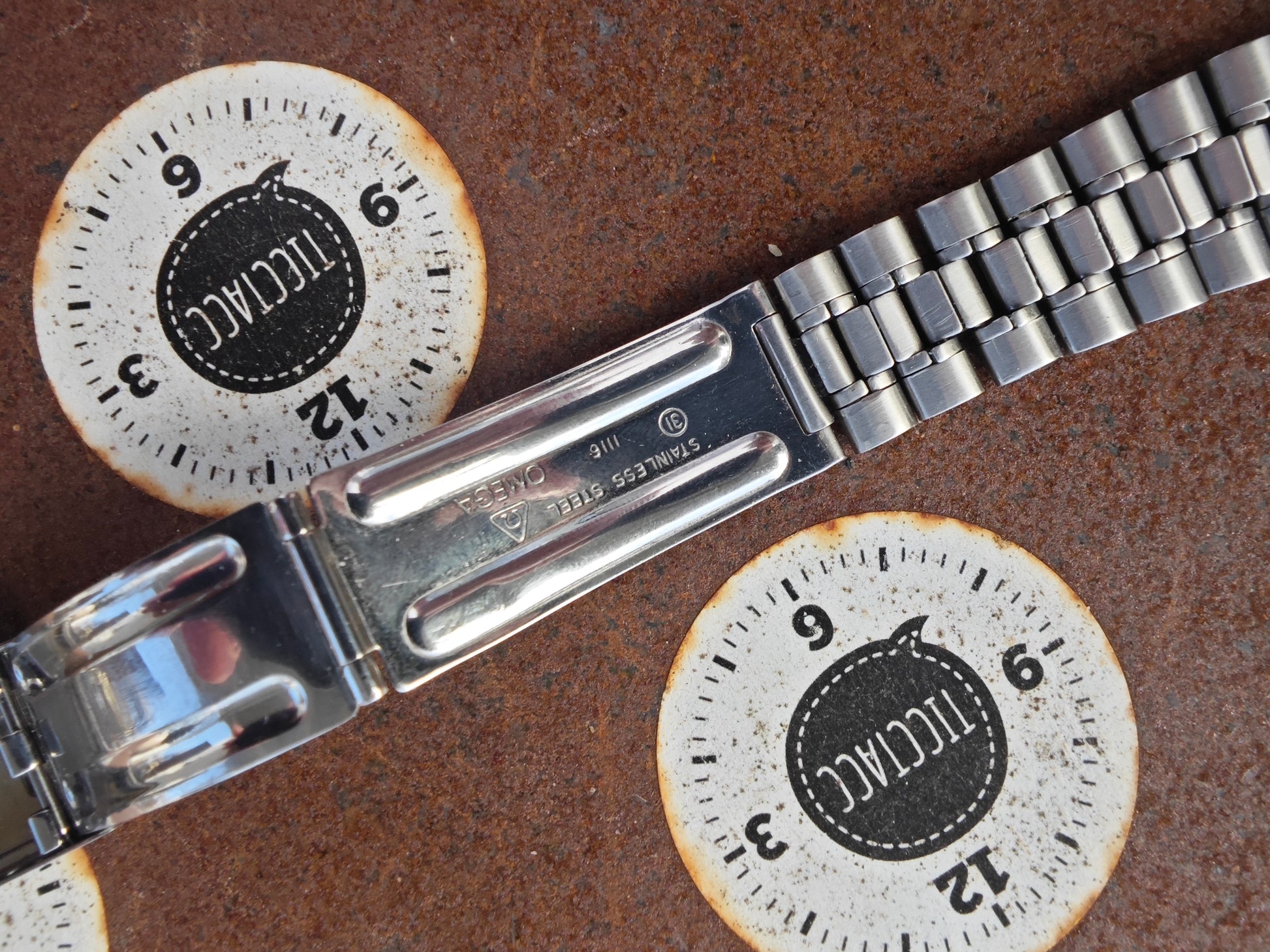 OMEGA Speedmaster bracelet 1116 with 575 Endlinks. The bracelet has been carefully refurbished. Bracelet is Vintage, end links likely service end links. Length is 17cm closed with 20mm end links. Bracelet does close tight.