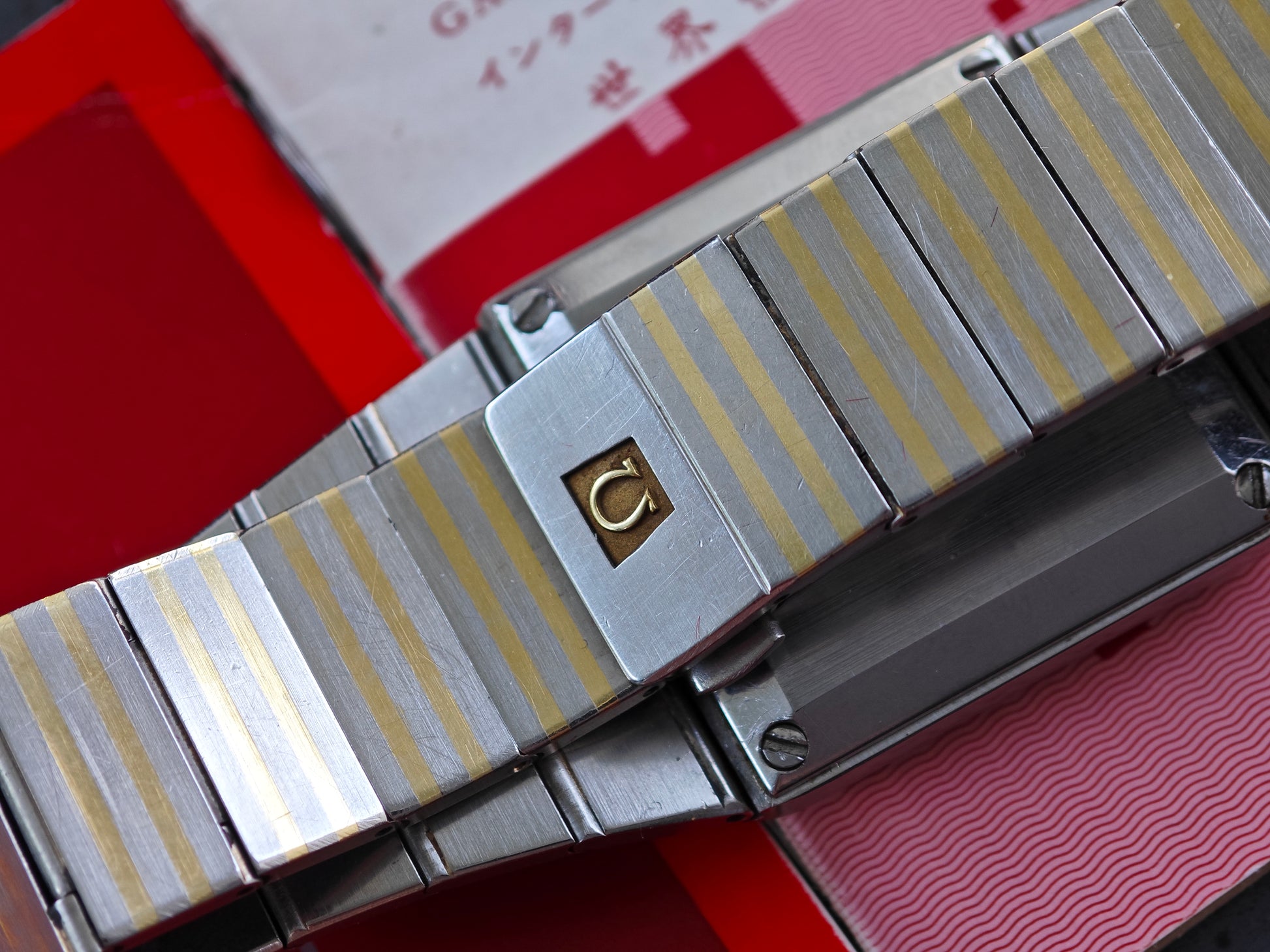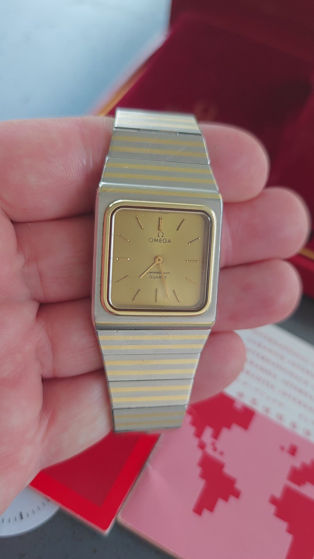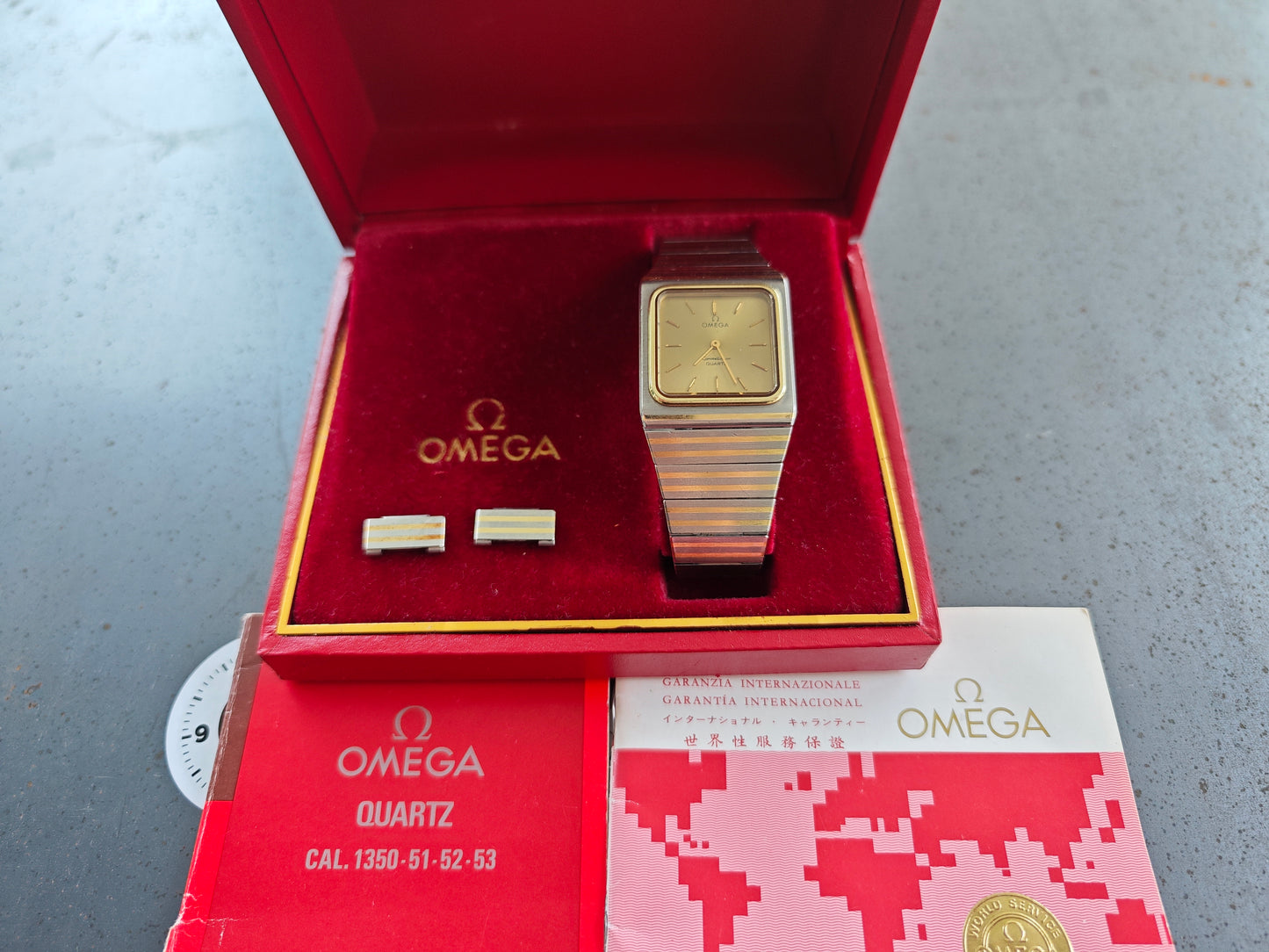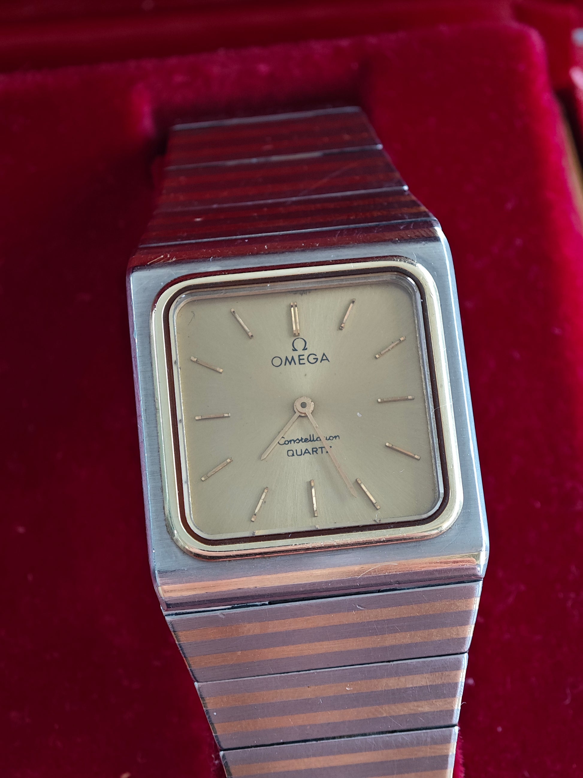 One of the rarest Constellation watches - the OMEGA Constellation Buccaneer - super rare with gold colored dial - about 99/100 watches come with black dial. The watch has integrated soolid gold by OMEGAs sinterinf Technology. The watch comes as FULL SET with ultra rare Box and all papers. Dating Back to February 1980. Bracelet is still in very good conditions with only superficial wear. If you have Seen These bracelet Being 40-50 years old - they normally have heavy wear. The has 17 cm wrist size with two more element on top. So the watch will fit approx. 18,0-18,5 cm wrist size. Collectors Conditions Watch!