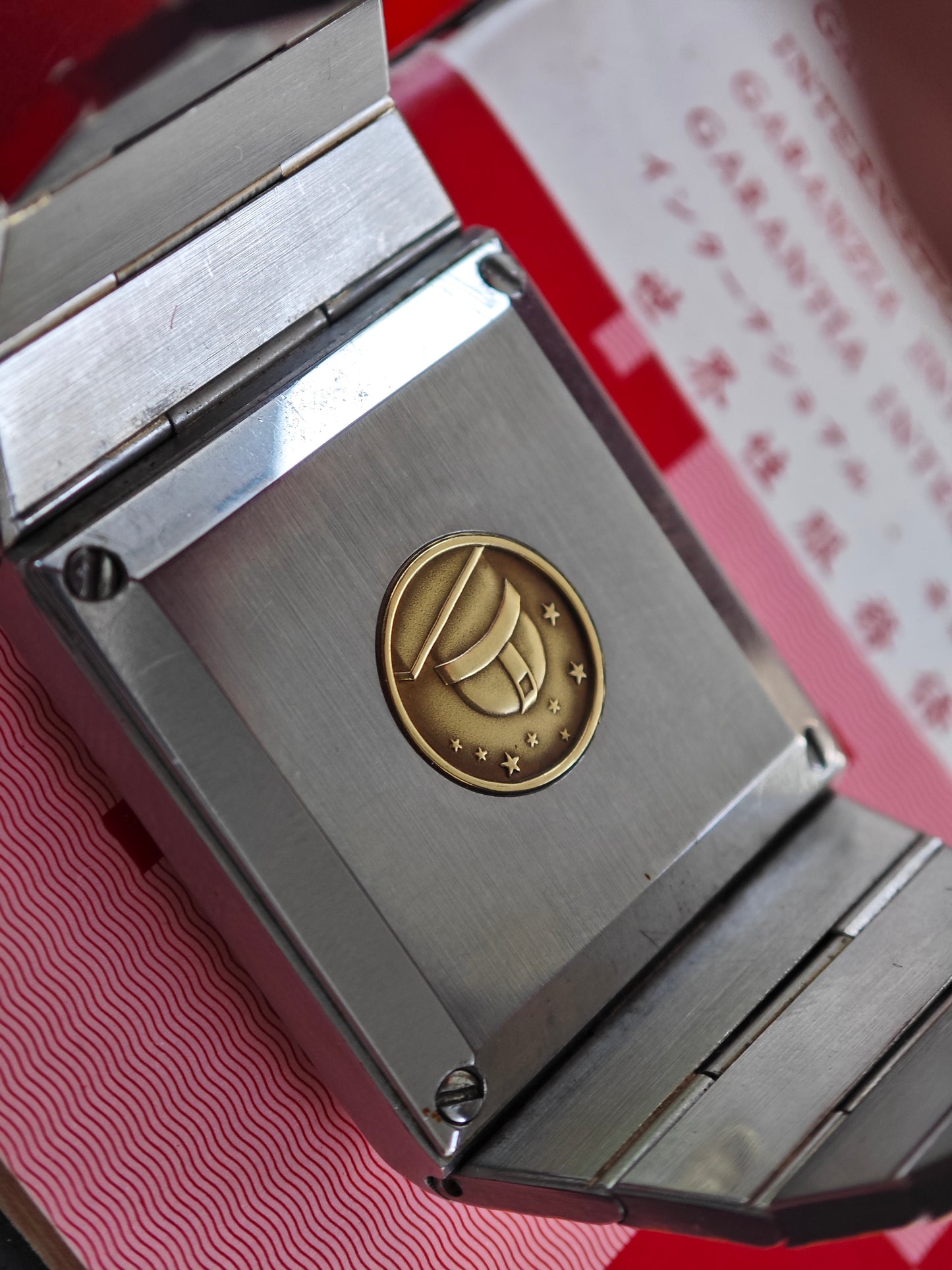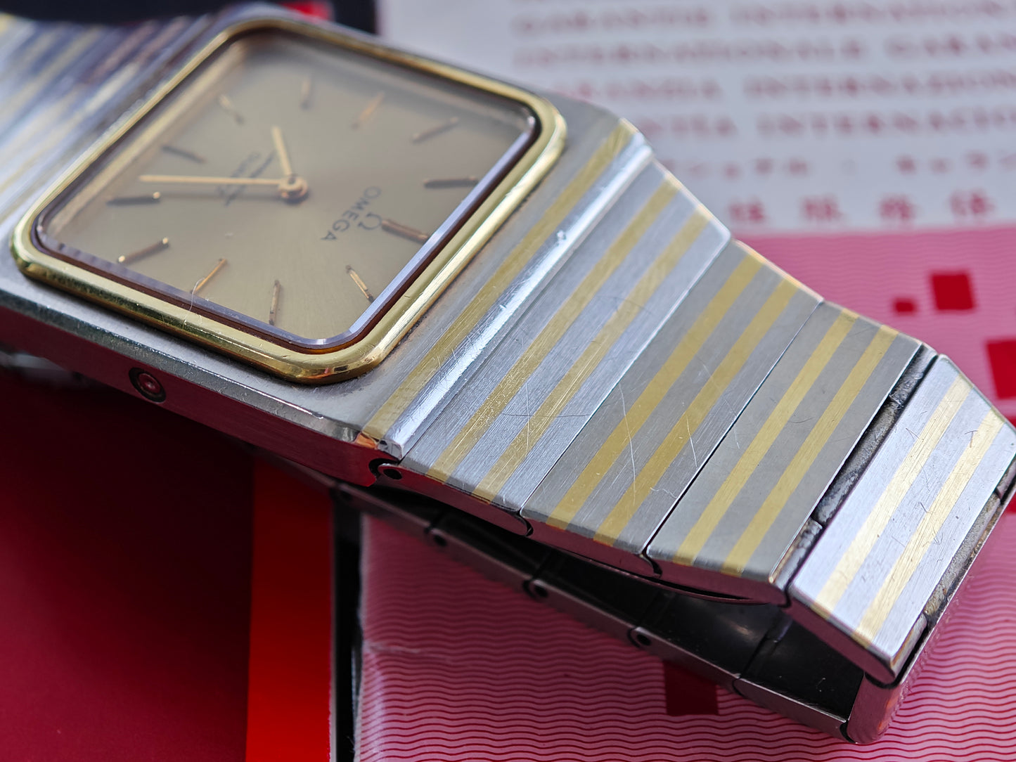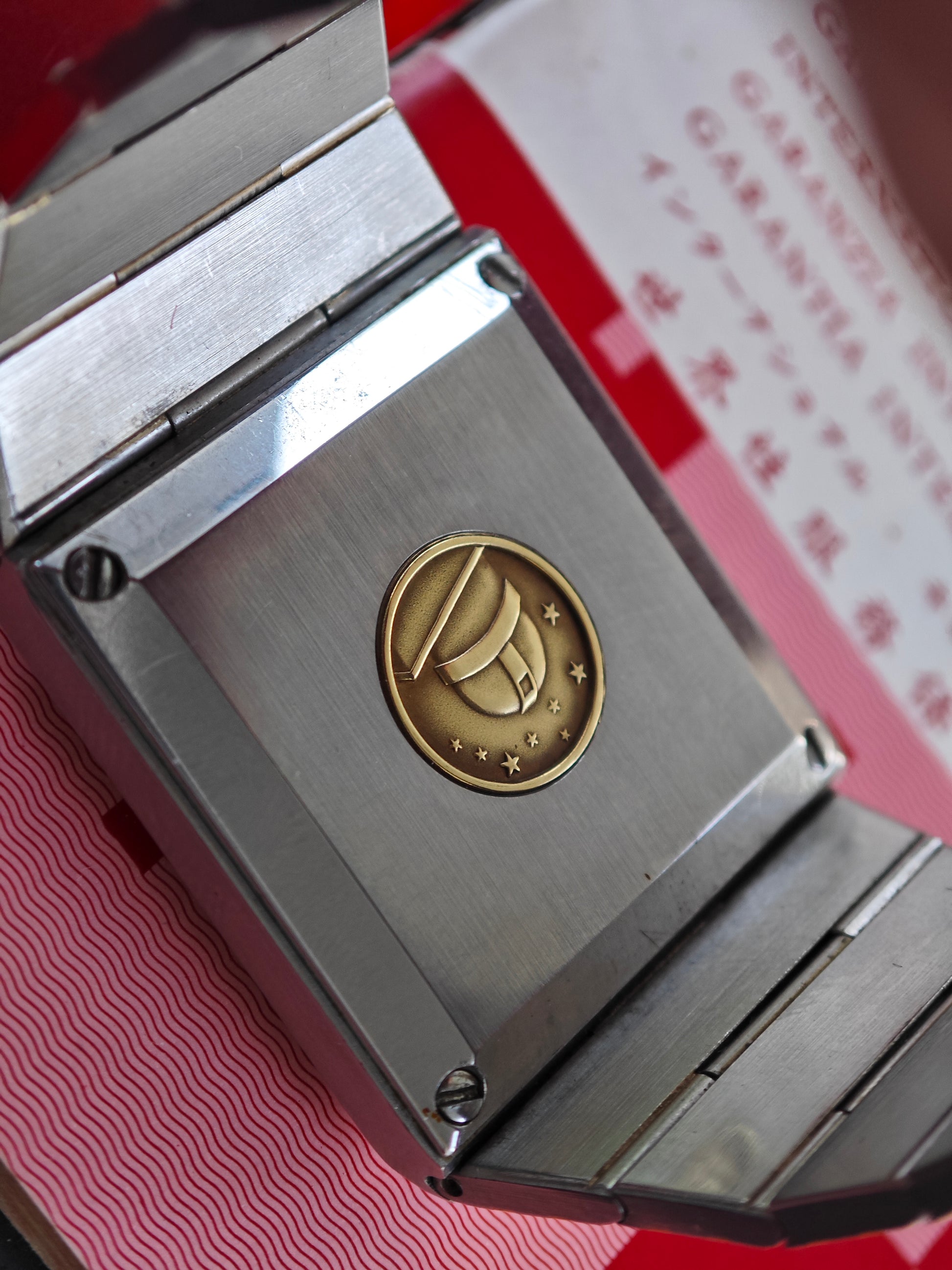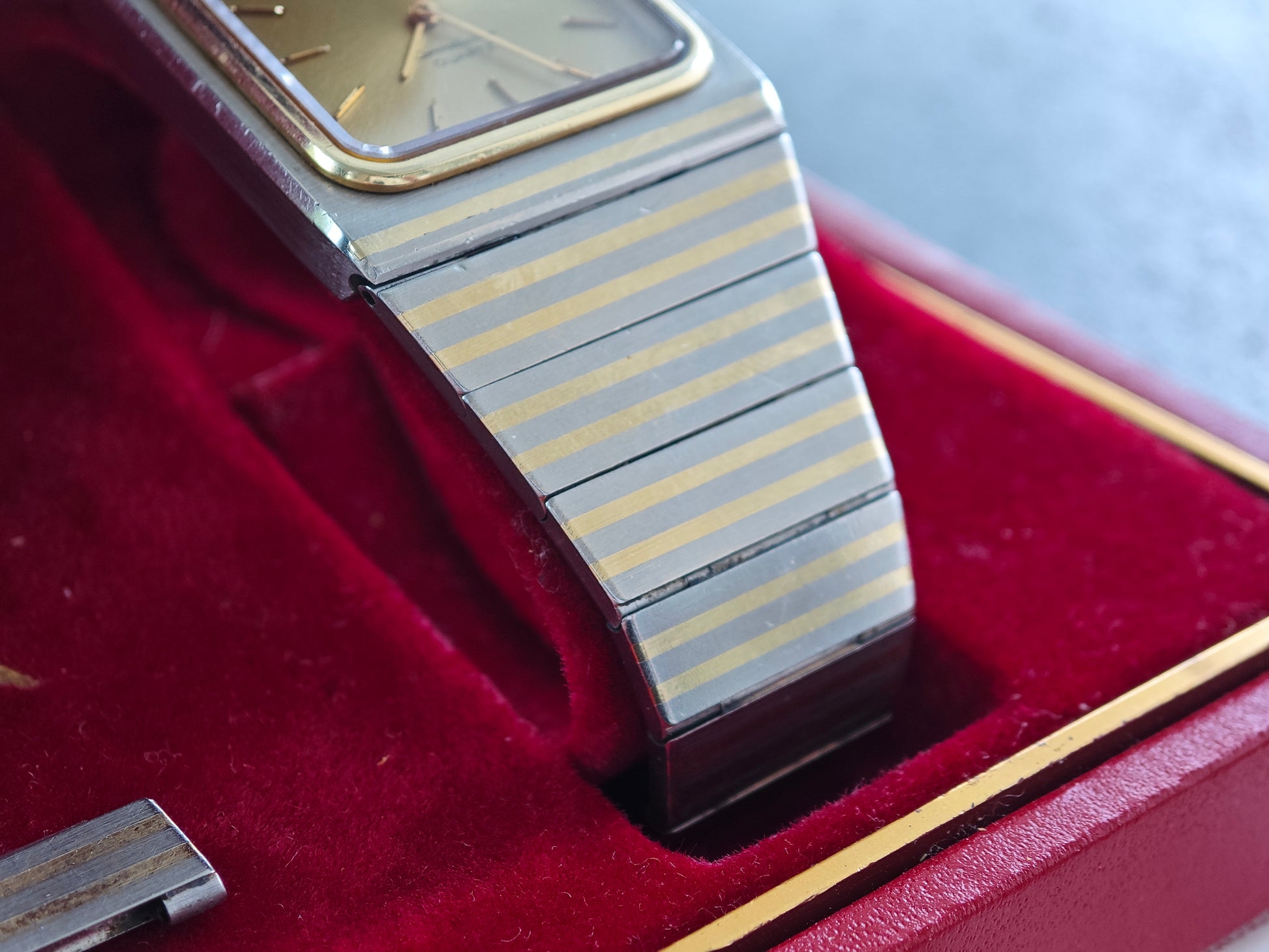 One of the rarest Constellation watches - the OMEGA Constellation Buccaneer - super rare with gold colored dial - about 99/100 watches come with black dial. The watch has integrated soolid gold by OMEGAs sinterinf Technology. The watch comes as FULL SET with ultra rare Box and all papers. Dating Back to February 1980. Bracelet is still in very good conditions with only superficial wear. If you have Seen These bracelet Being 40-50 years old - they normally have heavy wear. The has 17 cm wrist size with two more element on top. So the watch will fit approx. 18,0-18,5 cm wrist size. Collectors Conditions Watch!