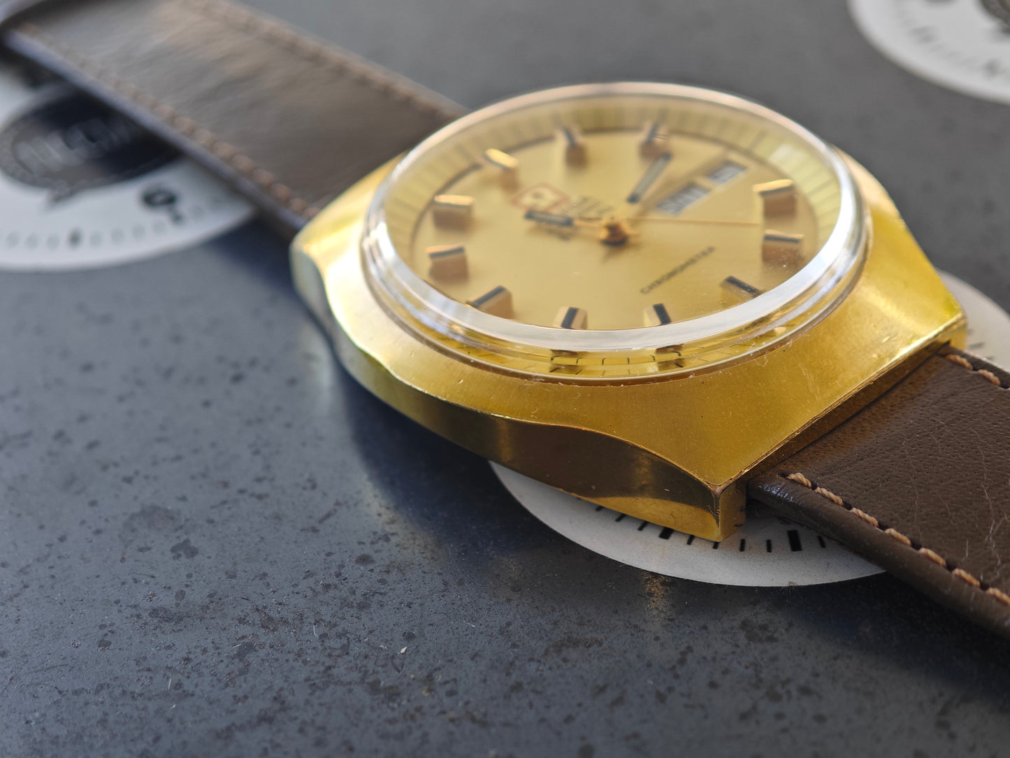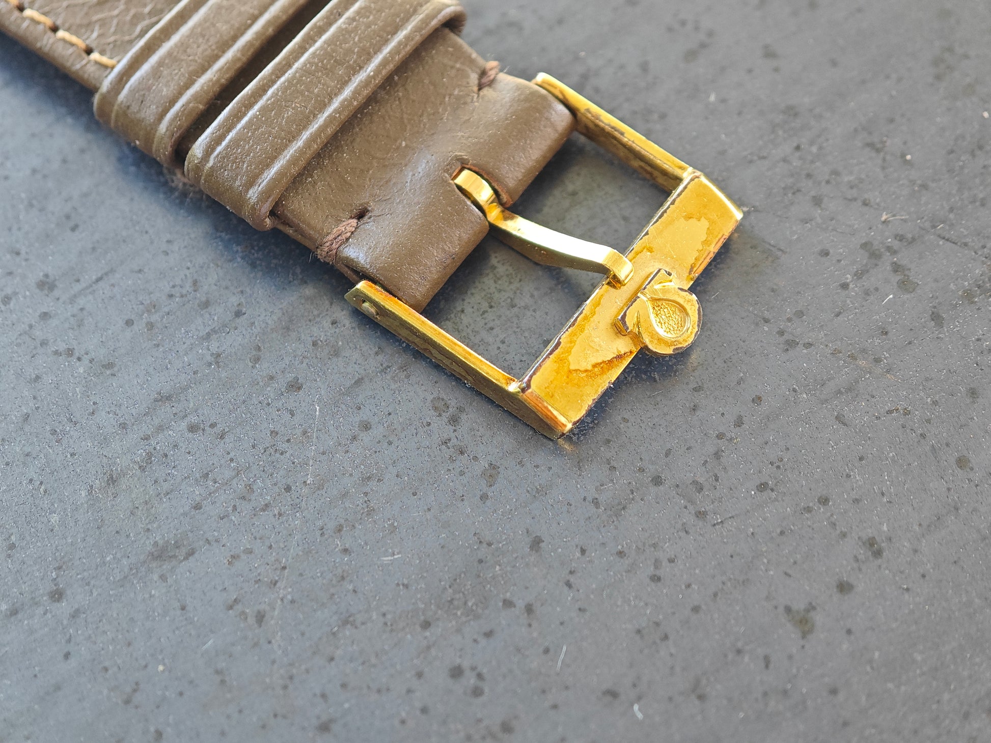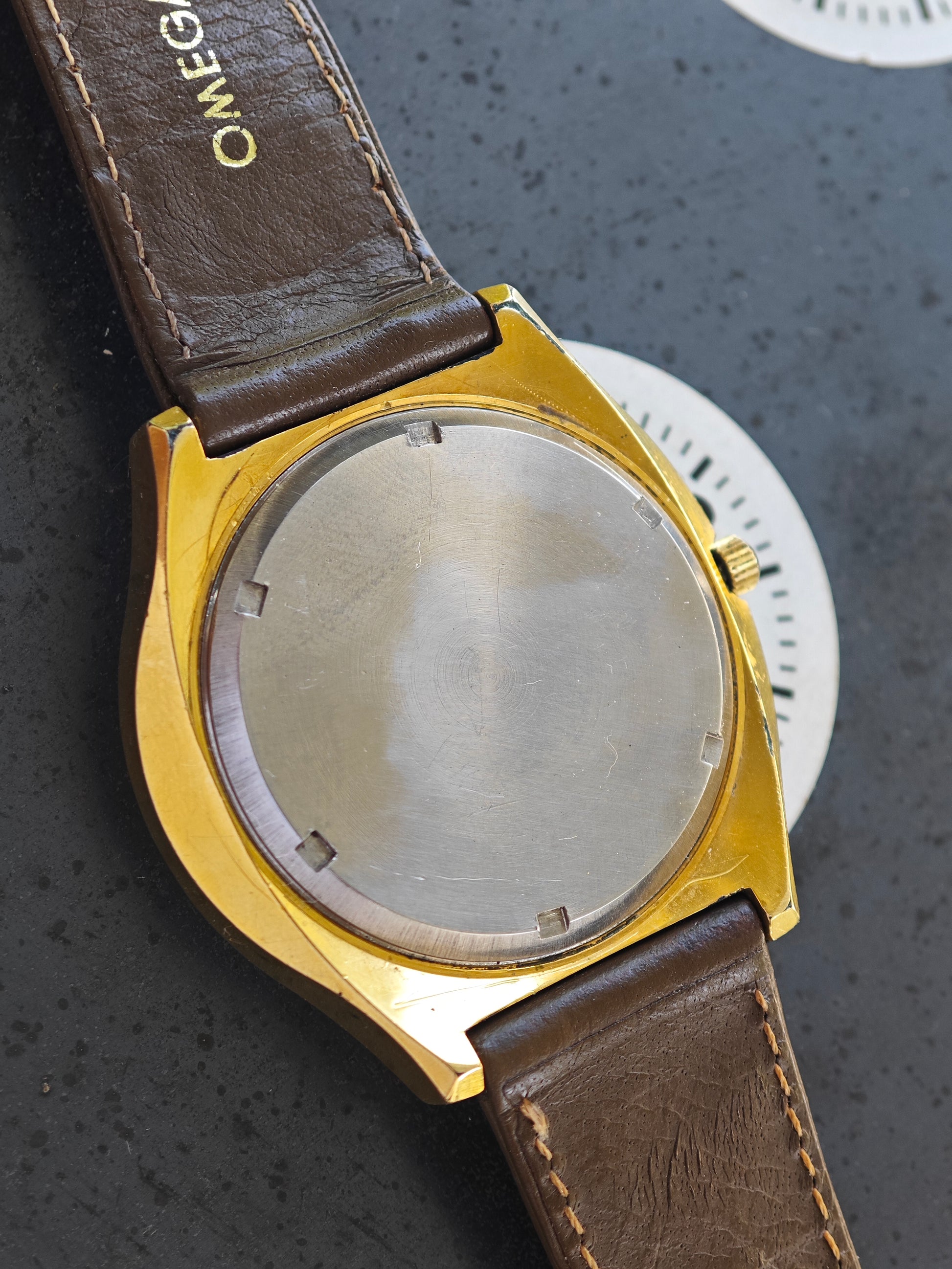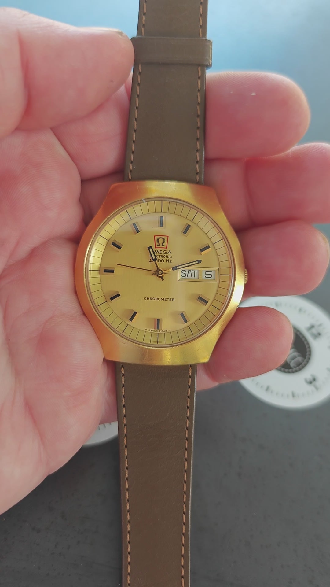 This OMEGA f300 Electronic has by far one of the Most beautiful dials by OMEGA. With fast/big indicators in the dial, the watch is really looking awesome. The watch comes on amits Unused and original OMEGA leather strap with gold plated buckle. The Strap was stored away during many years and looks great in combination with the gold plated Case. Original and perfect OMEGA crown - important AS Most gold plated crowns loose their OMEGA plating over time. Here a perfect example. Typical wear to Case but Overall very good conditions.