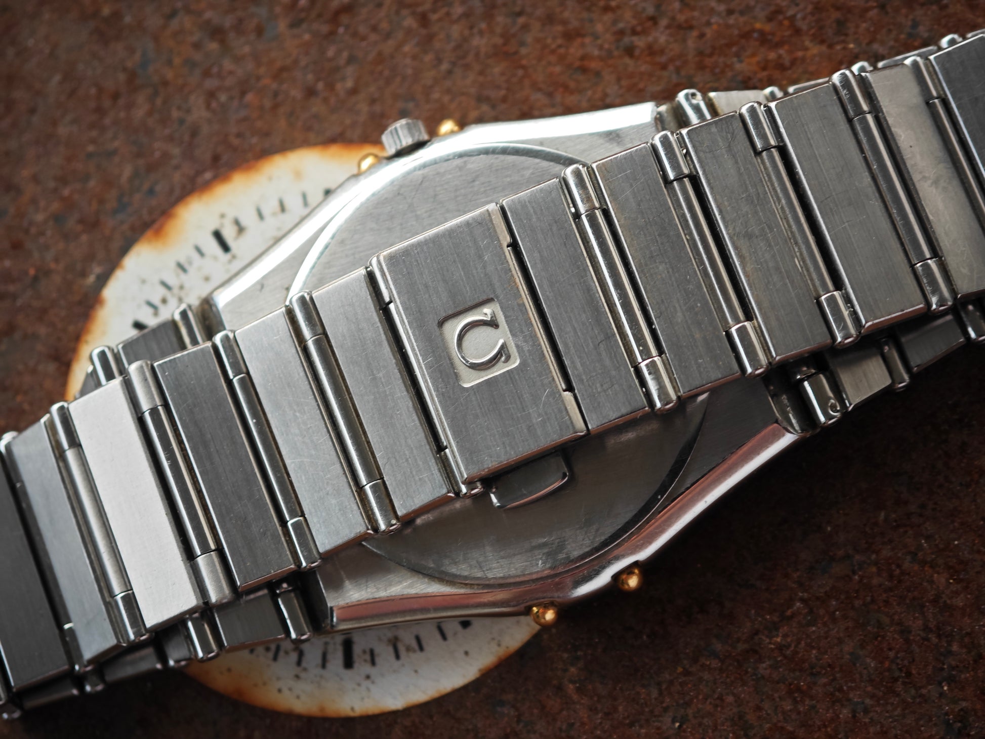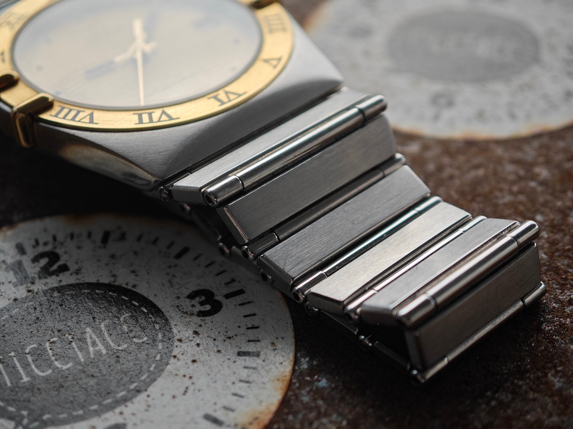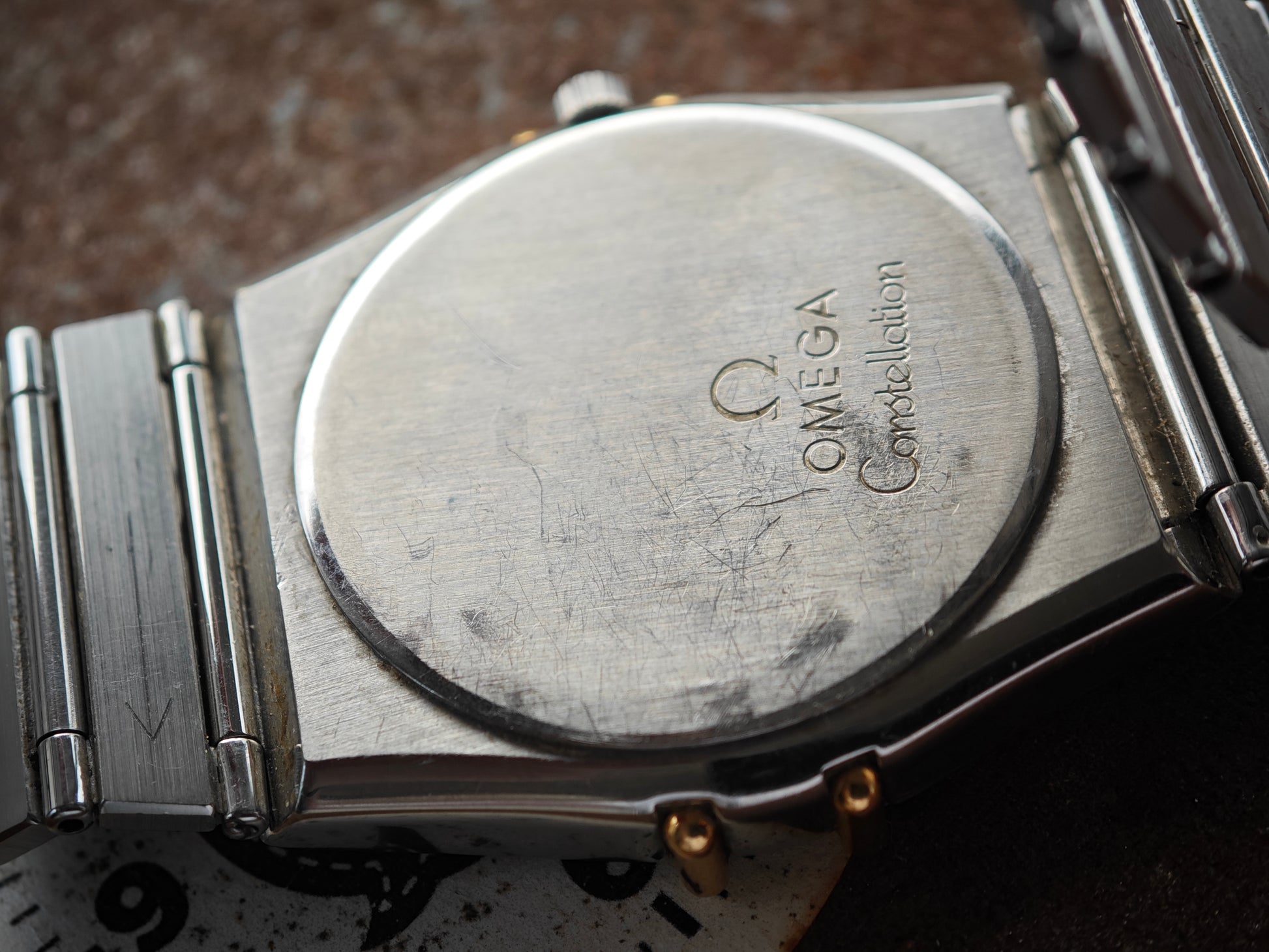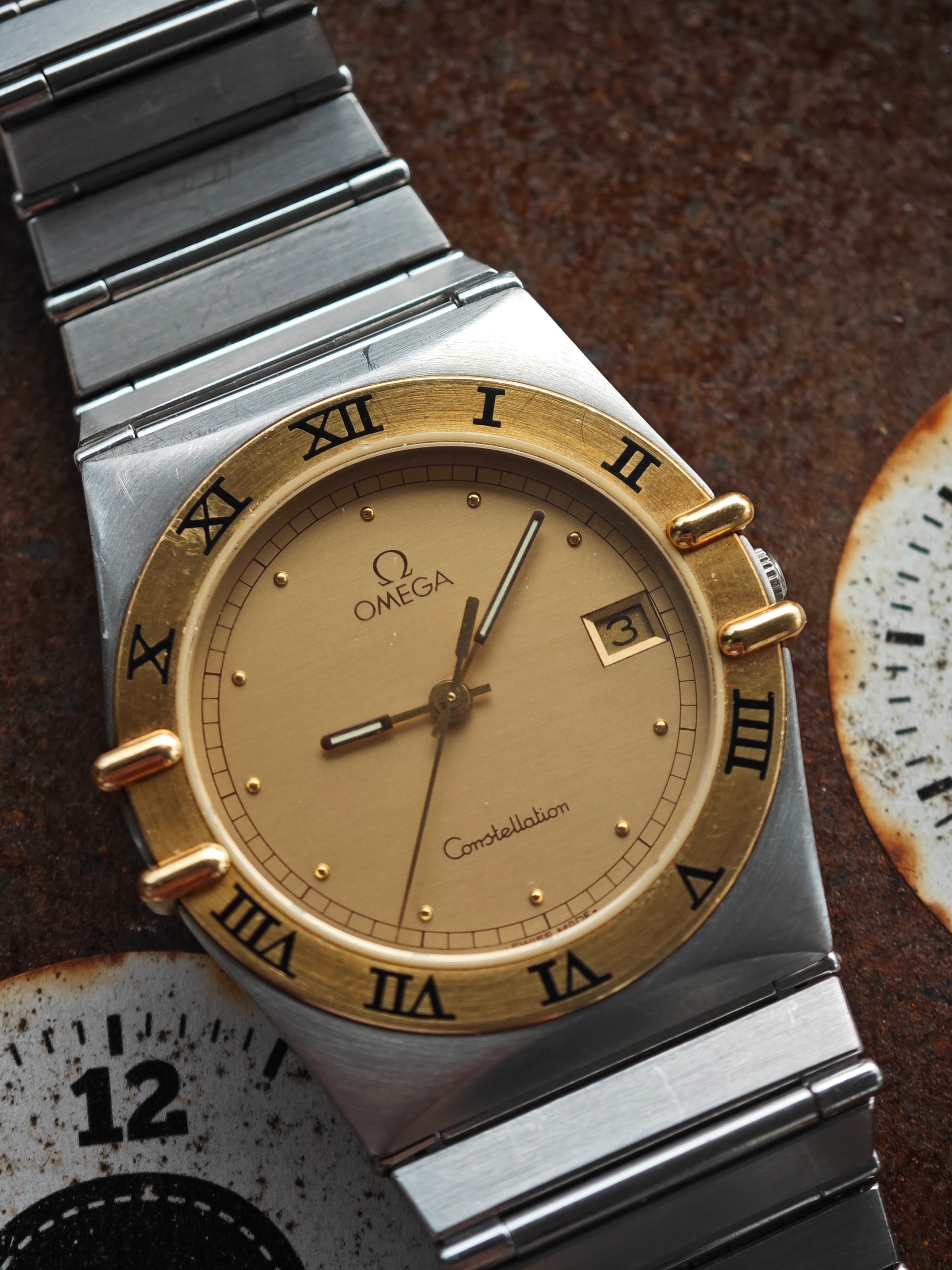 Very Clean OMEGA Constellation Bicolor with gold black accents. Watch comes on original bracelet in stainless steel. OMEGA logo still present in clasp. Very Clean dial and hands. The watch fits around 18,0 cm wrist size. We might have additional links. Please inquire upfront. Very clasical watch. In the rare 33mm mens Version.