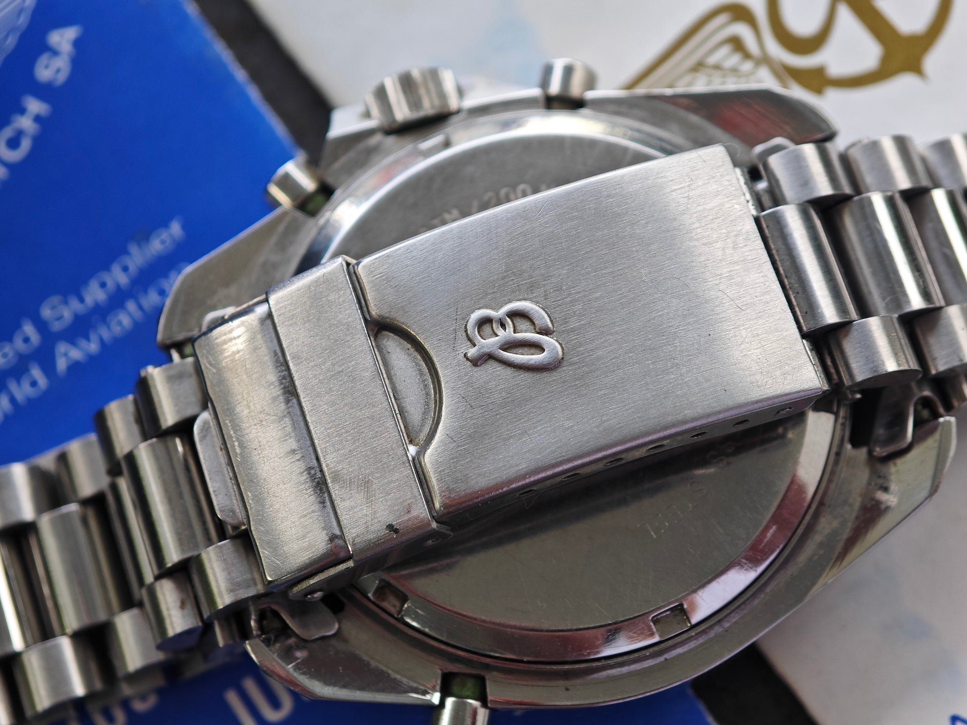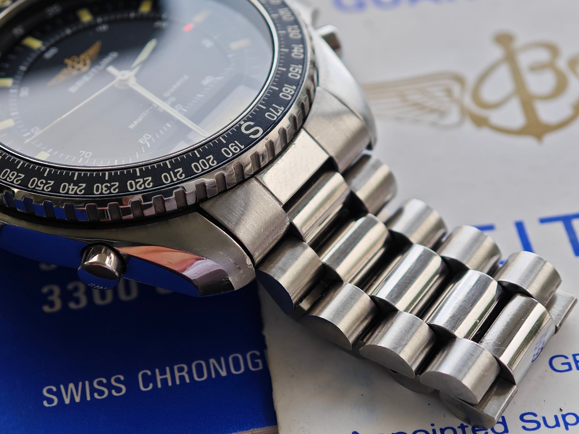 An outstanding Breitling Navitimer 80191 ( Pluton) in absolute TOP Conditions. The watchbis from 1989 and is an very Early 4 Digits series. So one of the very First watches Made. The watch was never polished. Onl tiny wear to clasp and Case Back. The original brush and polish in Case and bracelet have been never worked Up. You even can See still the brushed and polished sections at the original president bracelet. Wrist size is approx.19,0 cm - we have additional links in srock. Please inquire. The watch comes as Full Set with Box ( No watch holder and some wear inside) AS Well as Manual and warranty papers from 1989. These Sets are extremly desired and ultra hard ro find.